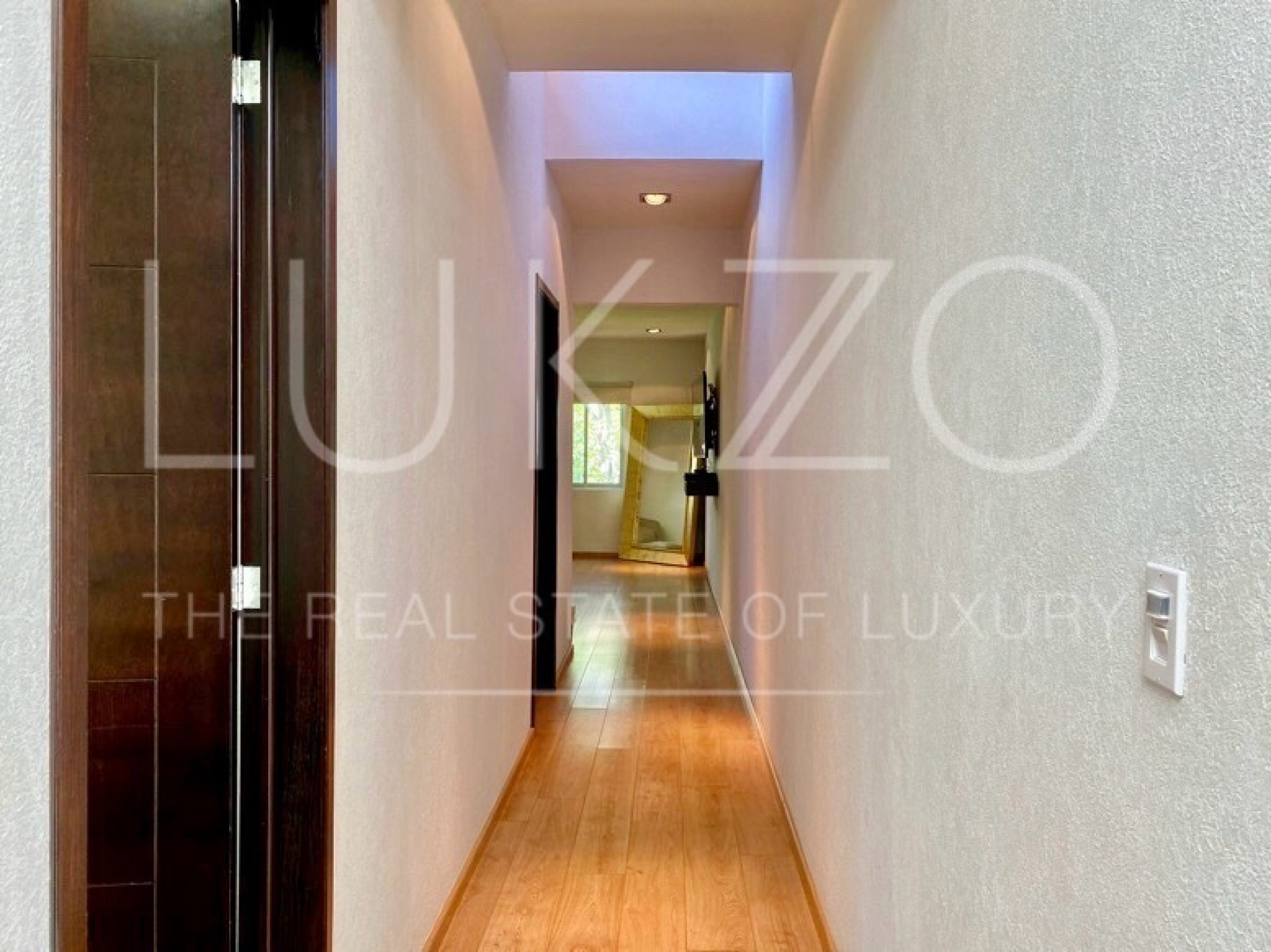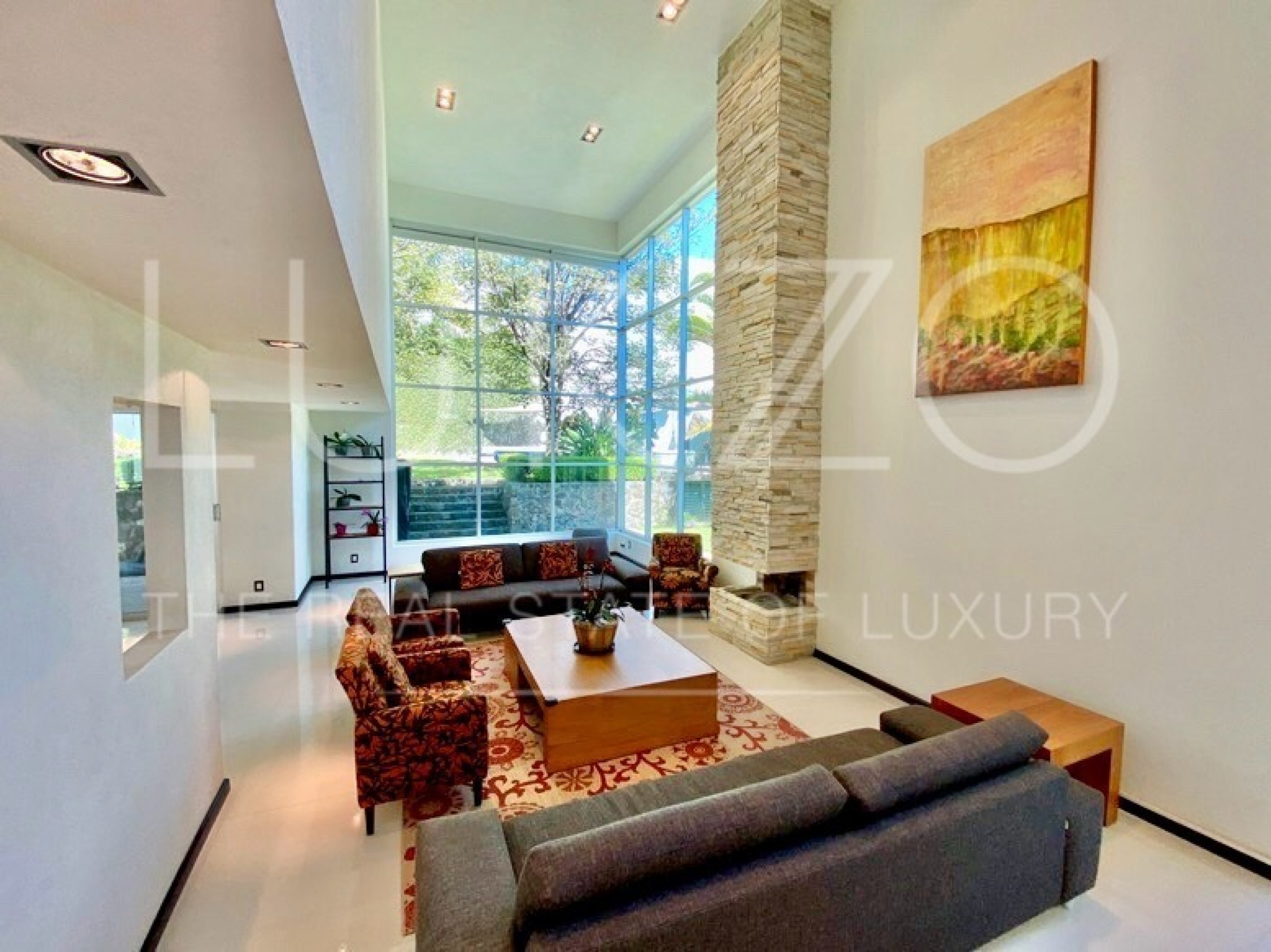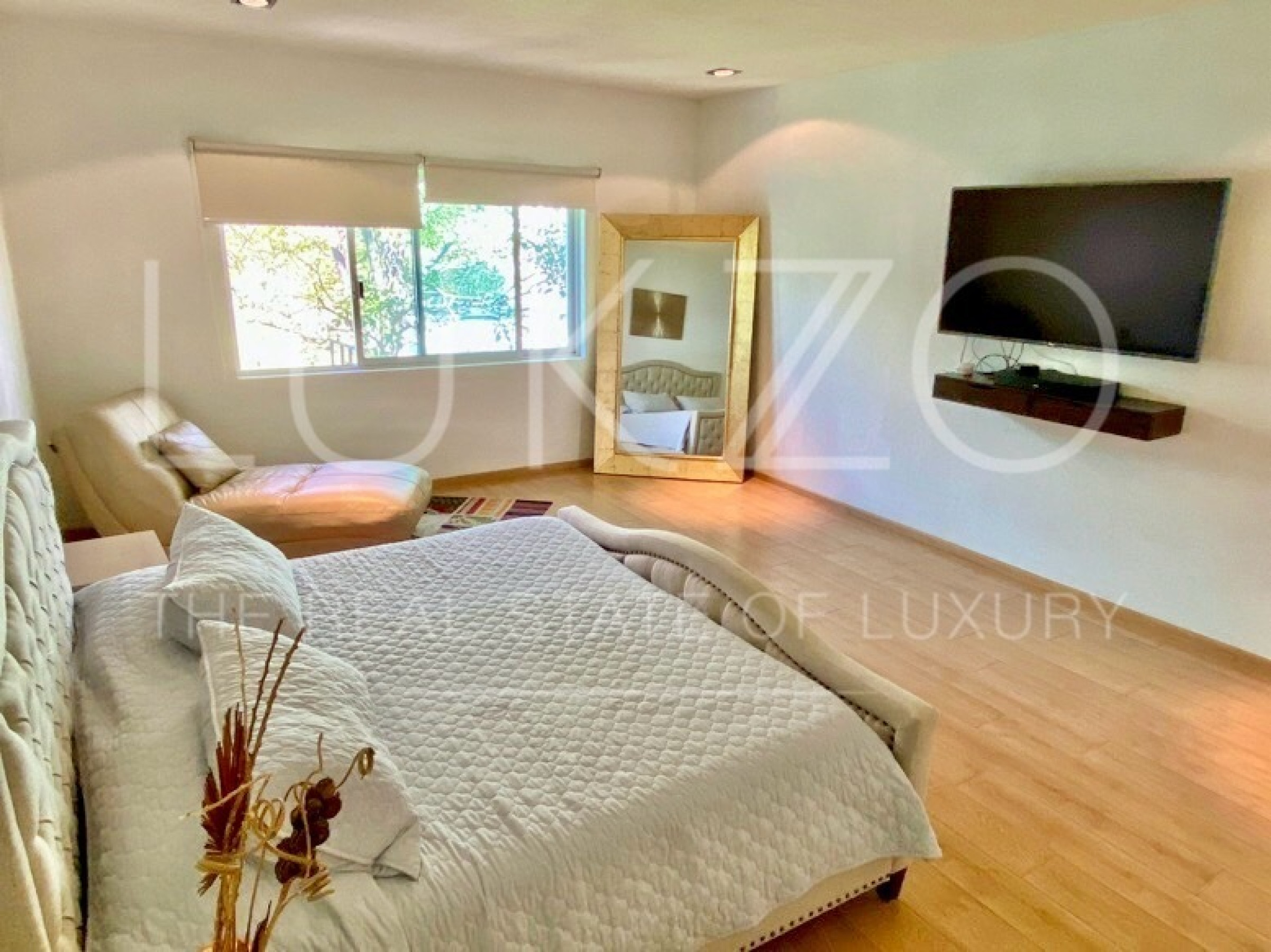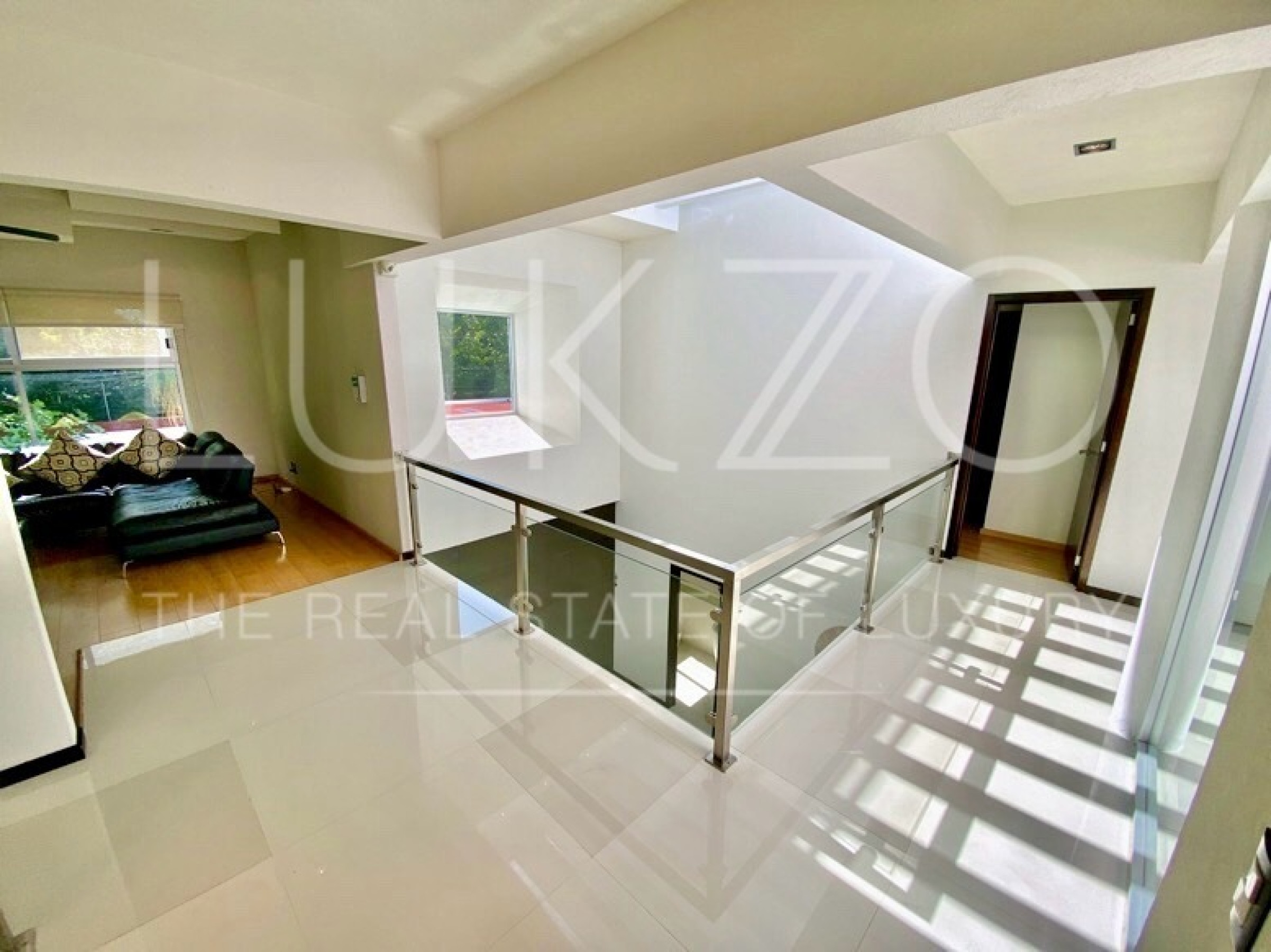 Entrando por el recibidor de doble altura tenemos, al frente, un pequeño jardín interior y acceso a una recámara con baño y closet, el estudio, baño de visitas y la escalera que nos lleva a la planta alta con cuarto de TV y 3 recámaras más, con baño y clóset. La principal cuenta con vestidor, aire acondicionado y tina de hidromasaje.