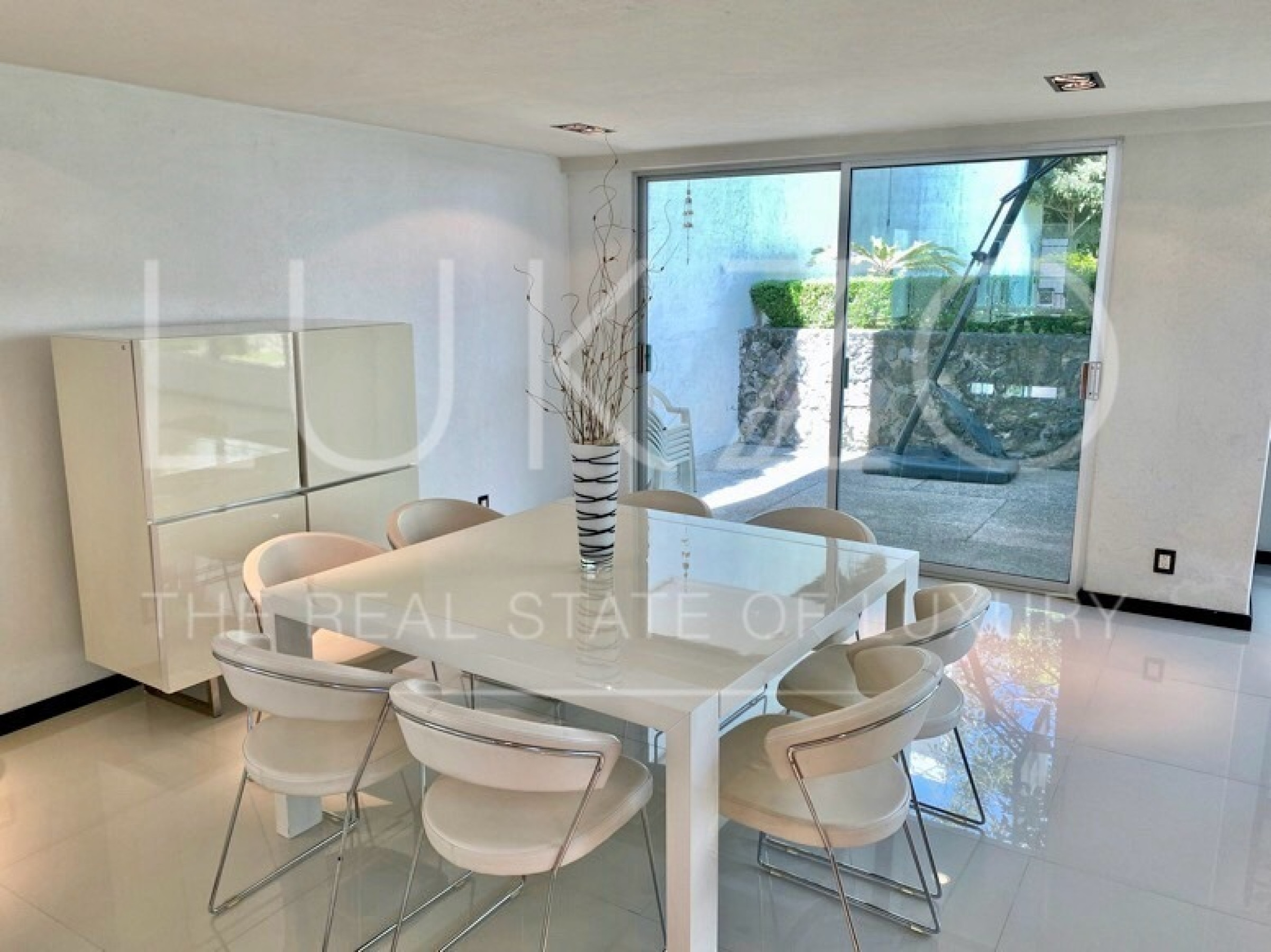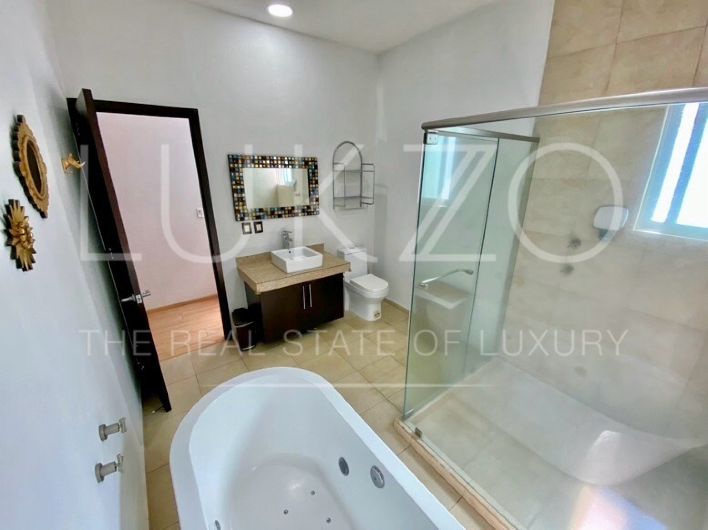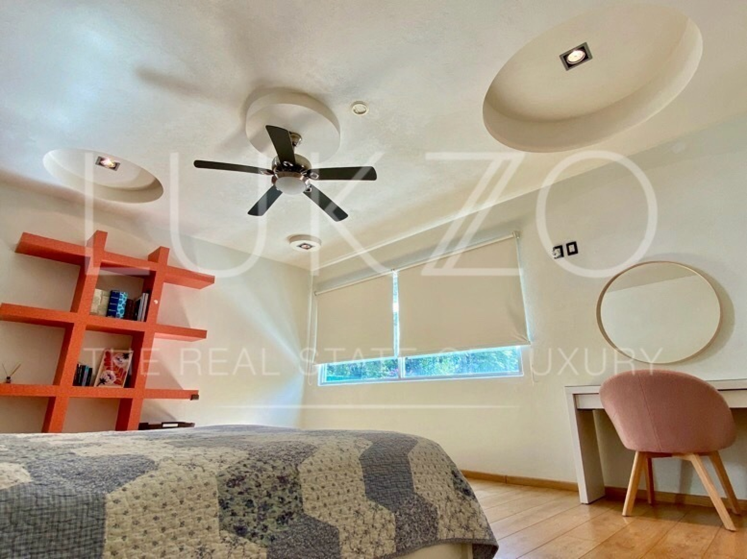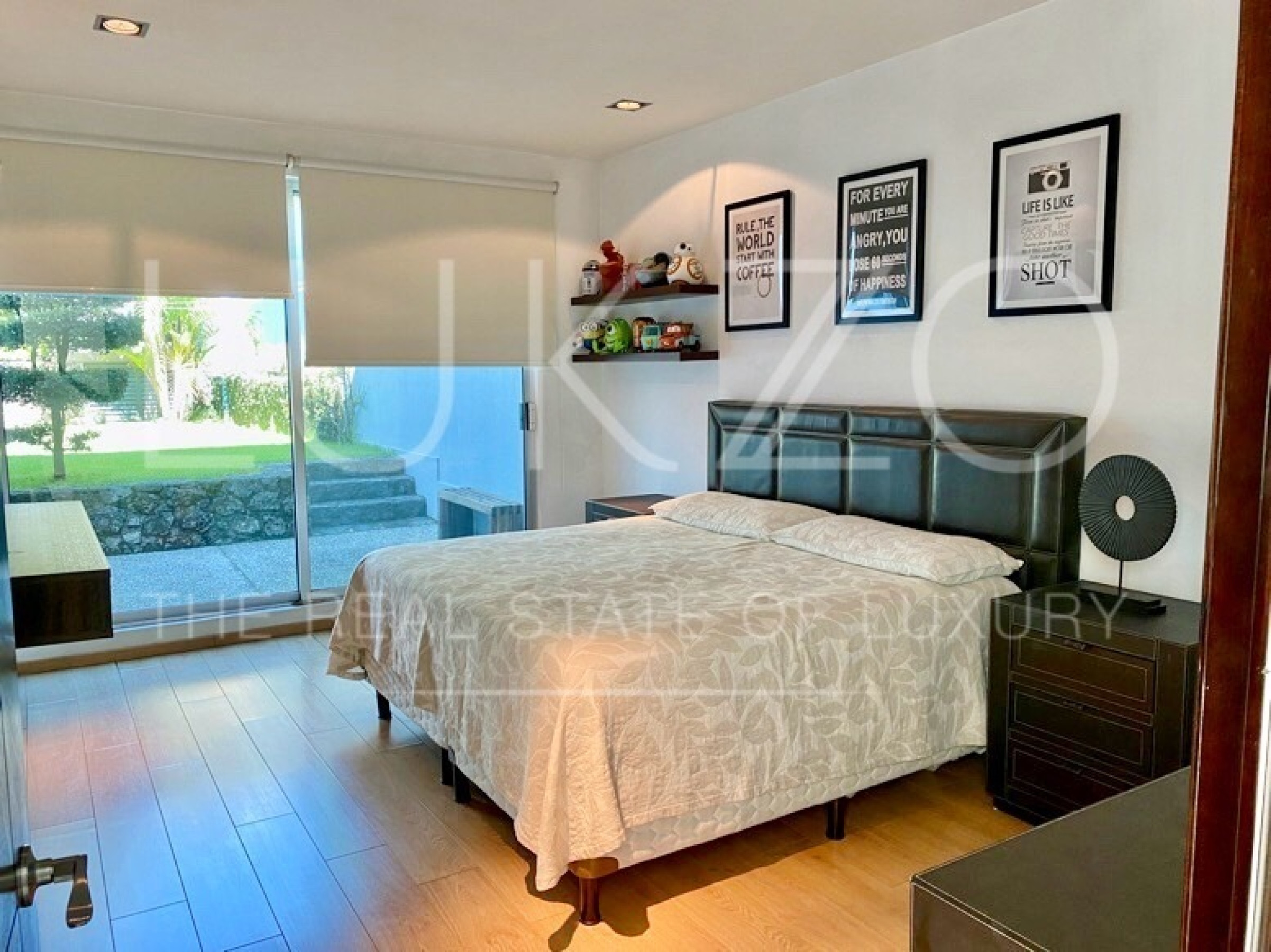 Entrando por el recibidor de doble altura tenemos, al frente, un pequeño jardín interior y acceso a una recámara con baño y closet, el estudio, baño de visitas y la escalera que nos lleva a la planta alta con cuarto de TV y 3 recámaras más, con baño y clóset. La principal cuenta con vestidor, aire acondicionado y tina de hidromasaje.