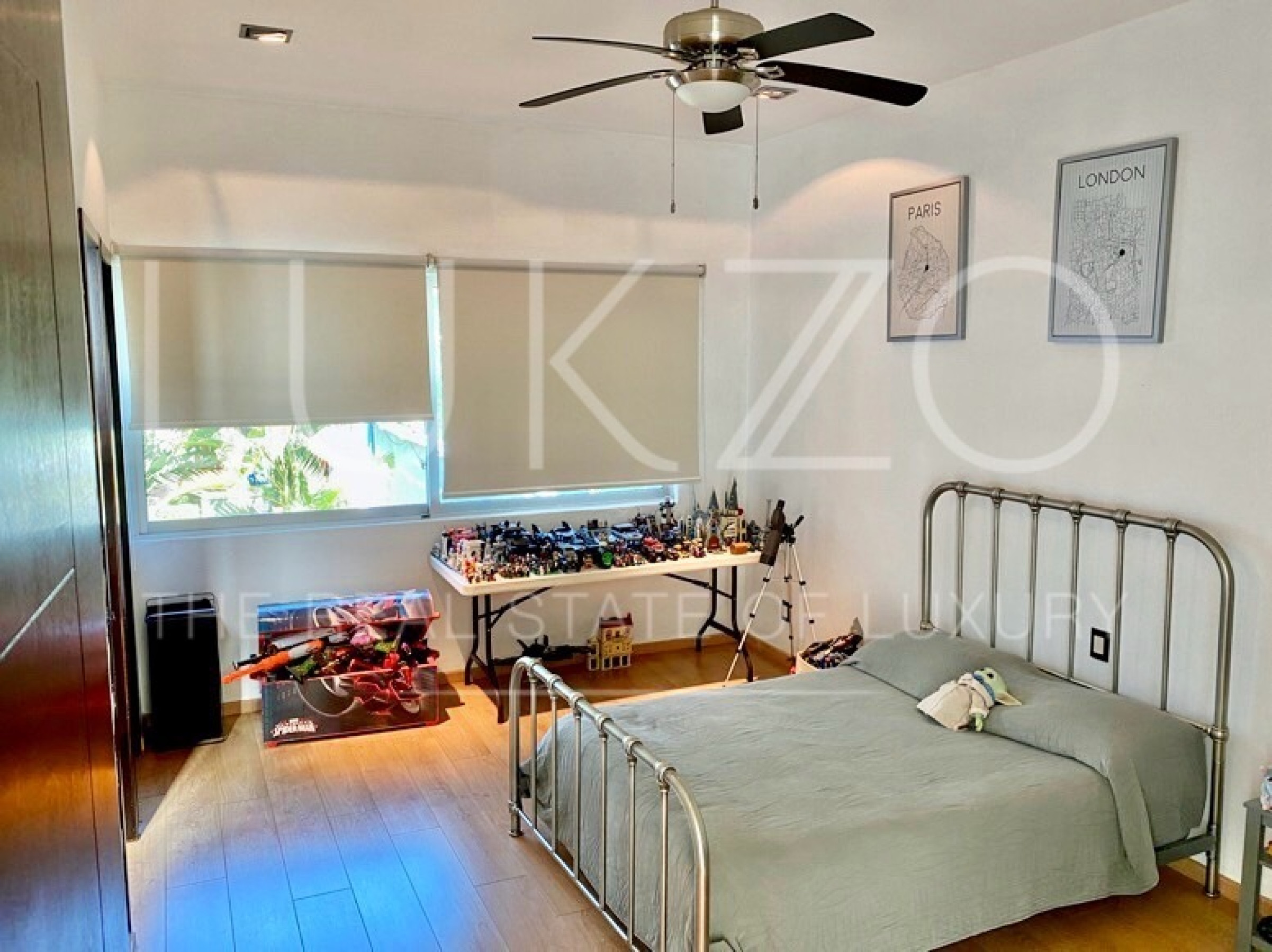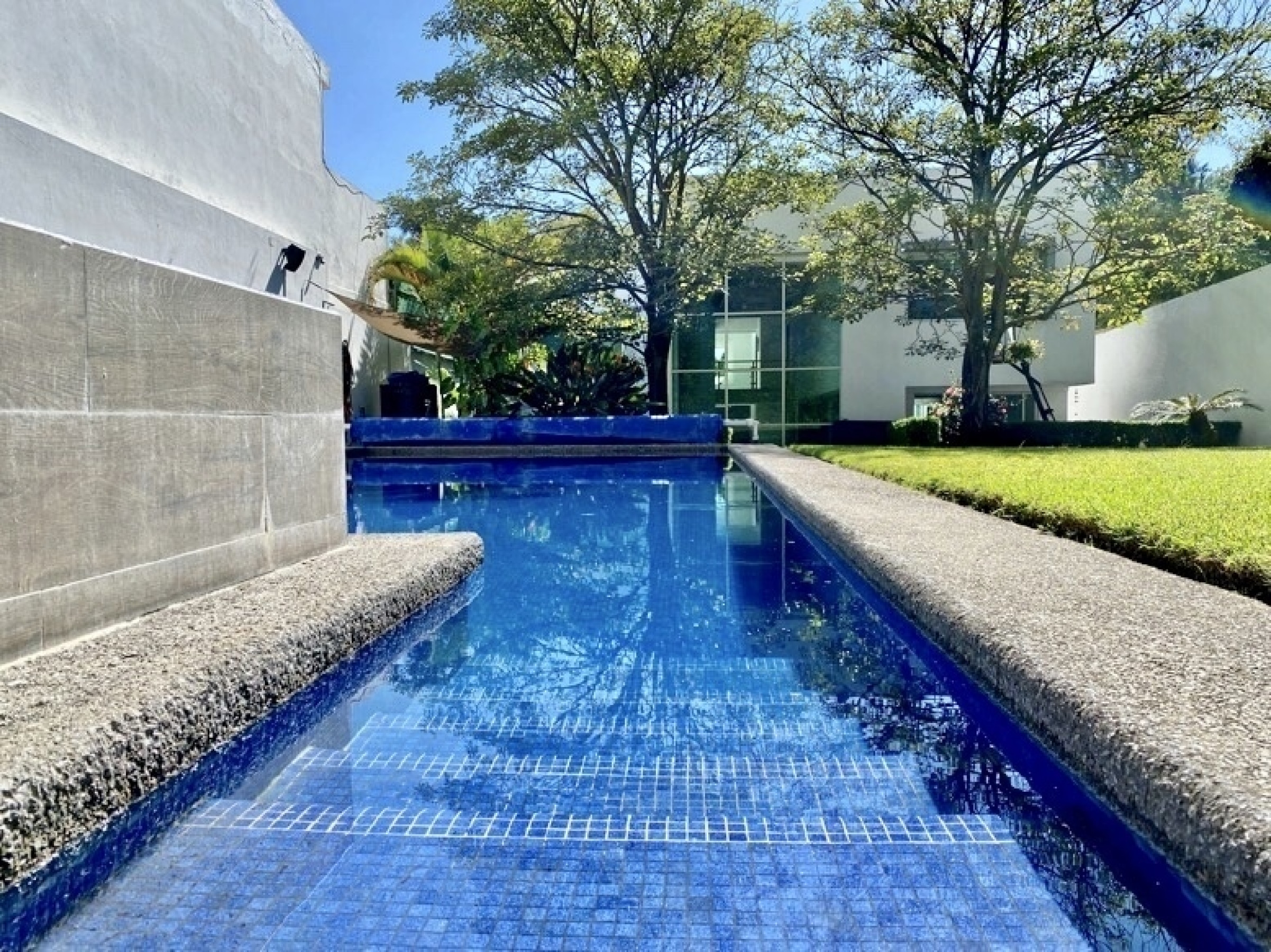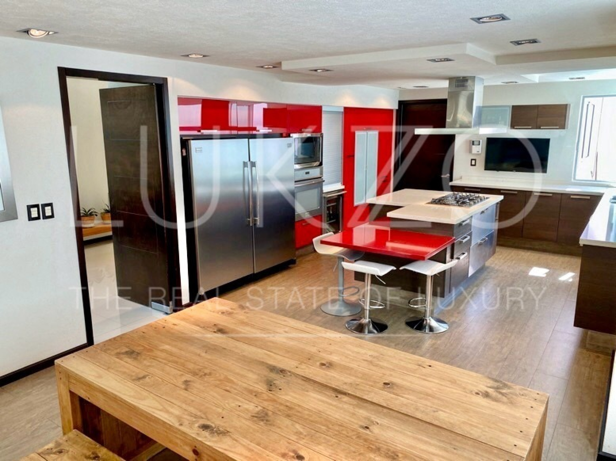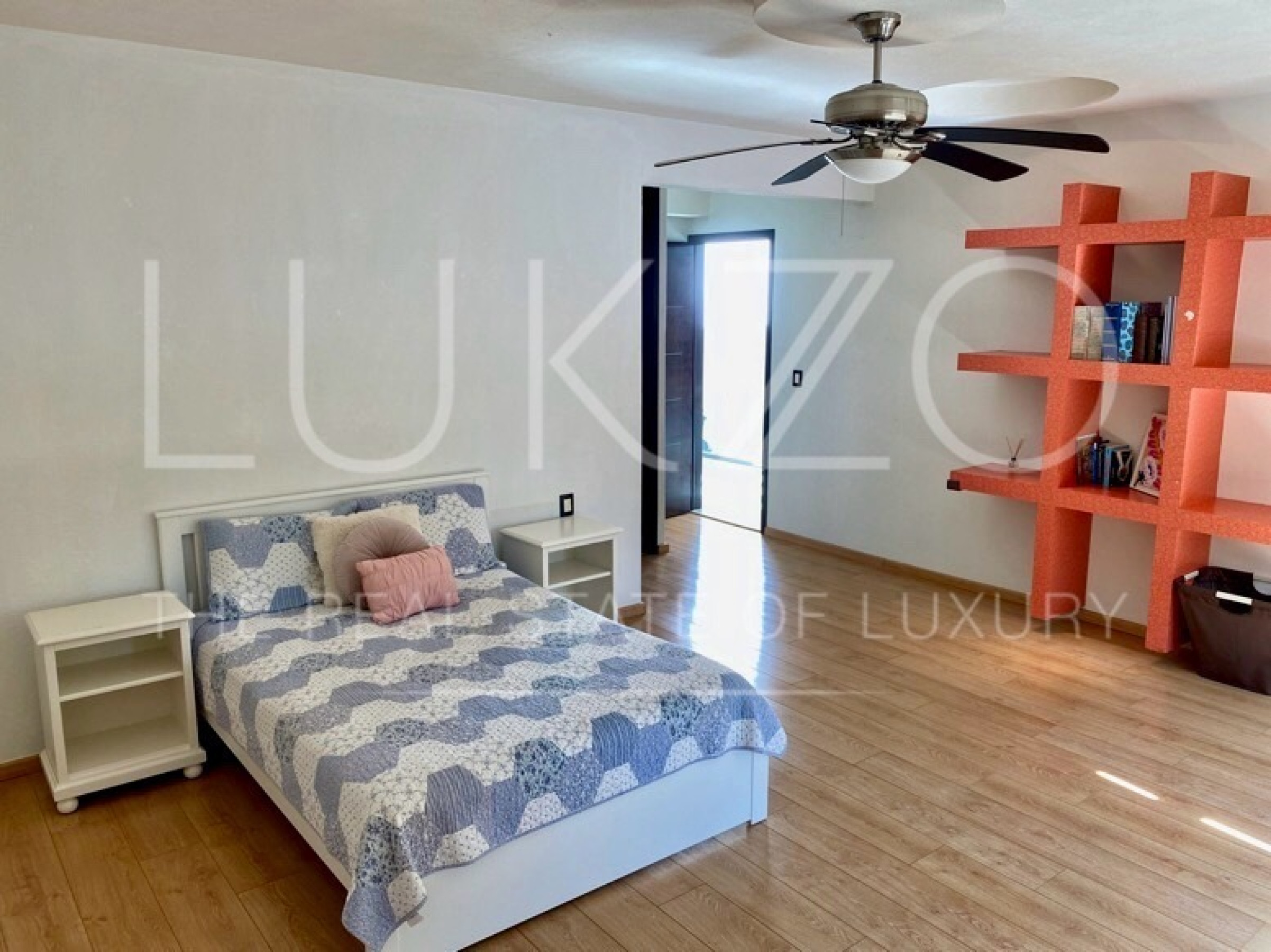Entrando por el recibidor de doble altura tenemos, al frente, un pequeño jardín interior y acceso a una recámara con baño y closet, el estudio, baño de visitas y la escalera que nos lleva a la planta alta con cuarto de TV y 3 recámaras más, con baño y clóset. La principal cuenta con vestidor, aire acondicionado y tina de hidromasaje.