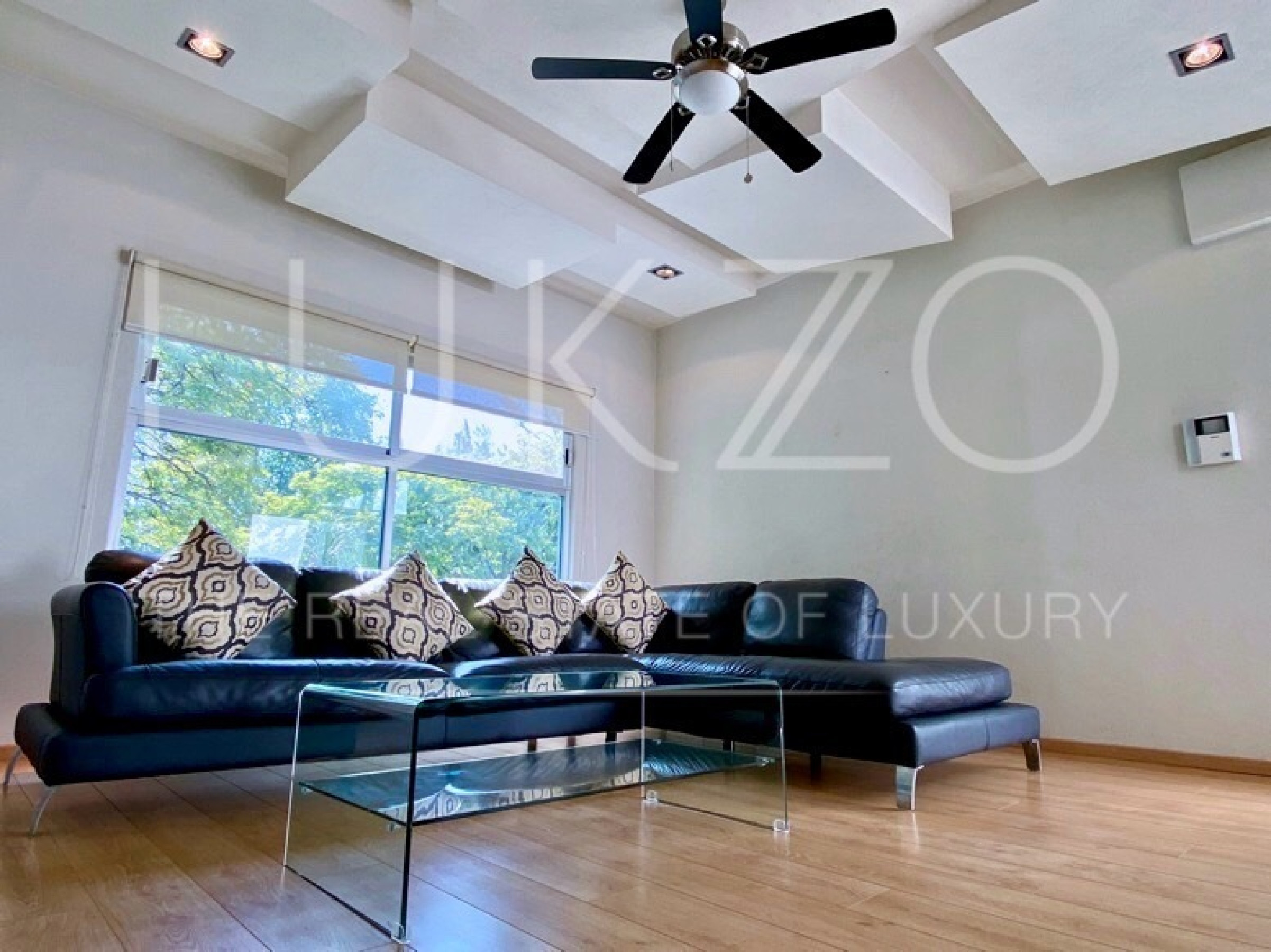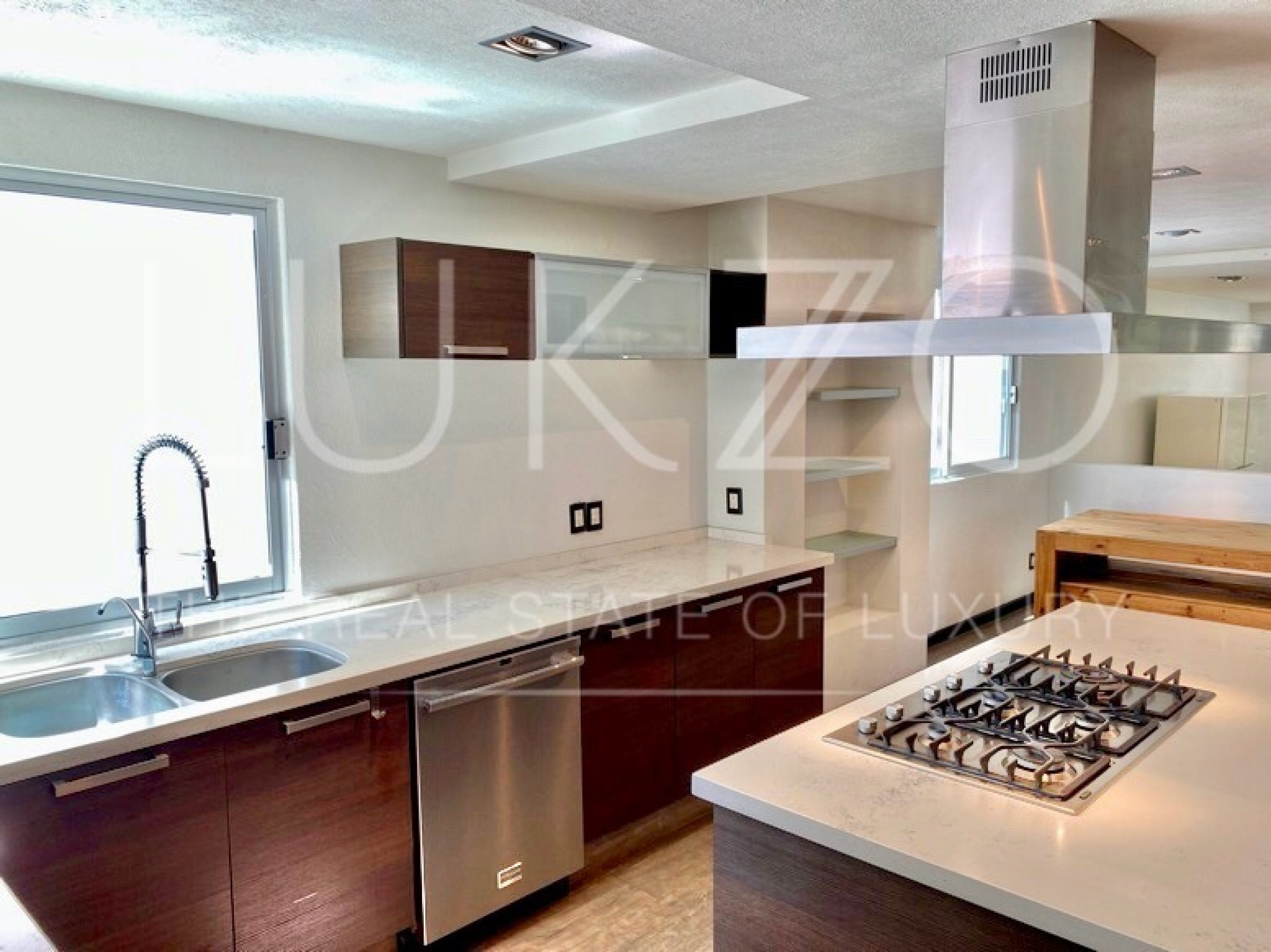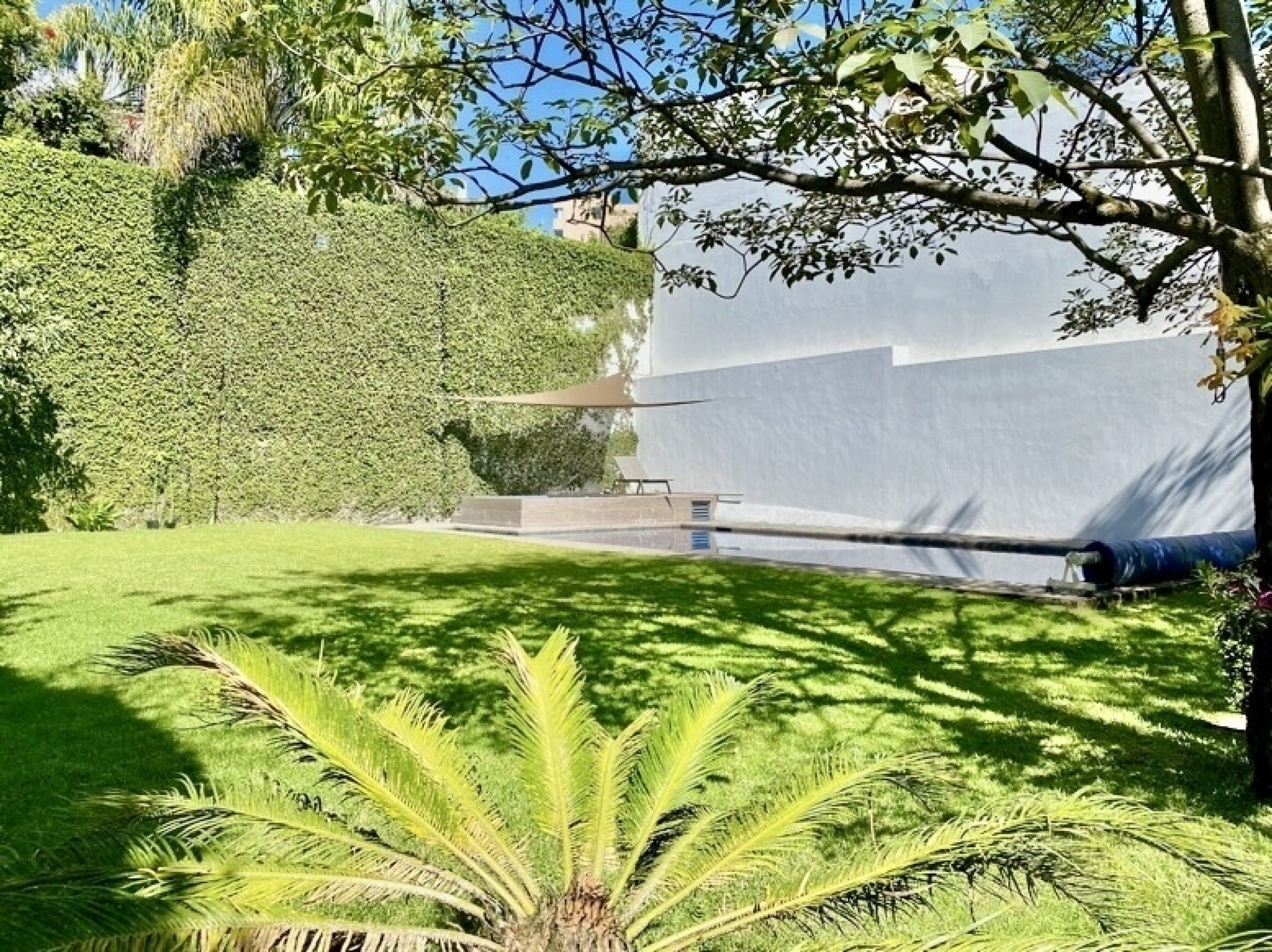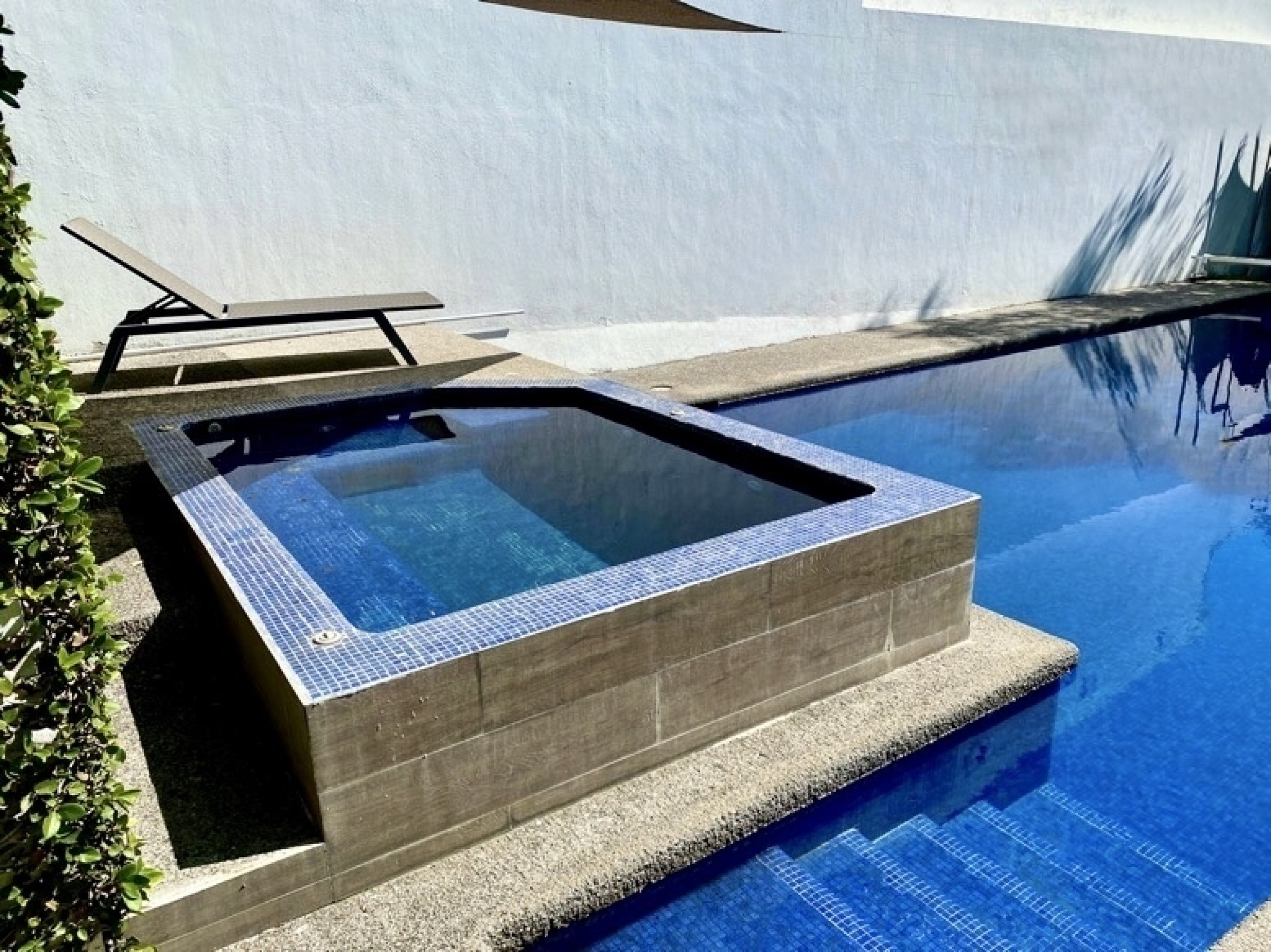 Entrando por el recibidor de doble altura tenemos, al frente, un pequeño jardín interior y acceso a una recámara con baño y closet, el estudio, baño de visitas y la escalera que nos lleva a la planta alta con cuarto de TV y 3 recámaras más, con baño y clóset. La principal cuenta con vestidor, aire acondicionado y tina de hidromasaje.