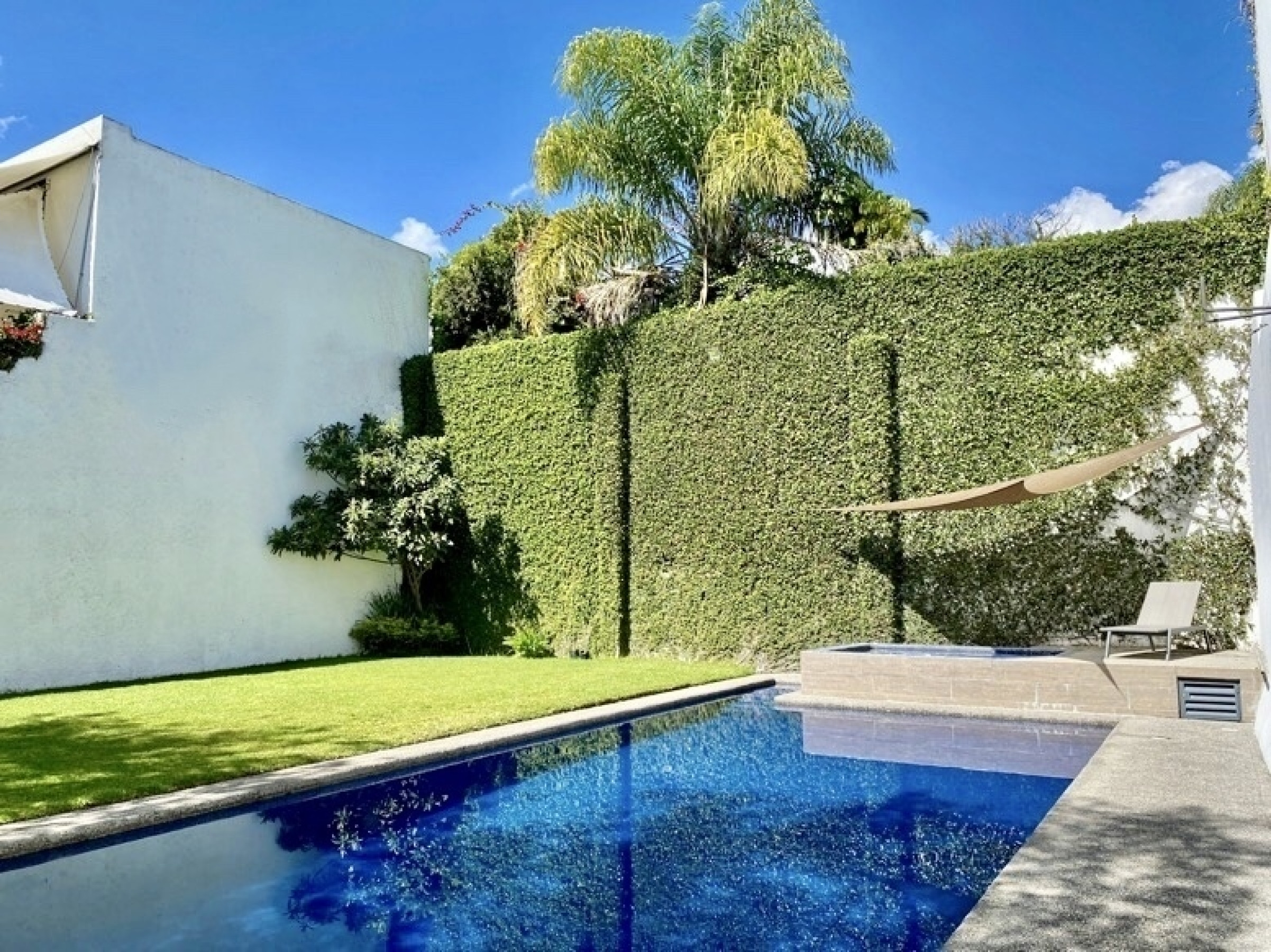 La casa cuenta con una espectacular sala de doble altura con chimenea y vista al jardín. Desde la sala se accede al comedor y a la cocina en isla, totalmente equipada. Además, el jardín cuenta con alberca y jacuzzi para disfrutar momentos de relax y diversión. La propiedad está protegida por un sistema de alarma con cerca electrificada, cámaras de seguridad y videoportero.