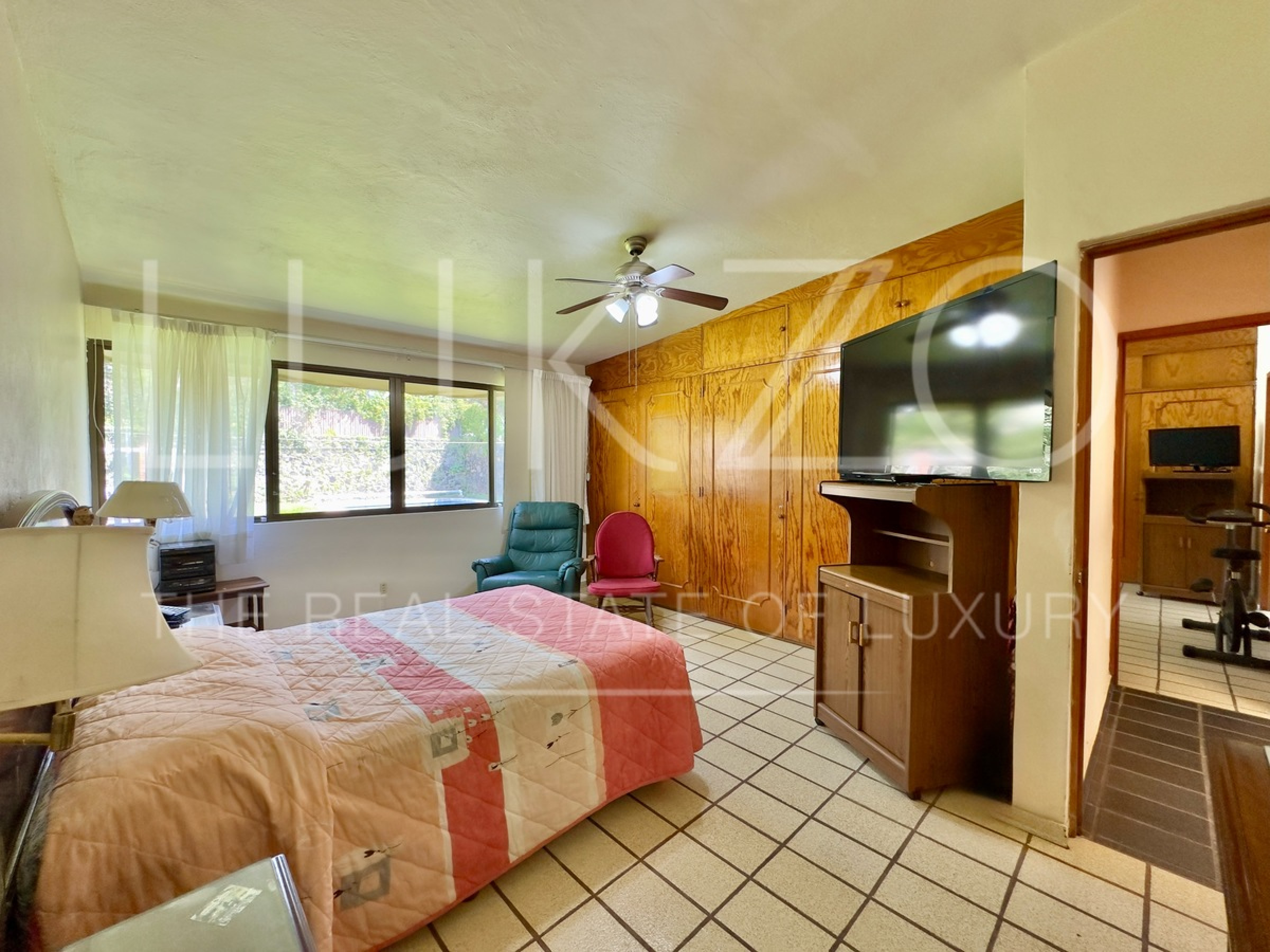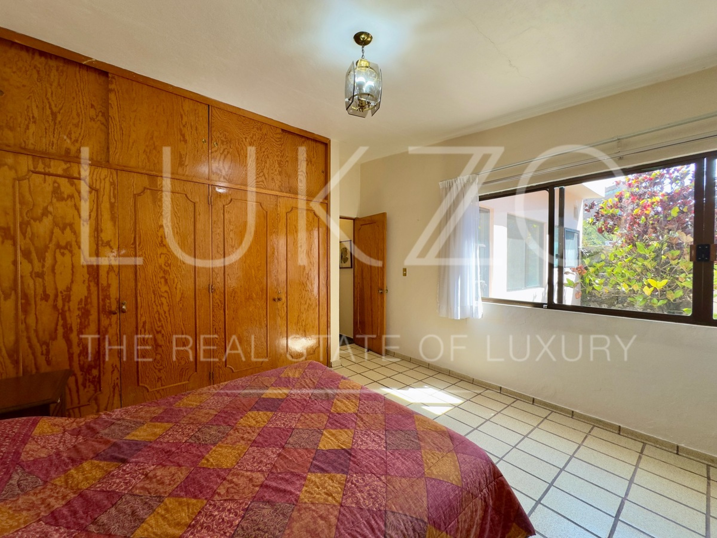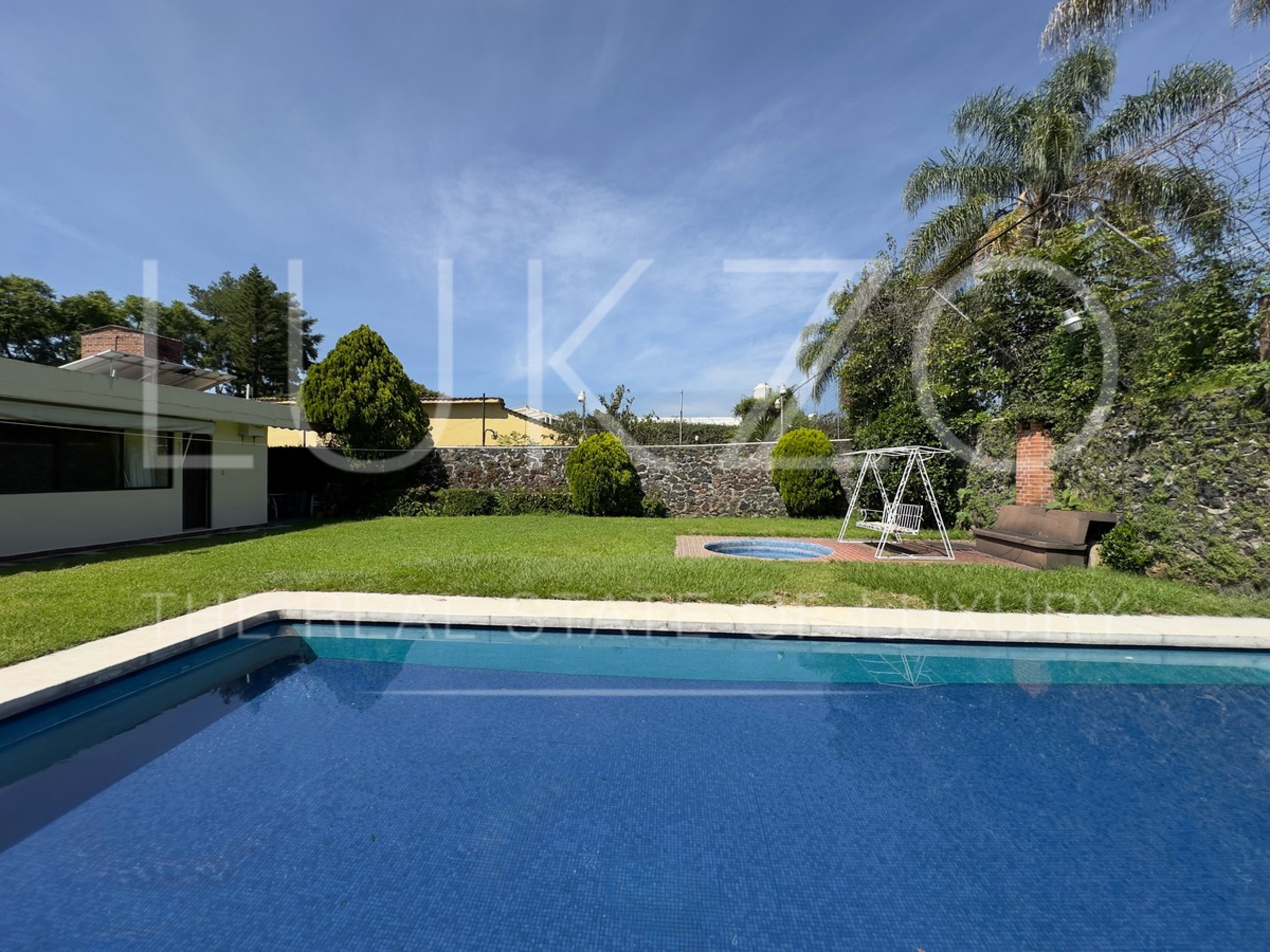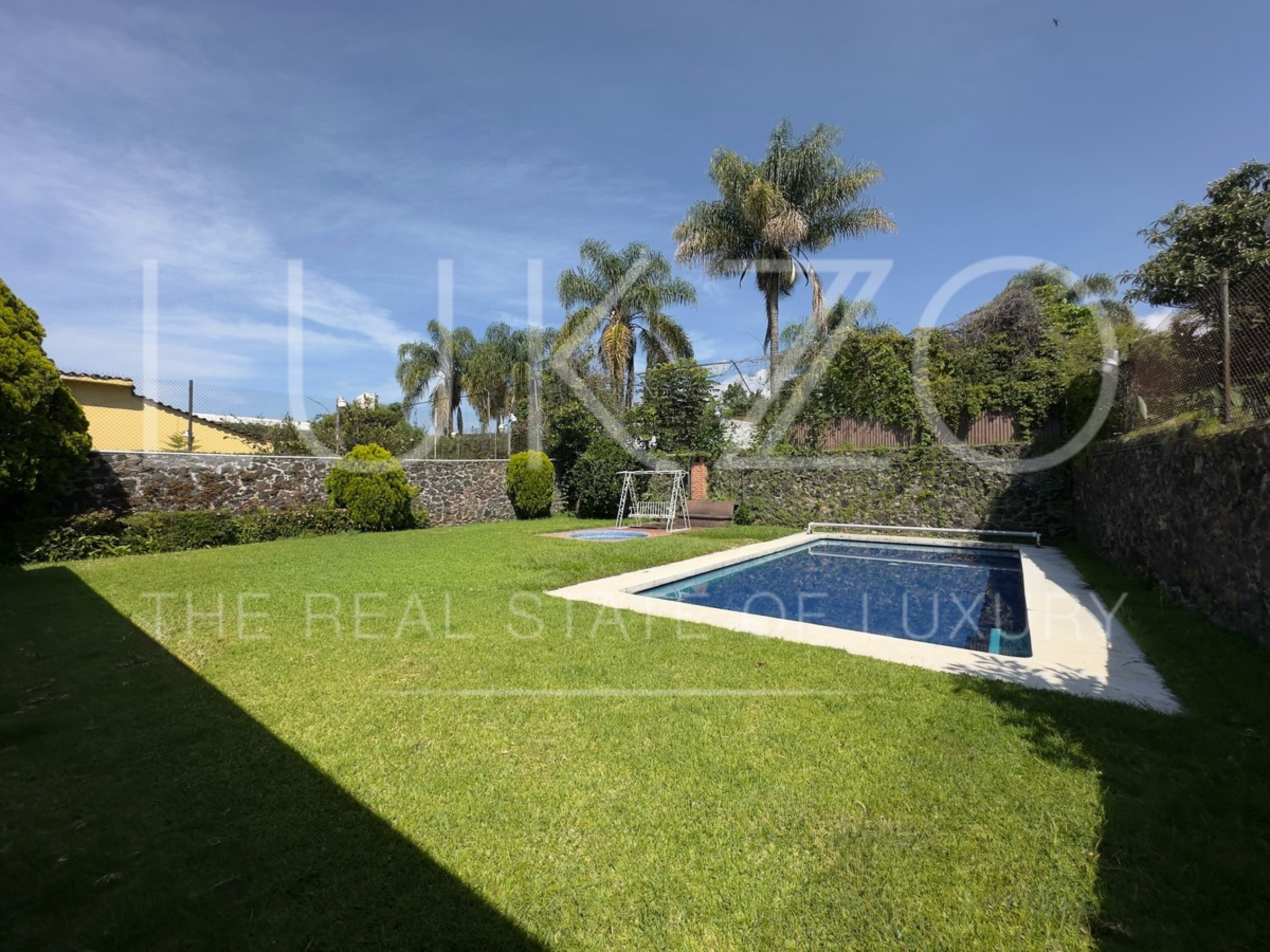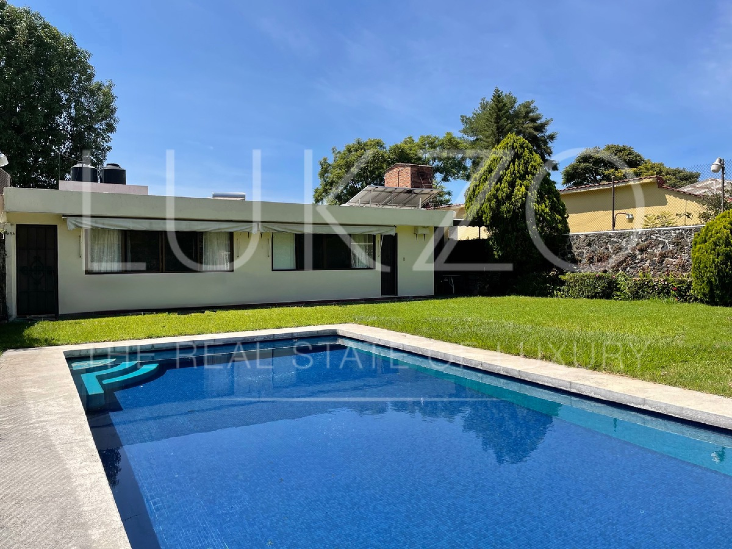 En la zona de norte de Cuernavaca, Morelos, se encuentra esta residencia de estilo conservador que ofrece comodidad y amplitud en sus 602 m² de terreno y 313 m² de construcción distribuidos en un solo nivel. En buen estado de conservación, cuenta con sala y comedor, un acogedor antecomedor integrado a la cocina equipada y tres recámaras, cada una con su baño, además de medio baño adicional. Se complementa con closets, alacena, closet de blancos, cuarto de TV, lavandería, bodega y dos bungalows con baño. En el exterior, destaca un amplio jardín con sistema de riego por aspersión, alberca, jacuzzi, terraza y estacionamiento para tres autos. La casa está equipada con cisterna de 10 000 litros, gas estacionario, portón eléctrico y paneles solares fotovoltaicos que aportan eficiencia y sustentabilidad, además de contar con agua potable y admitir mascotas.