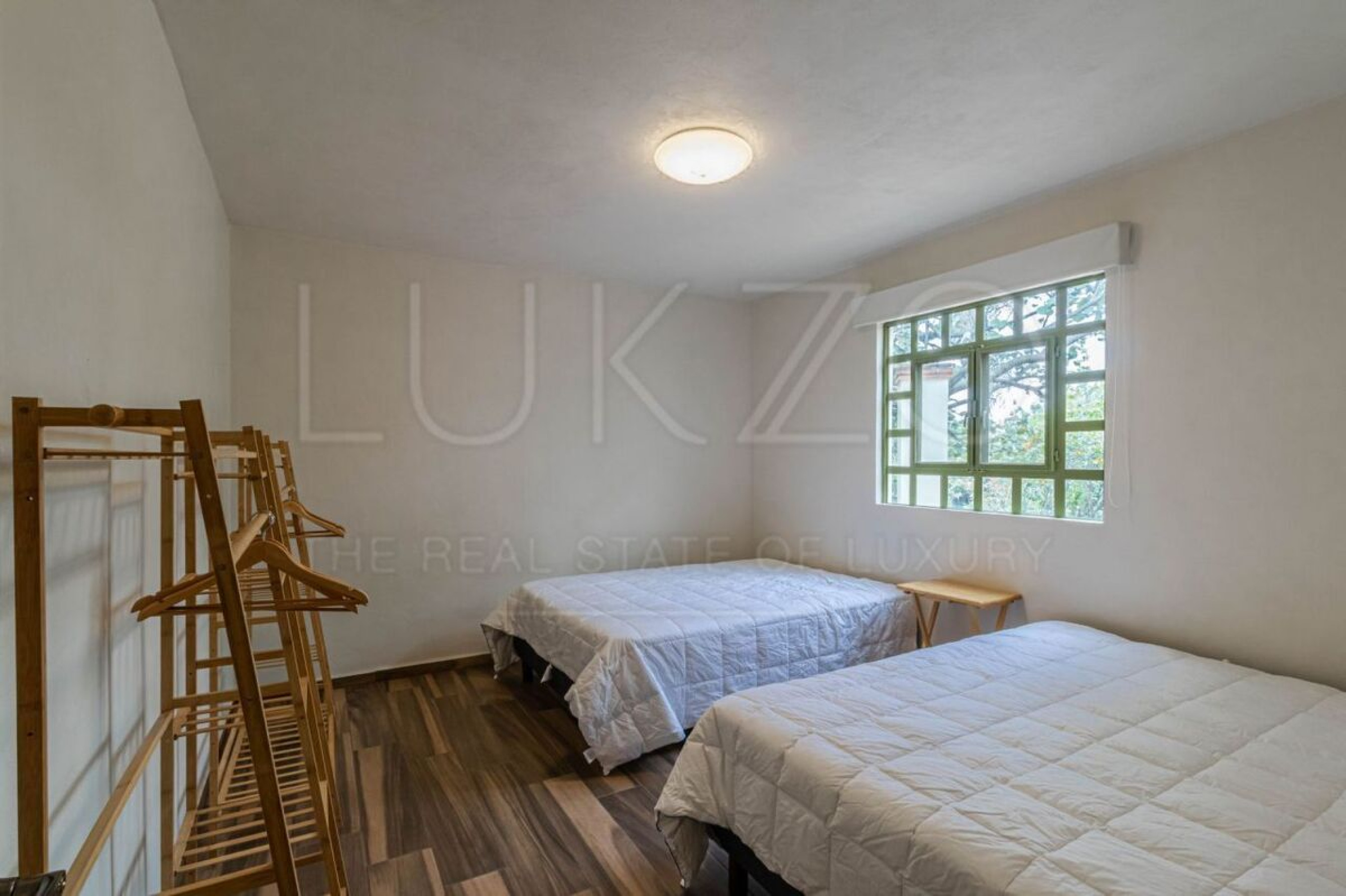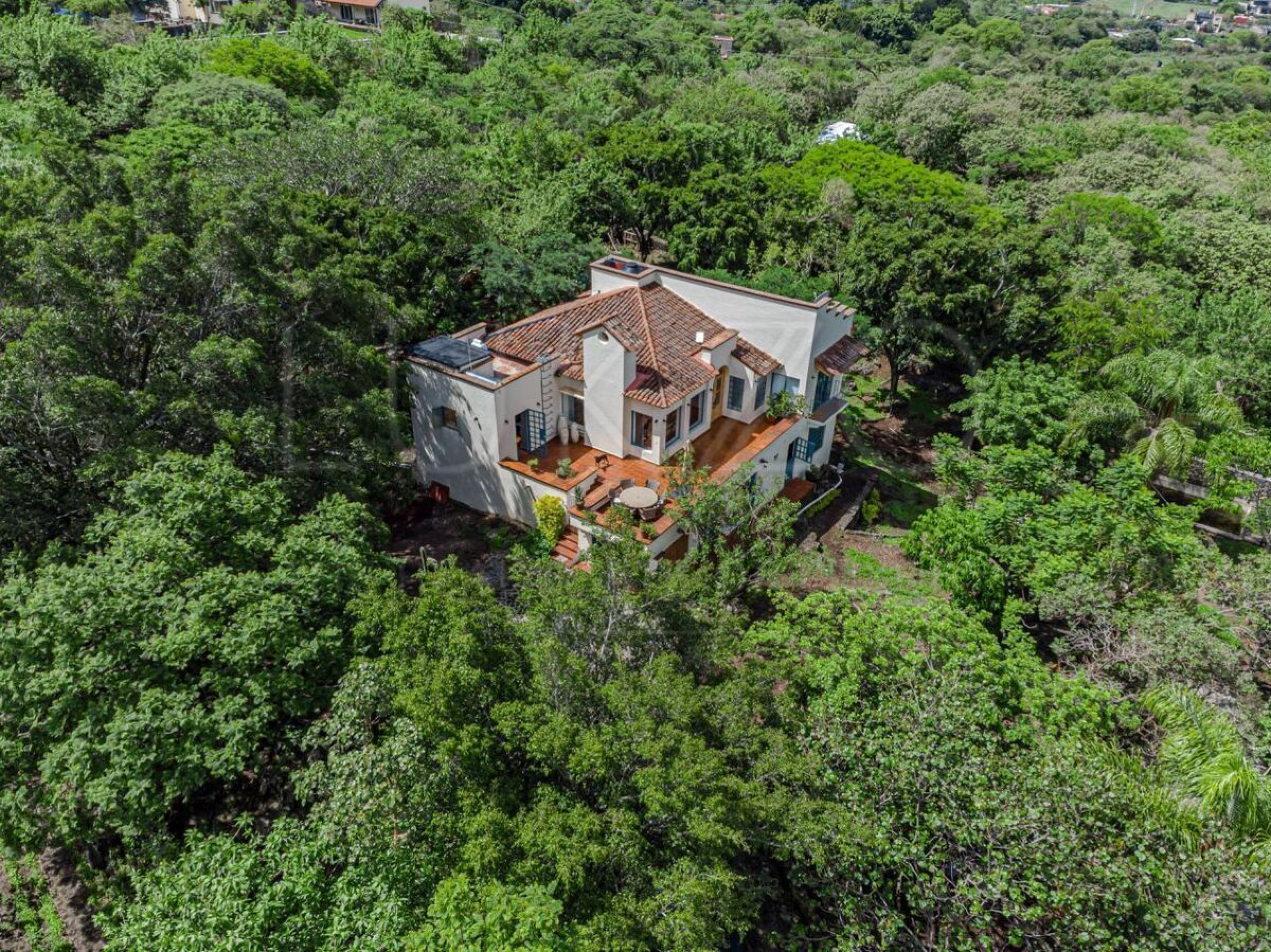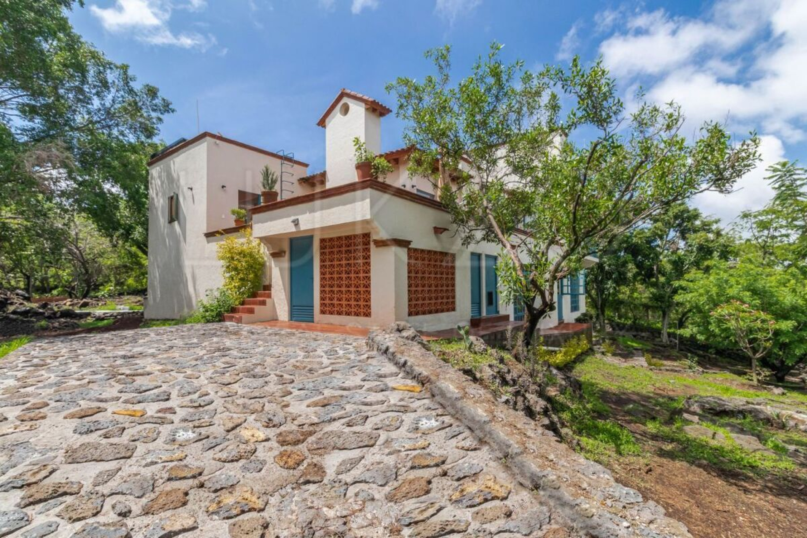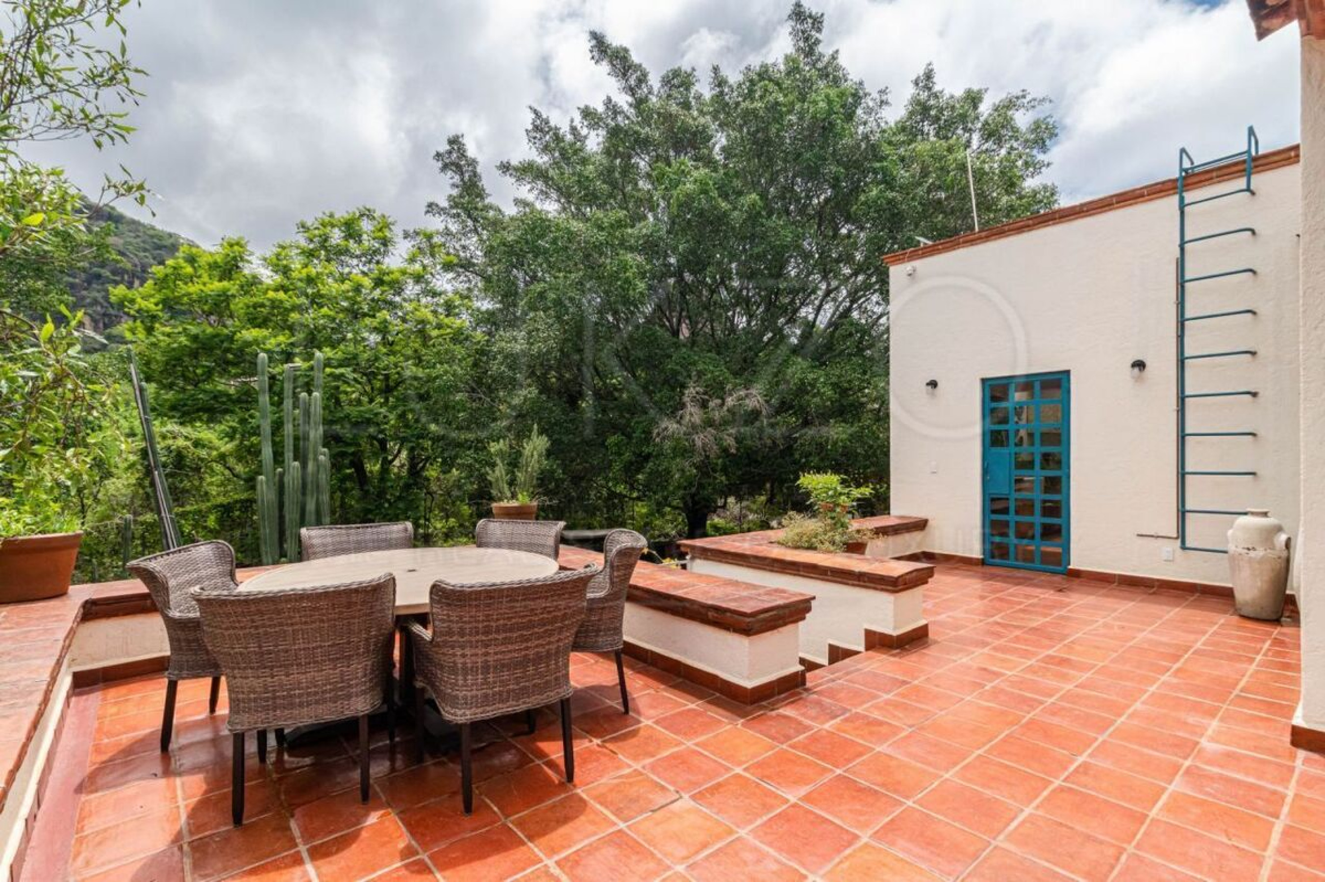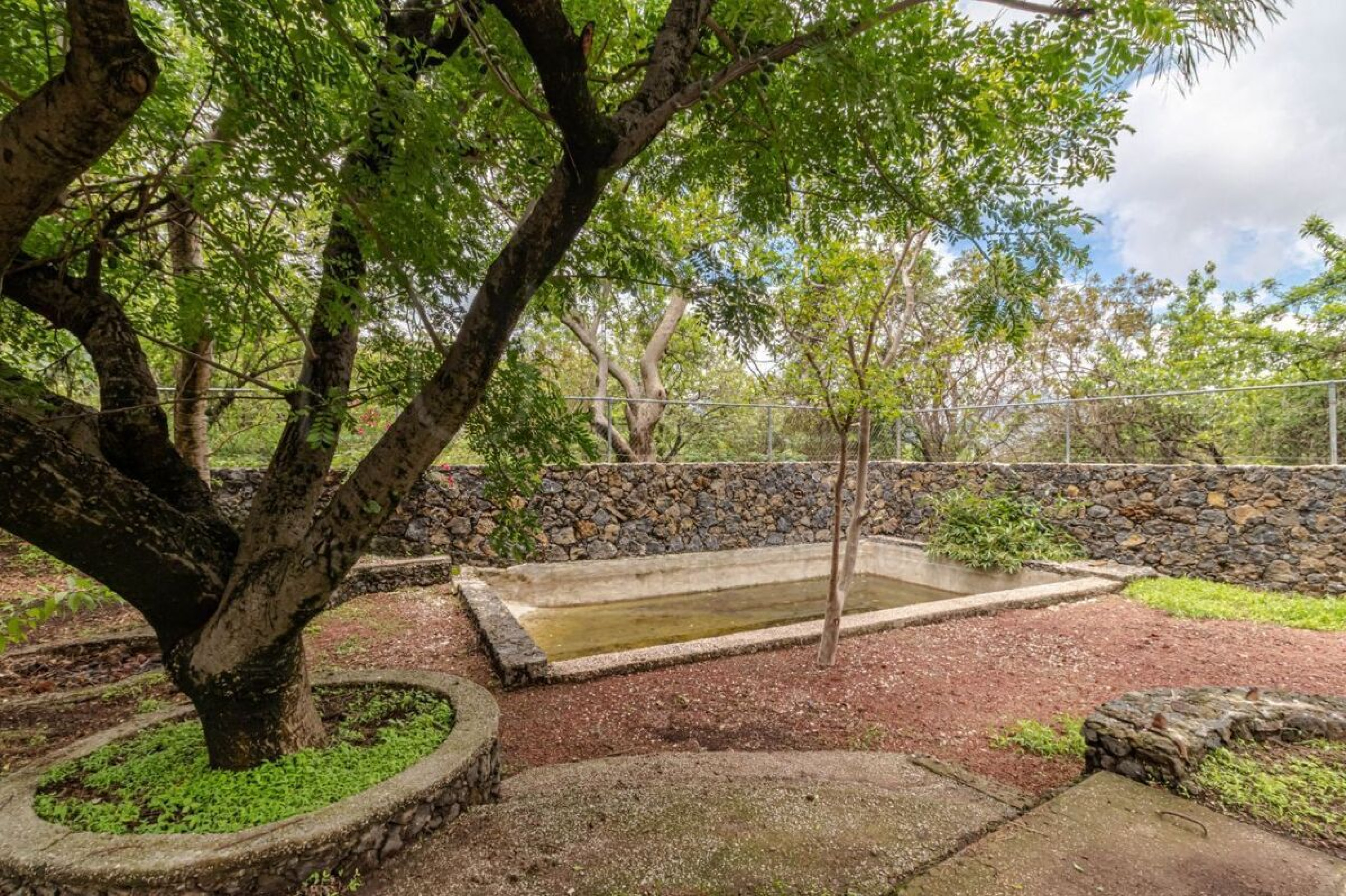 En el exterior, en la parte baja del predio, hay una alberca sin equipamiento en la parte rodeada de árboles maduros, endémicos.