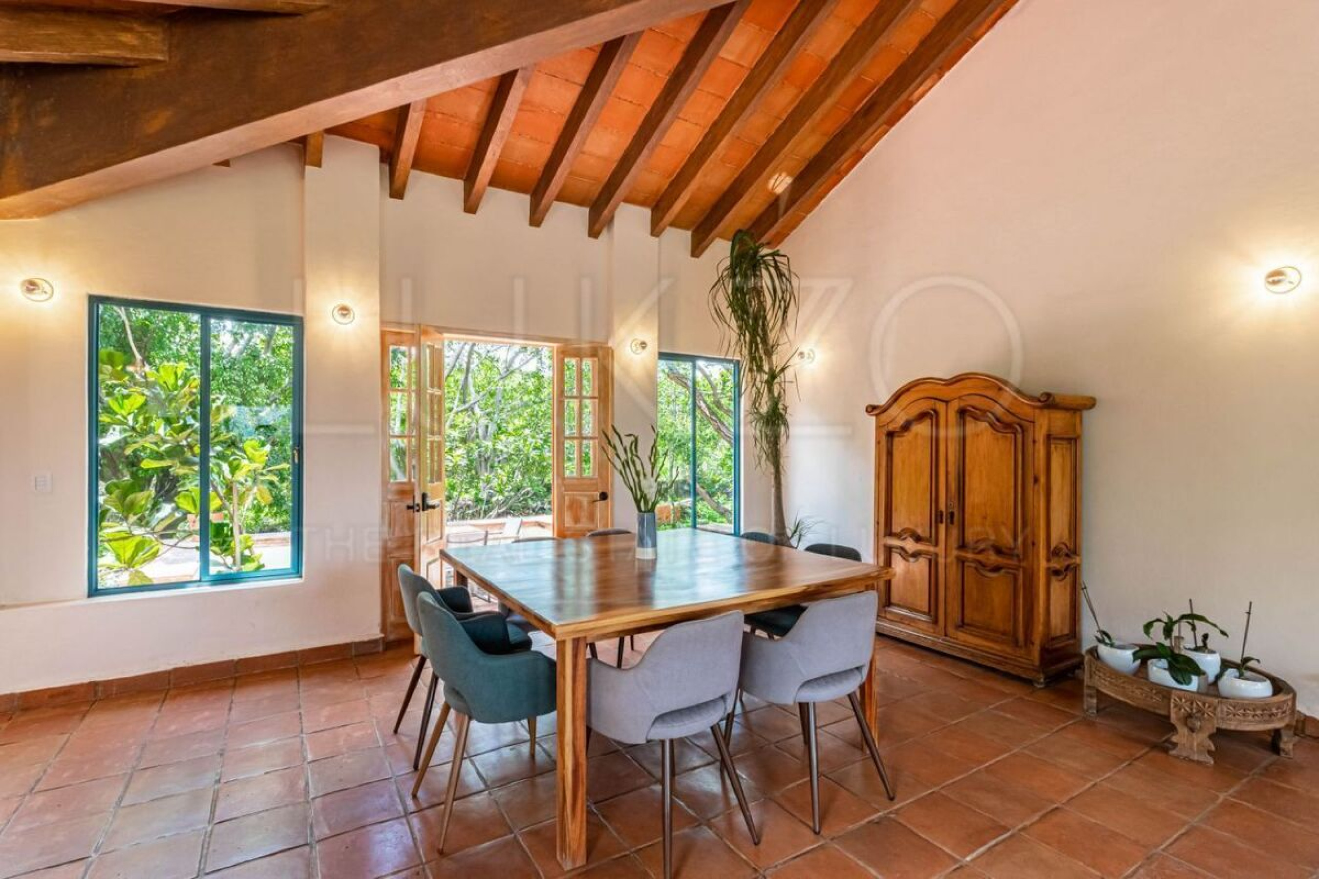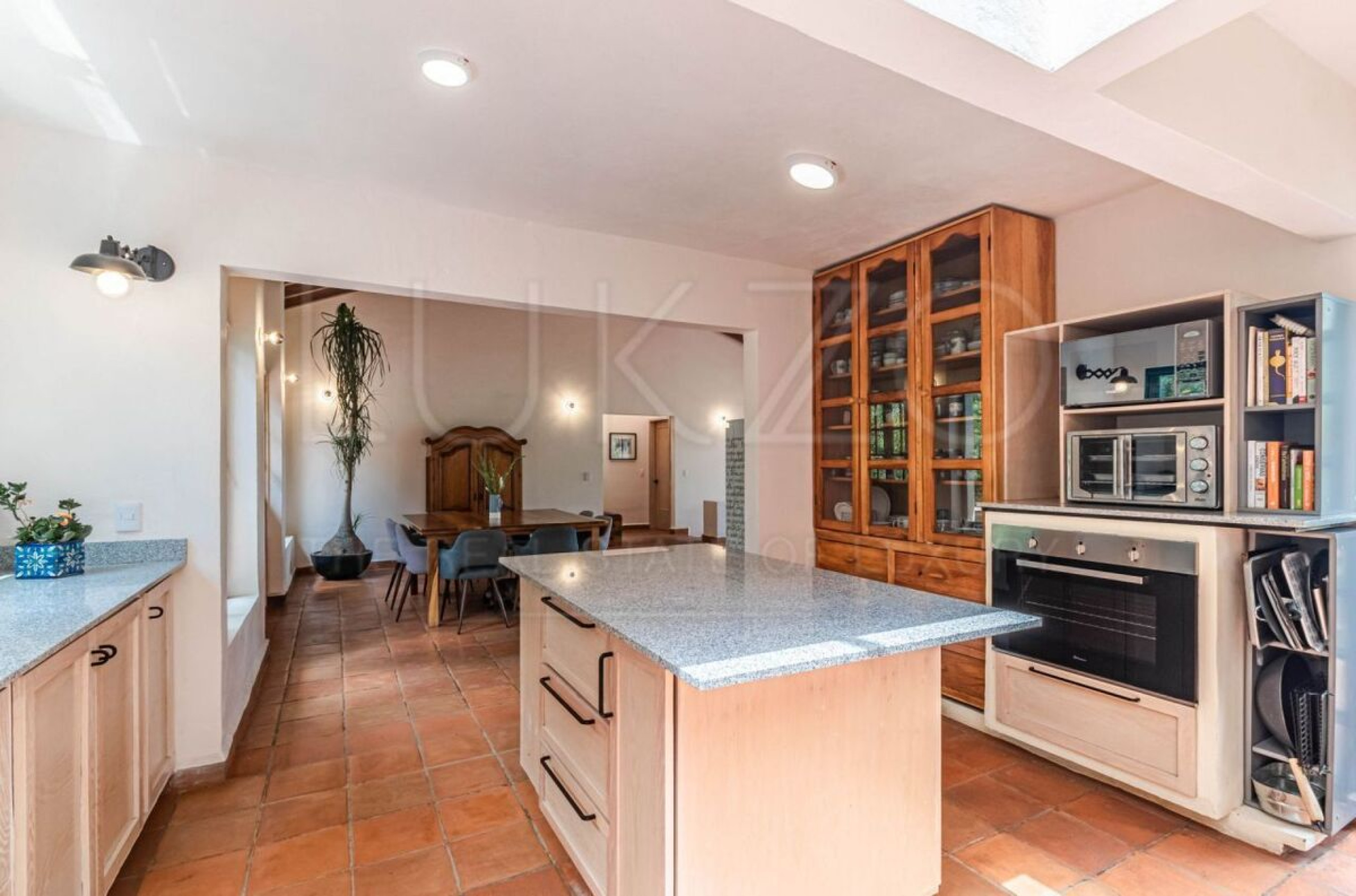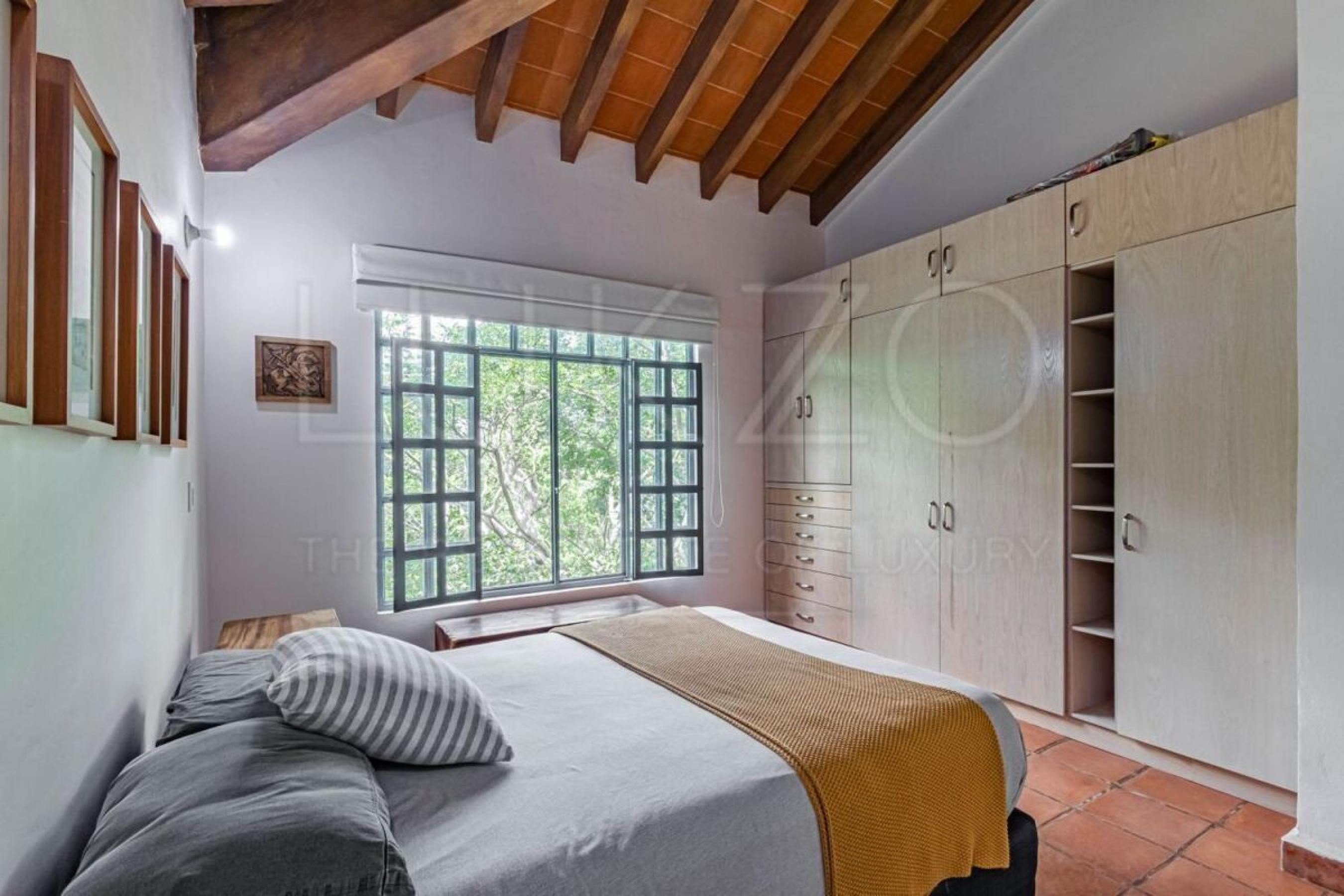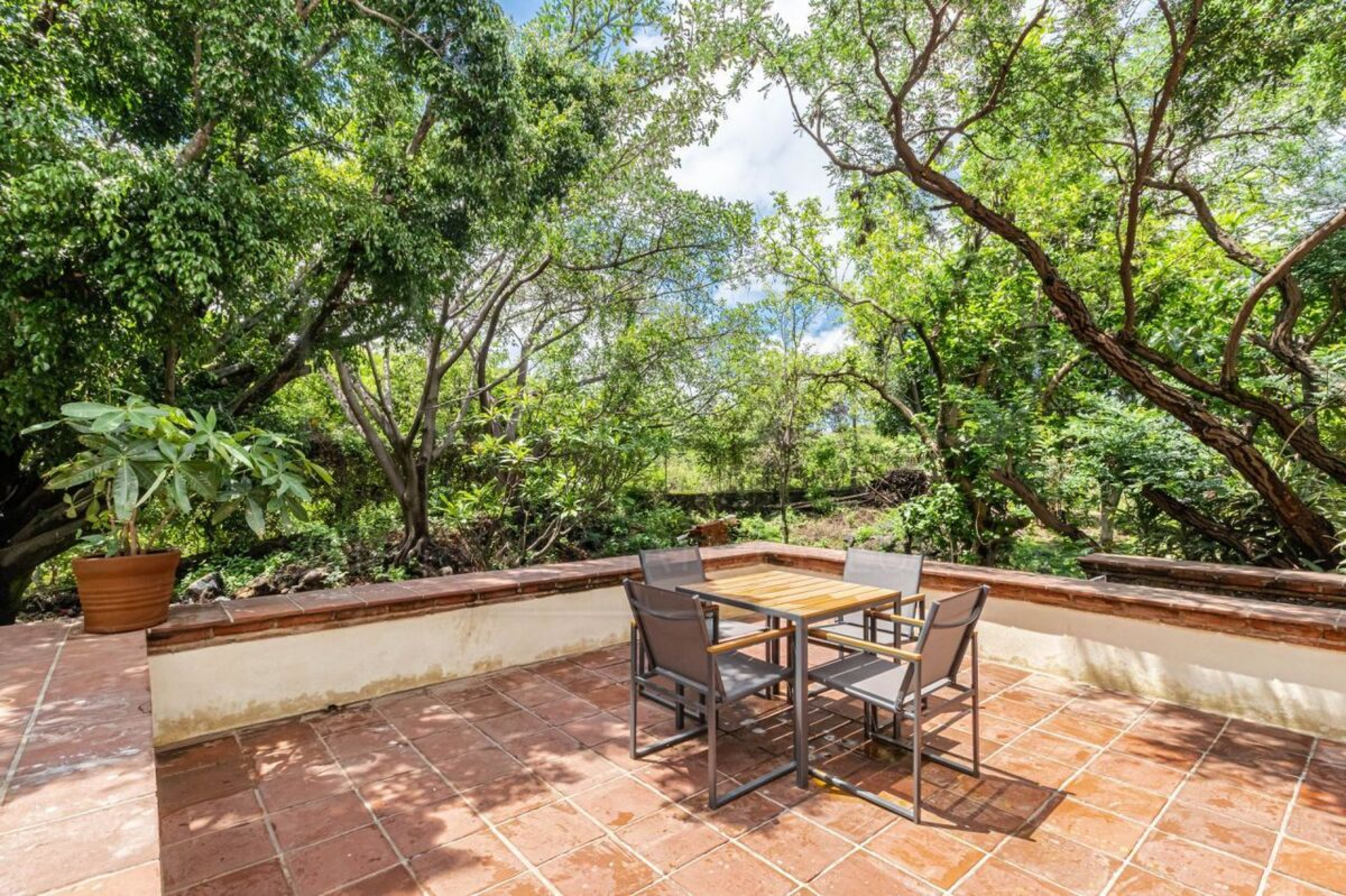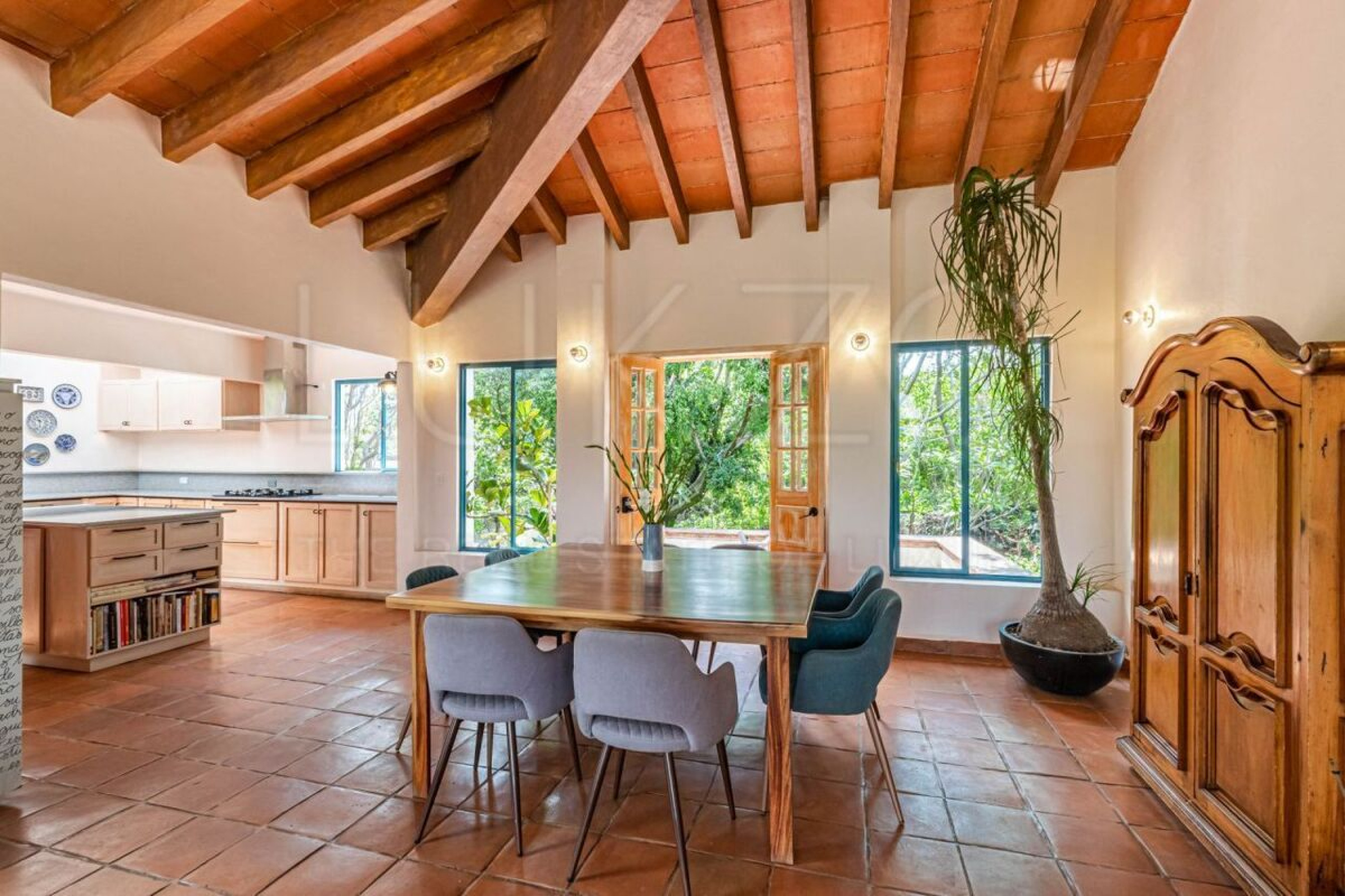 En el exterior, en la parte baja del predio, hay una alberca sin equipamiento en la parte rodeada de árboles maduros, endémicos.