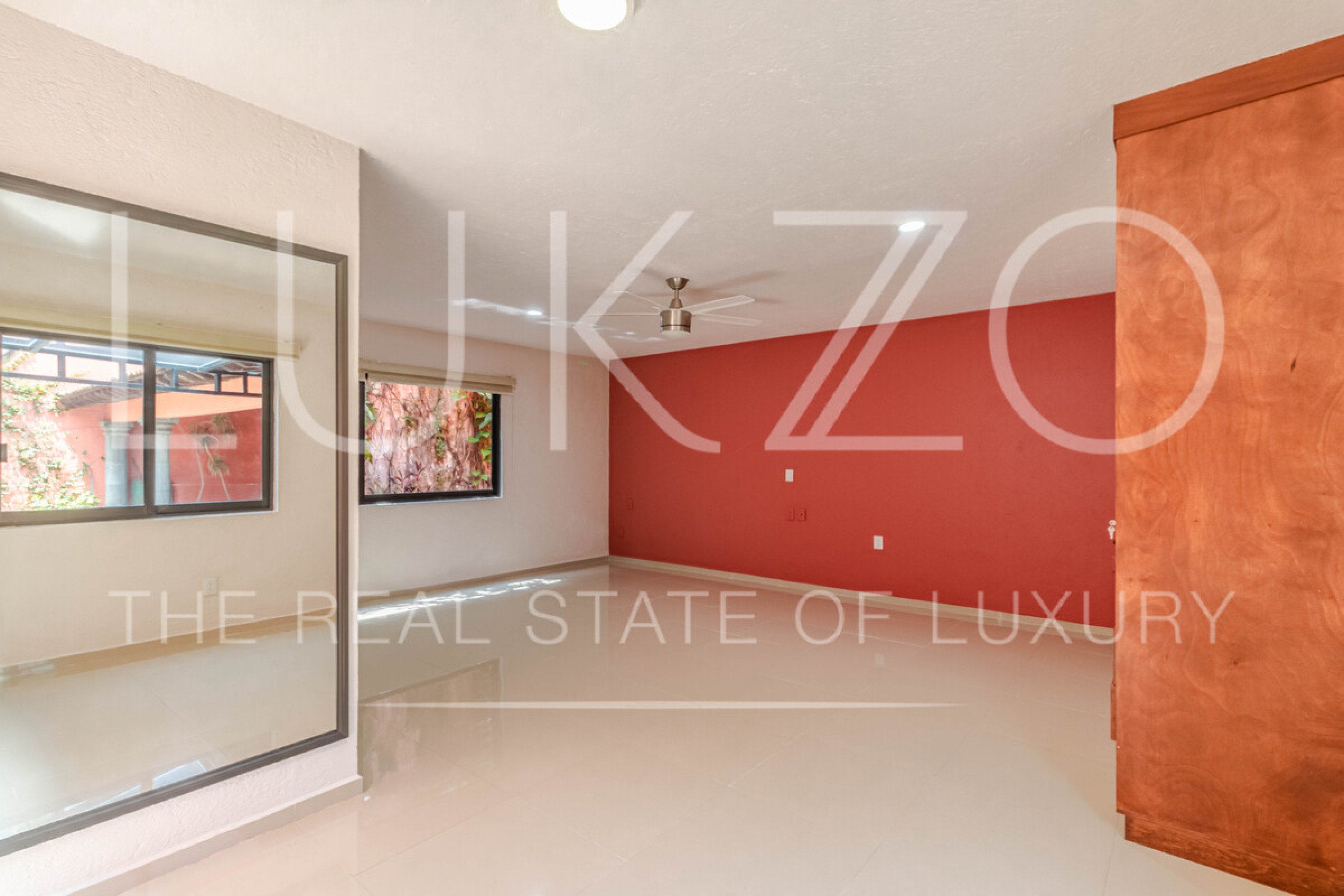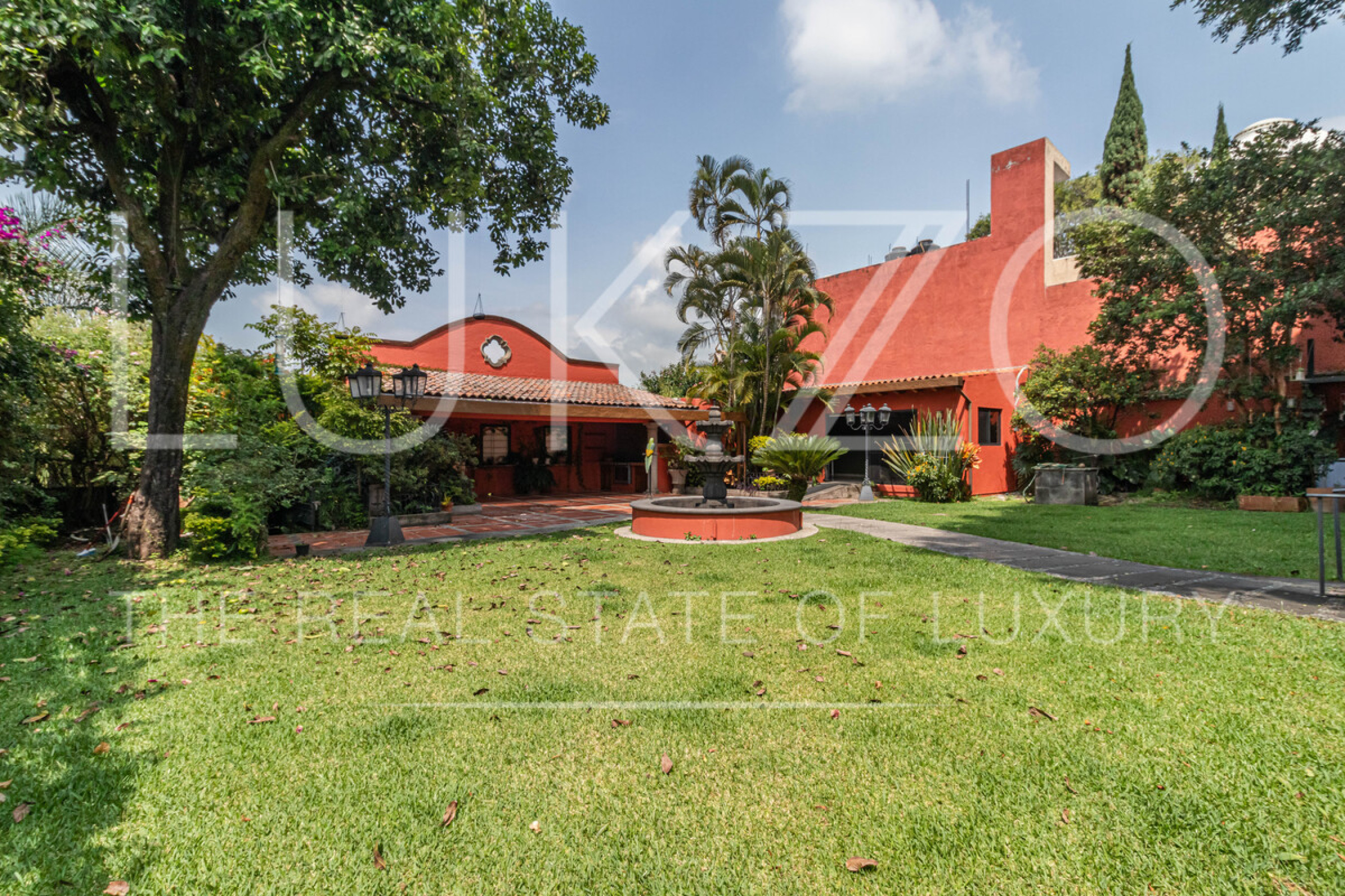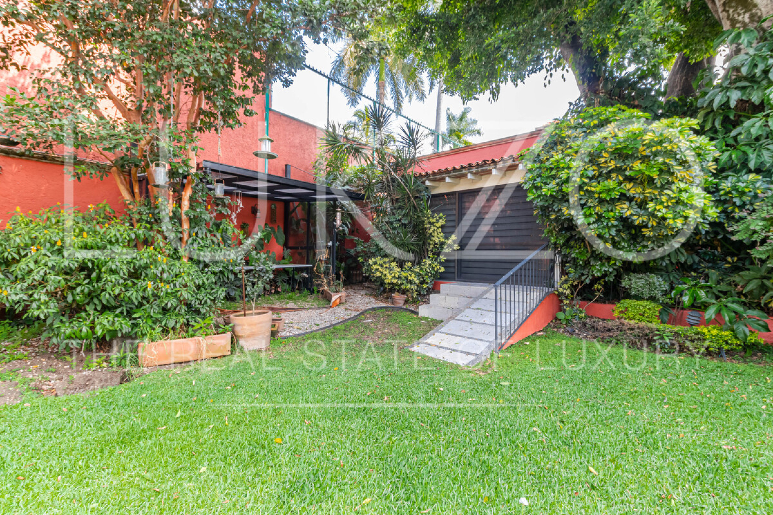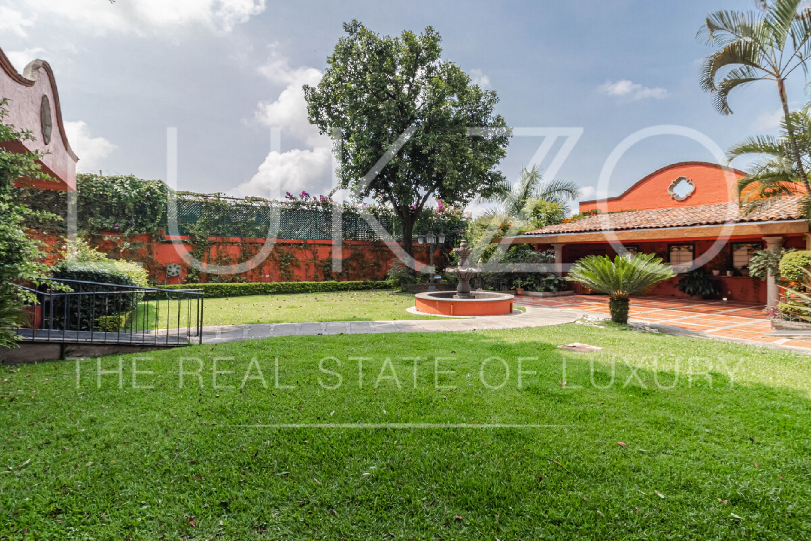 Residencia estilo mexicano ubicada en Palmira, Cuernavaca, sobre un terreno de 1,086 m² con ligera pendiente, construida en un solo nivel y en excelente estado de conservación. La casa cuenta con espacios amplios y luminosos: sala, comedor, antecomedor y una cocina equipada, distribuidos equilibradamente para la convivencia y el confort. Dispone de cinco recámaras, cada una con su baño propio, además de medio baño para visitas. Entre sus amenidades destacan varios espacios de servicio: cuarto de servicio con baño, lavandería, tres bodegas, estudio, bungalow independiente, terraza con barra y jardín extenso con sistema de riego por aspersión. Asimismo se encuentran estacionamiento para seis autos, portón eléctrico, sistema hidroneumático, agua potable con dos tomas, closet de blancos, closet de visitas, clima instalado por medio de cinco minisplits y adaptaciones que permiten tener mascotas. Esta propiedad, construida aproximadamente en el año 2000, ofrece privacidad, funcionalidad y un ambiente ideal para quienes buscan confort y elegancia en una sola planta.