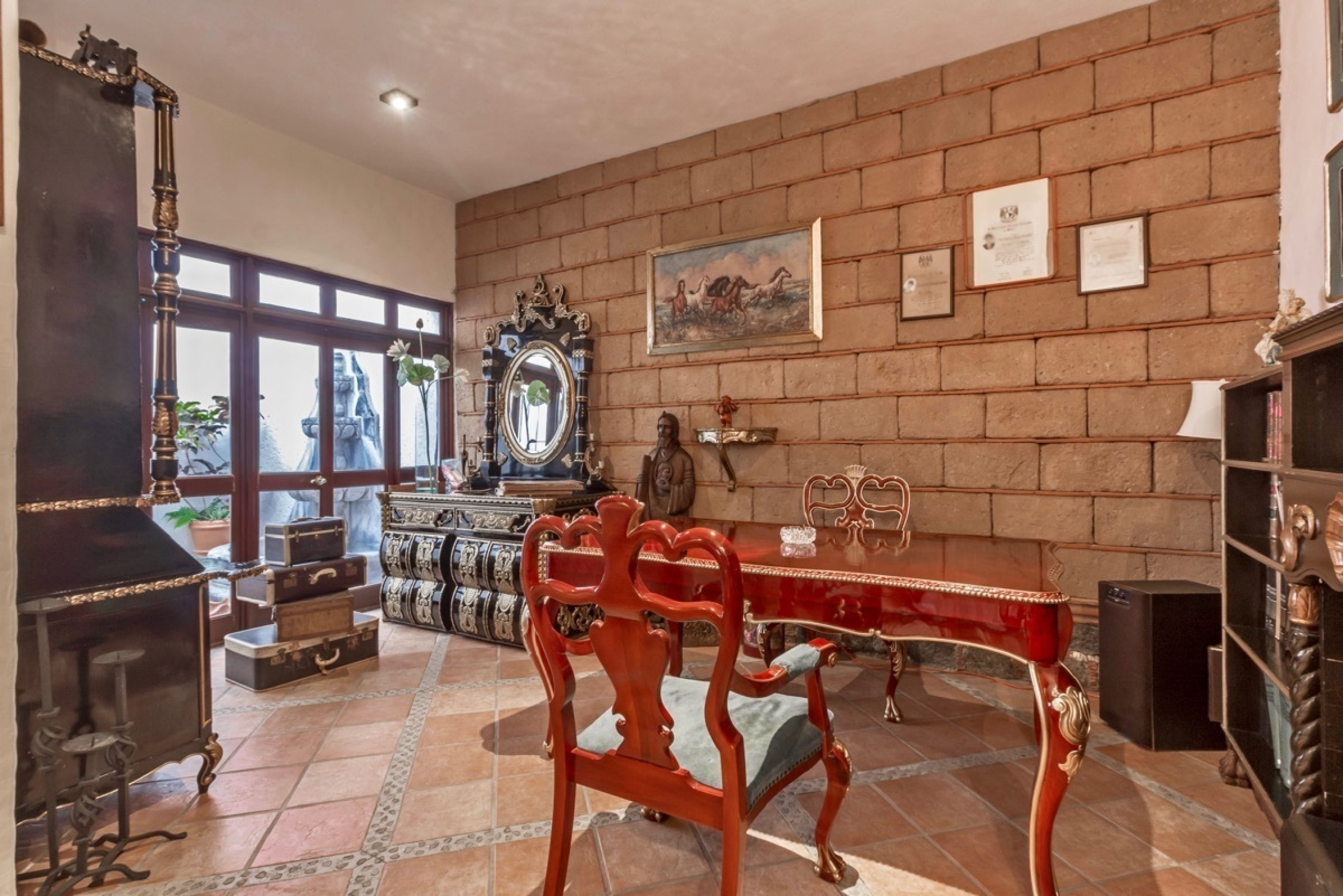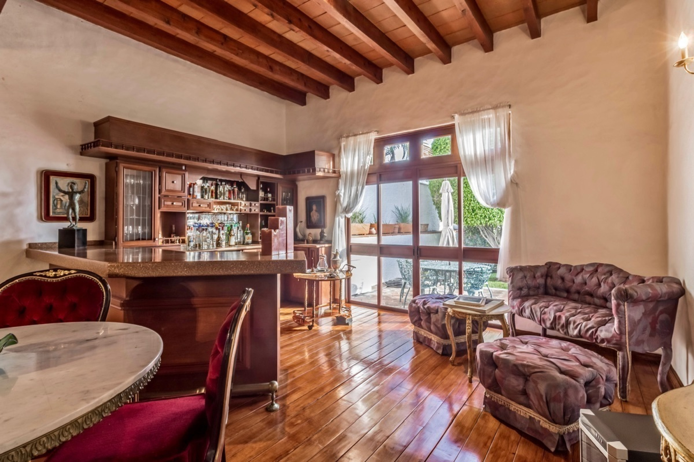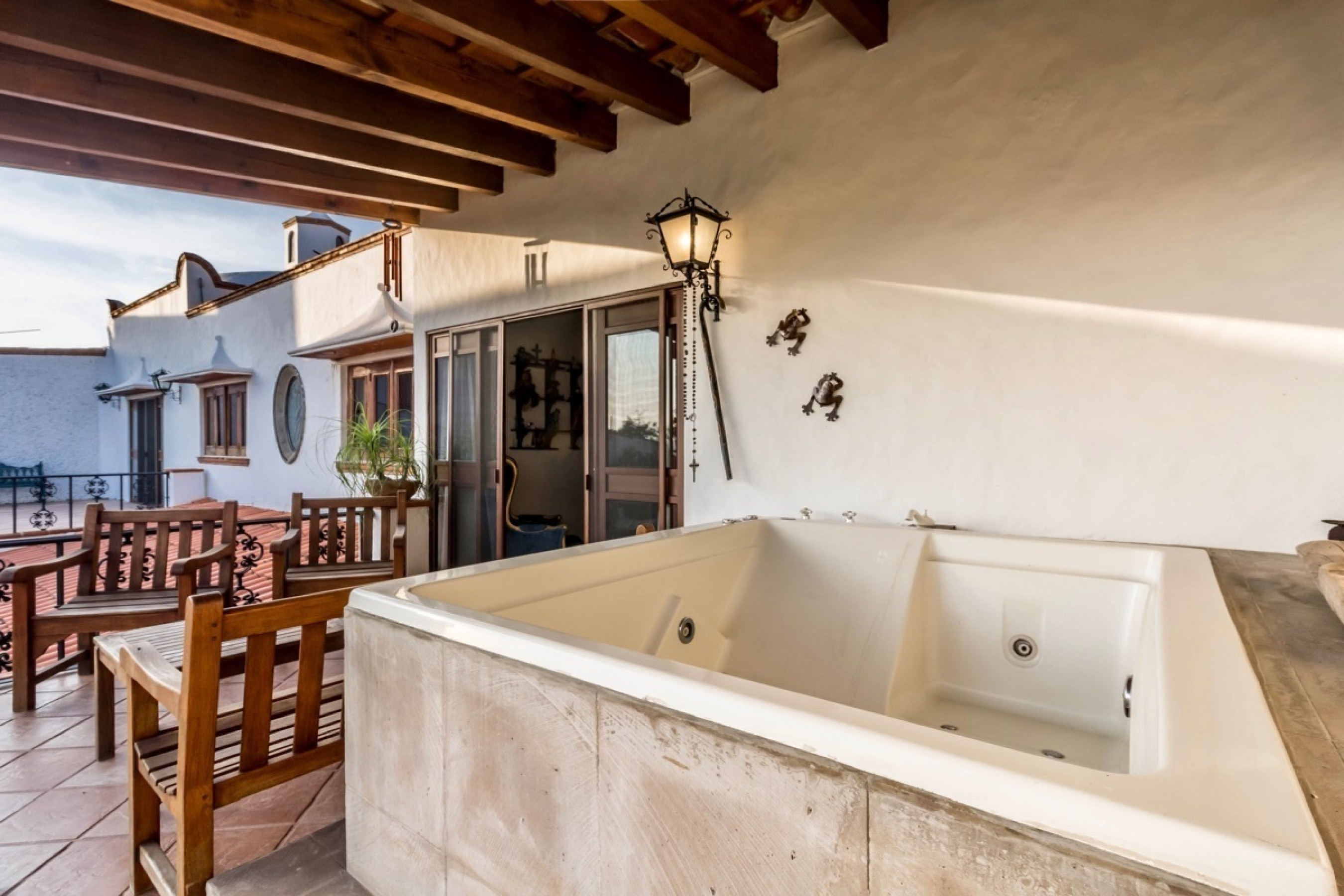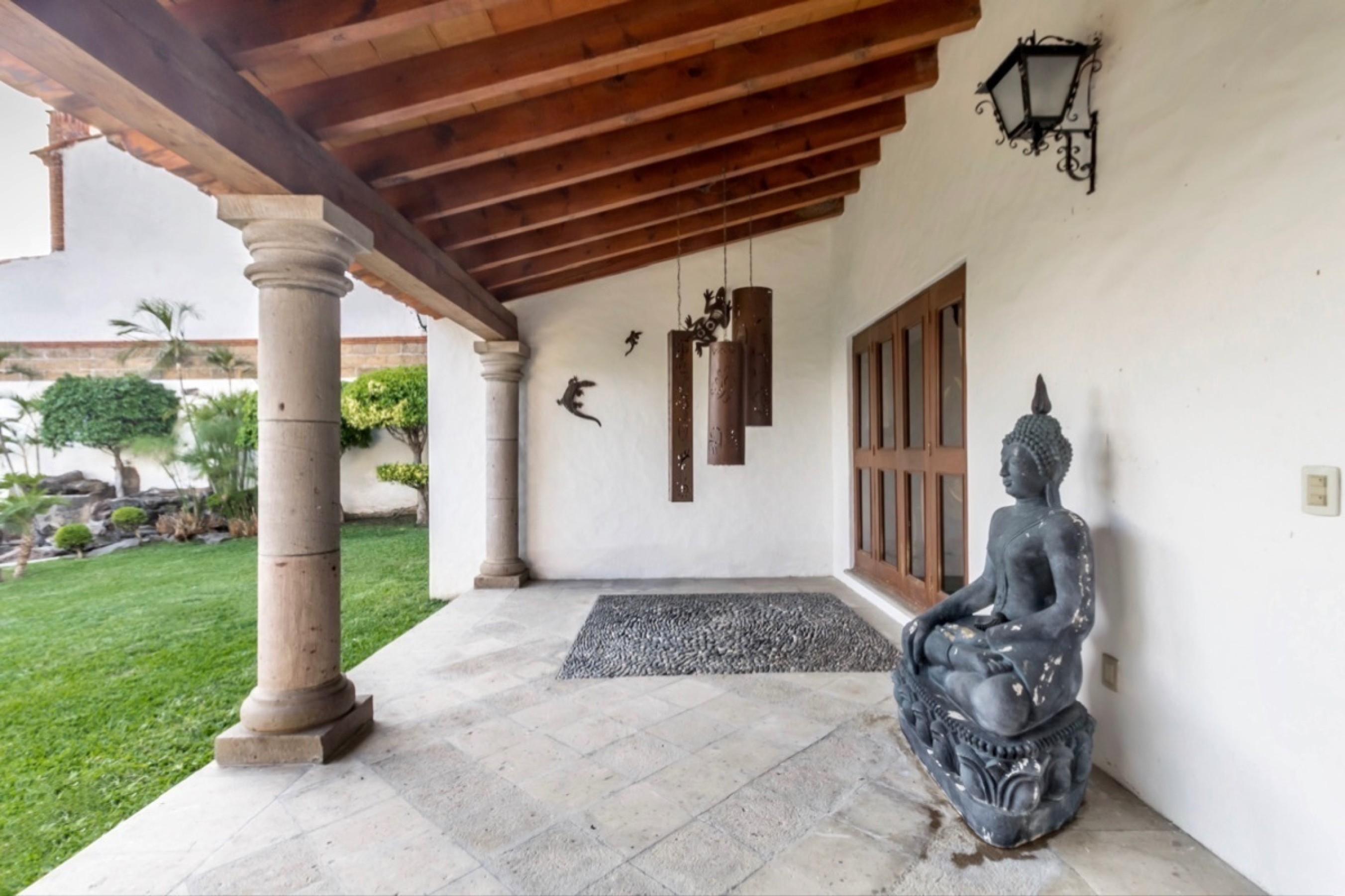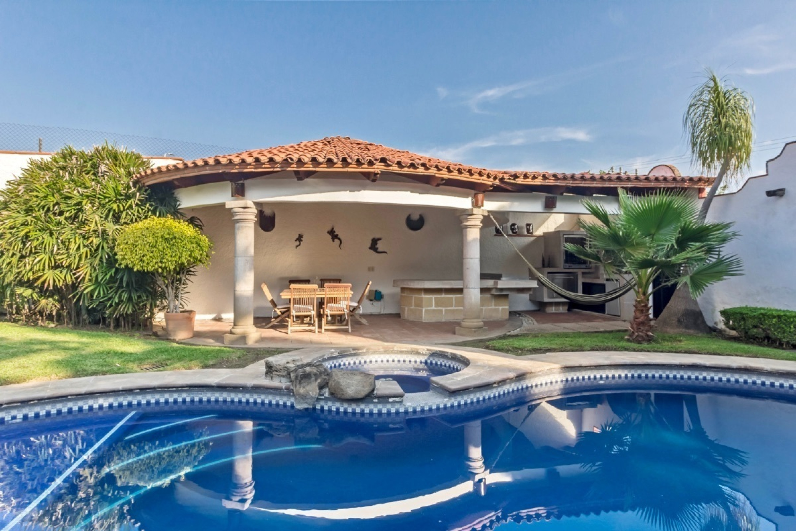 Residencia estilo colonial mexicano, ubicada en fraccionamientos en Temixco. La casa cuenta con bovedas, un patio interior con fuente, vigas de madera en techos y canceleria de madera en las ventanas. Los baños son modernos y las regaderas con canceles de cristal templado. La cocina y tiene barra para desayuno. La terraza cuenta con plancha de Tepanyaki, asador, horno y un rosticero vertical. Es perfecta para disfrutar reuniones con familiares y amigos. El jardin tiene plantas maduras y el sonido de la cascada exterior invita a meditar o pasar la tarde leyendo un buen libro. El bungalow con una recamara y baño completo es ideal para recibir invitados. Por la autopista es muy facil llegar a centros comerciales como Forum o Averanda.