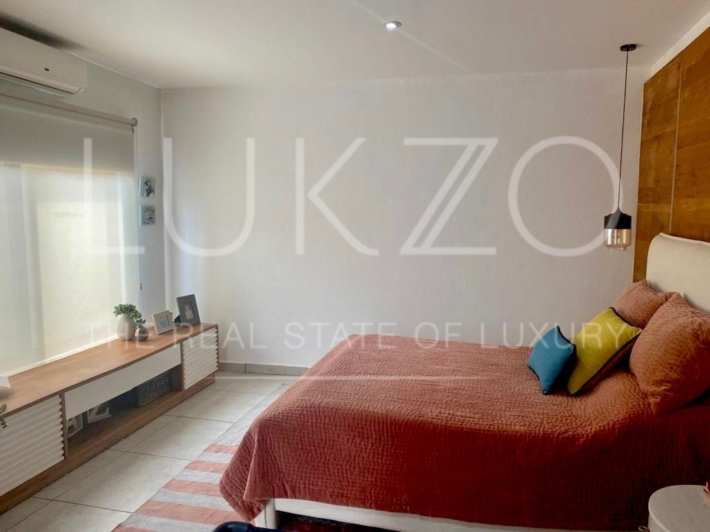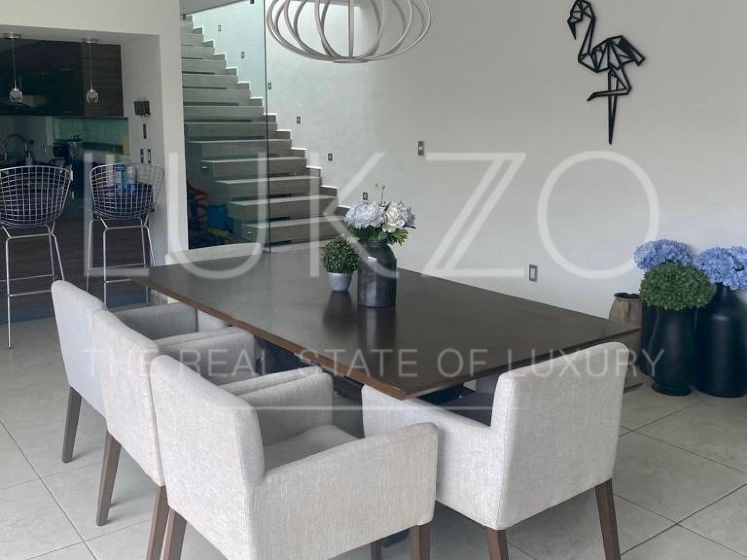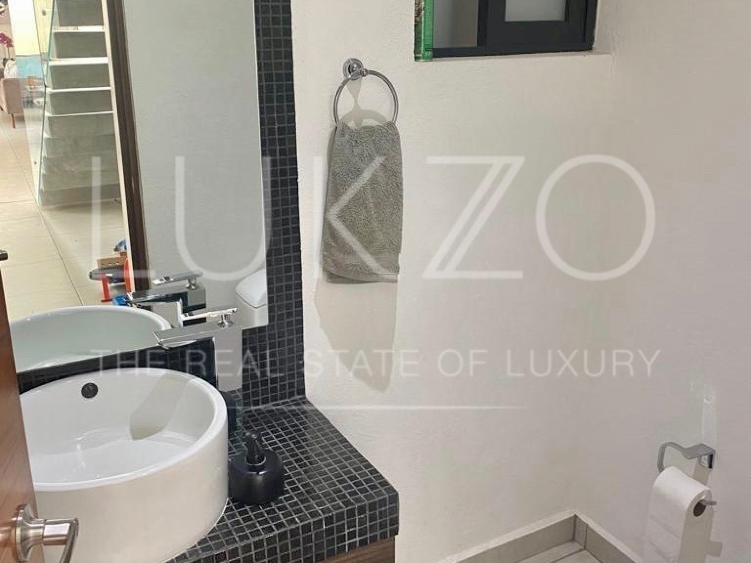 En el interior de la casa encontrarás una sala, comedor y cocina equipada con barra. En planta baja encontrarás 2 recámaras, cada una con su propio baño, además de un medio baño de visitas. En la planta alta, hay tres recámaras más, todas con baño. La recámara principal cuenta con un vestidor para mayor comodidad.
