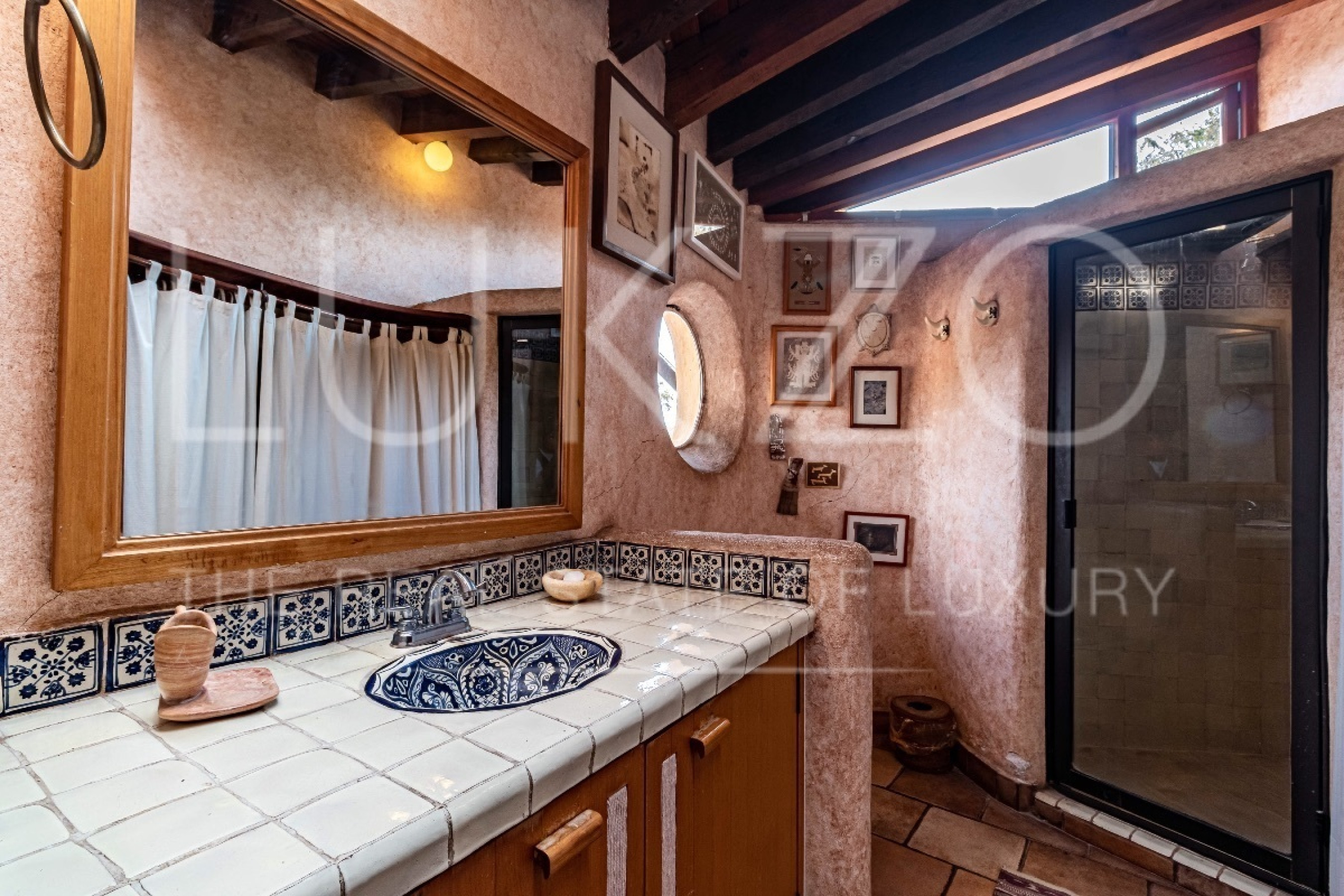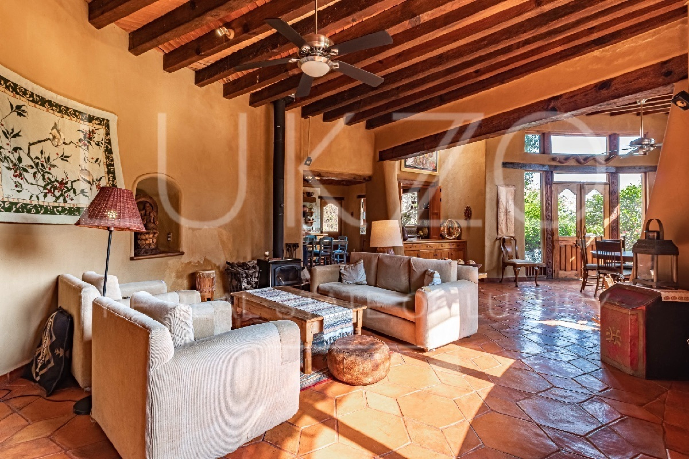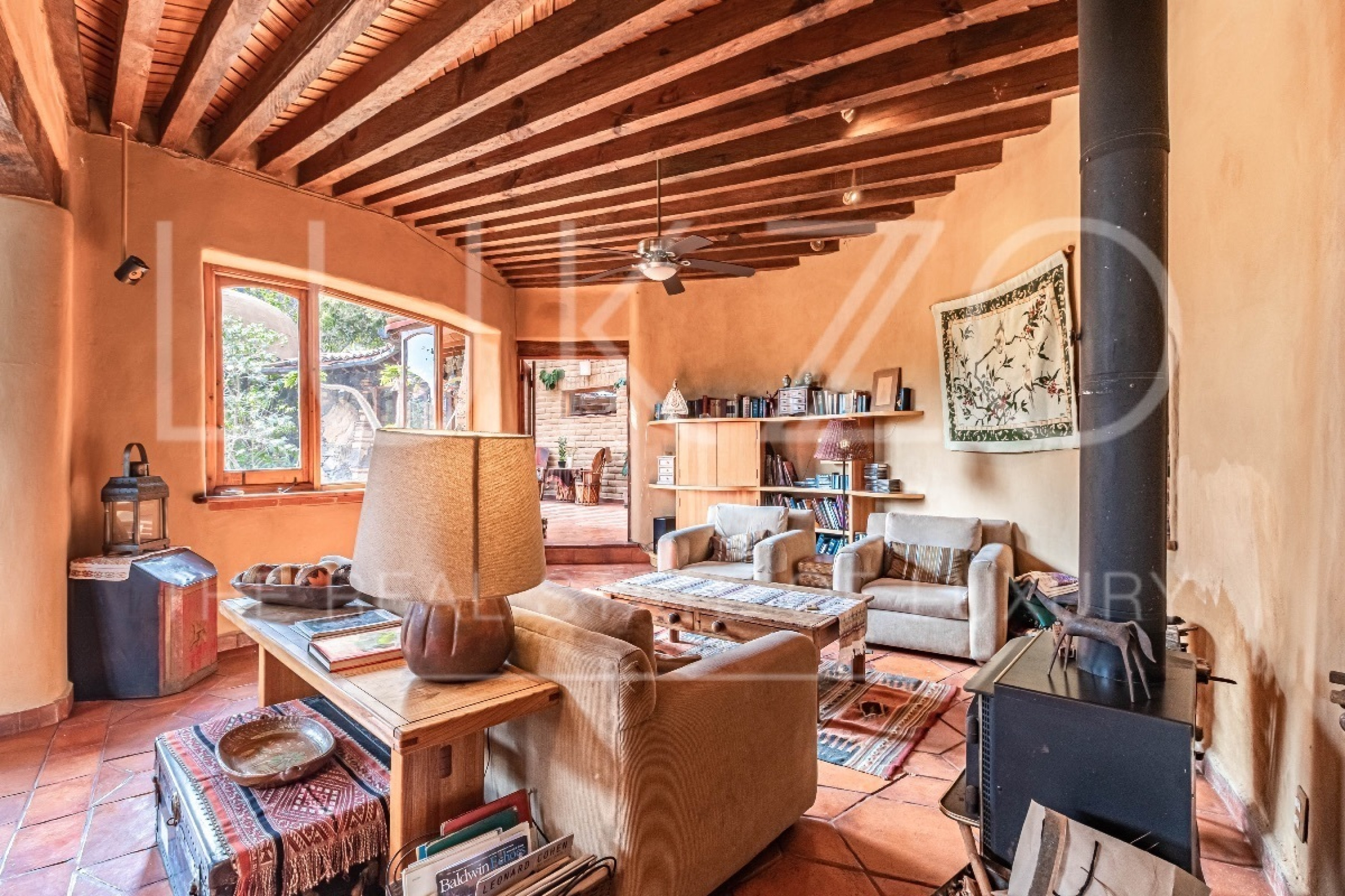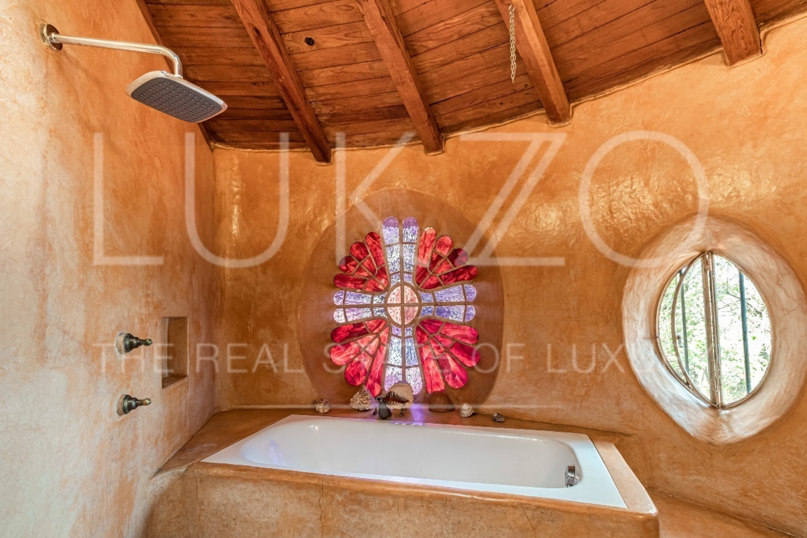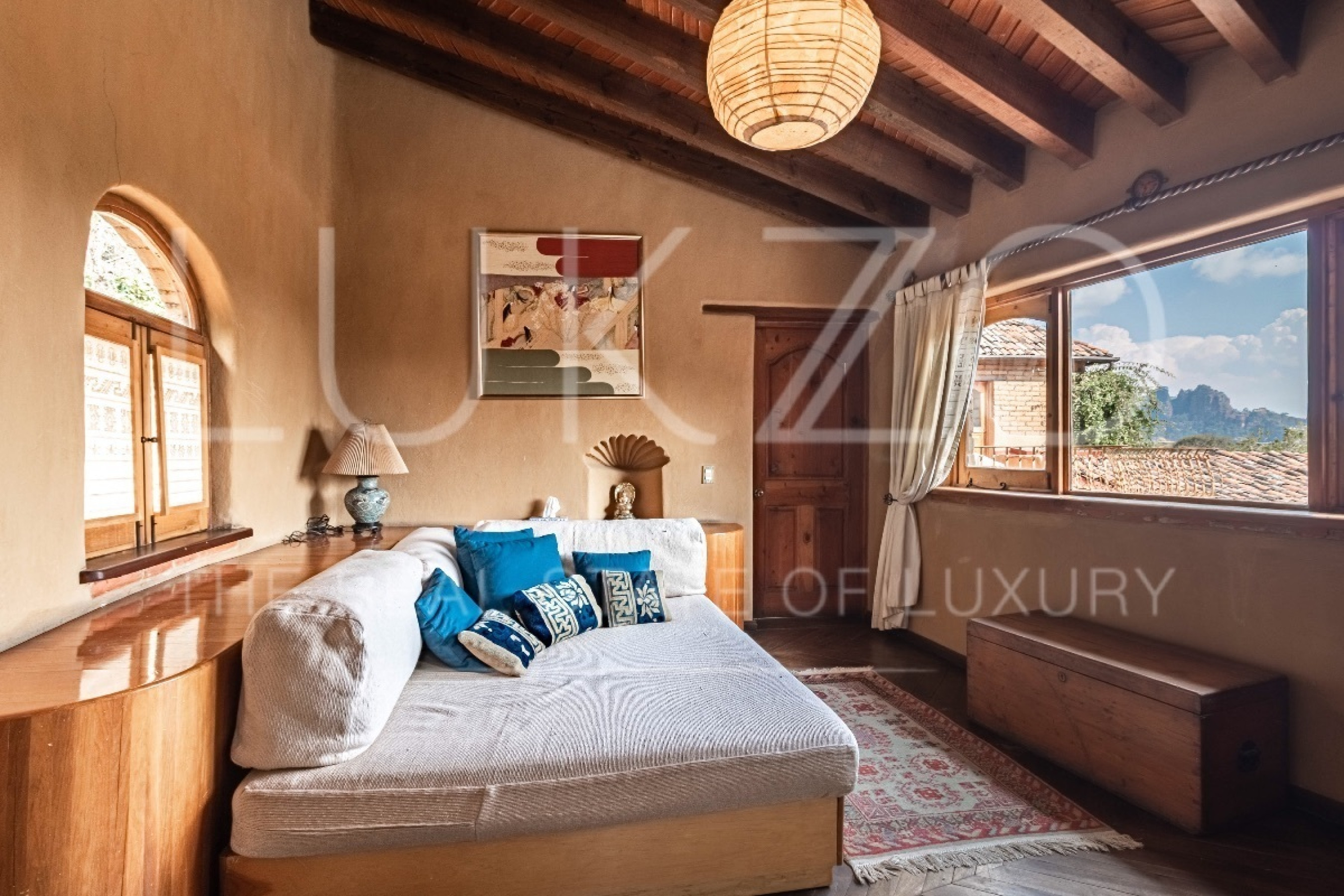 Diseñada por el arquitecto mexicano Michel Lewis, la casa está construida con piedra local y adobe, con techos altos, vigas de madera y vistas en todas las direcciones. Construida en una forma distintiva de media luna, la casa tiene tres dormitorios, tres baños, sala de estar, comedor, oficina y cocina. Los pisos son de baldosas tradicionales o de madera. Los espacios al aire libre, todo rodeado de jardines y árboles. Patio cercano a la cocina, perfecto para tomar un café por la mañana. Terraza cubierta afuera del comedor. Terraza en el segundo piso para tomar el sol y observar la luna. Una zona detrás de la casa, ideal para leer y tomar el té de la tarde. Ecovillage Huehuecoyotl es una comunidad asentada en una superficie de 20,797 m en la que se construyeron 14 residencias. Por su cercanía en la montaña, su entorno de bosque y acceso a casi 15,000 m de áreas comunes en las que se han implementado huertos, cocina comunitaria, salón de trabajo y área de jardín para eventos. Cesión de derechos.
