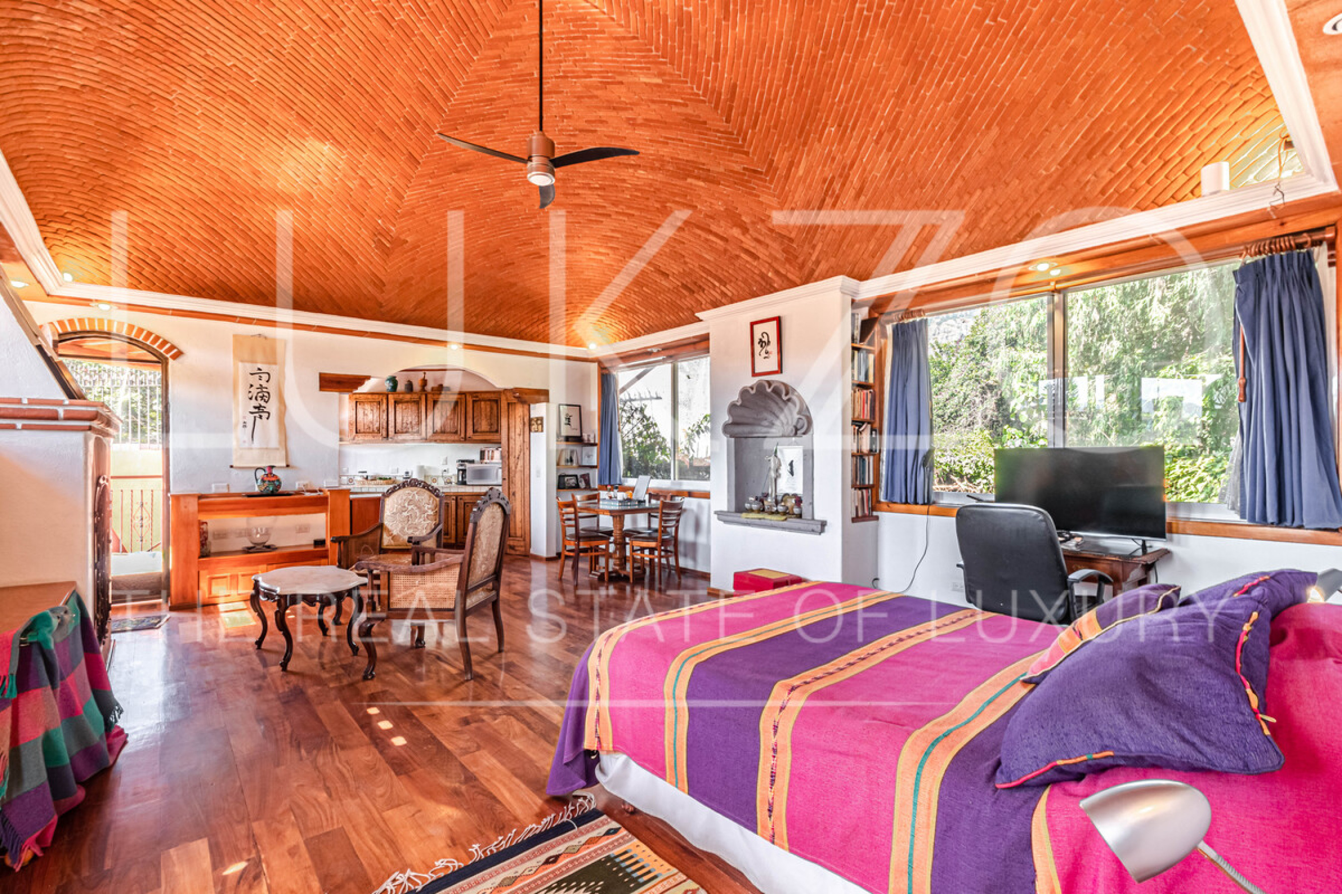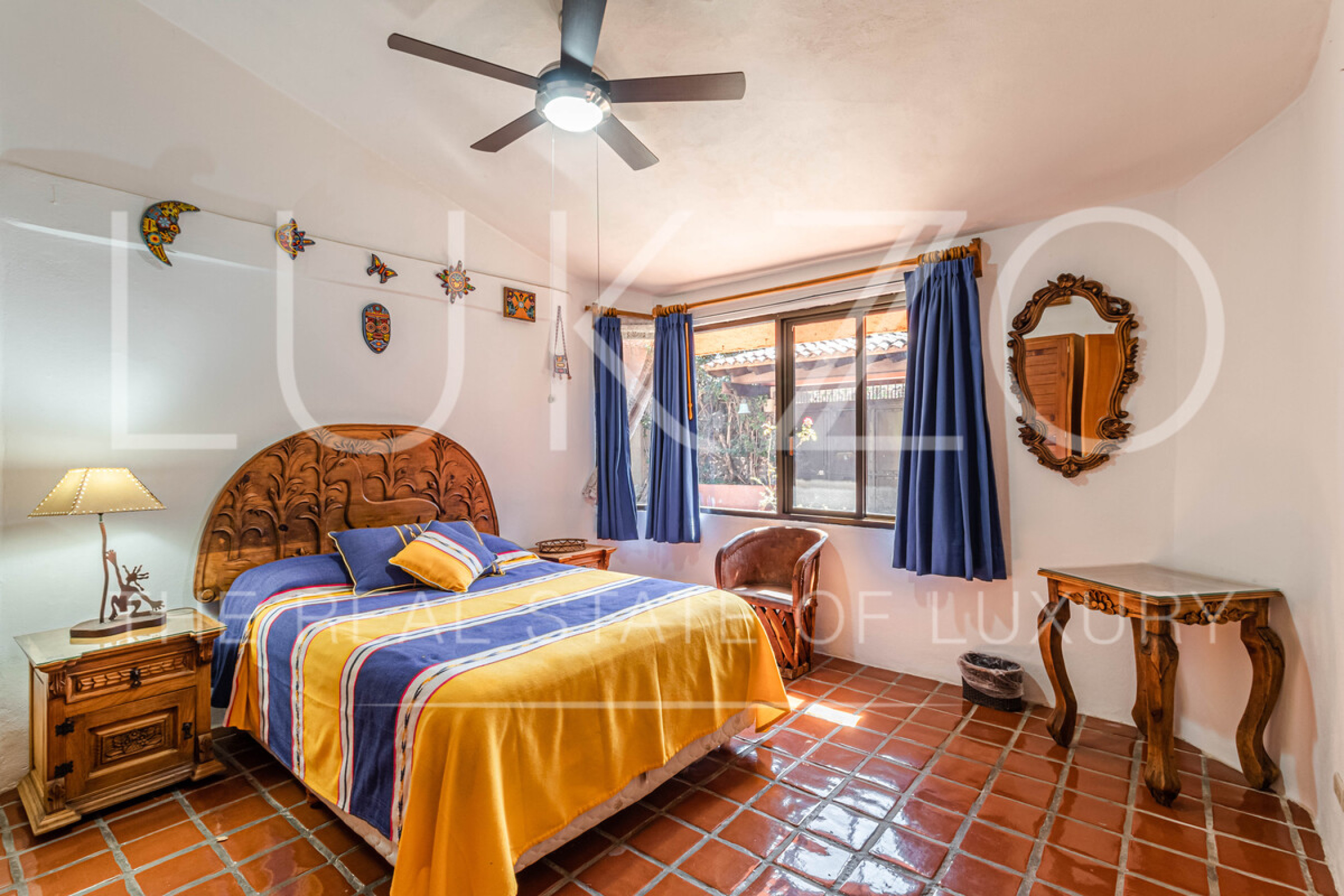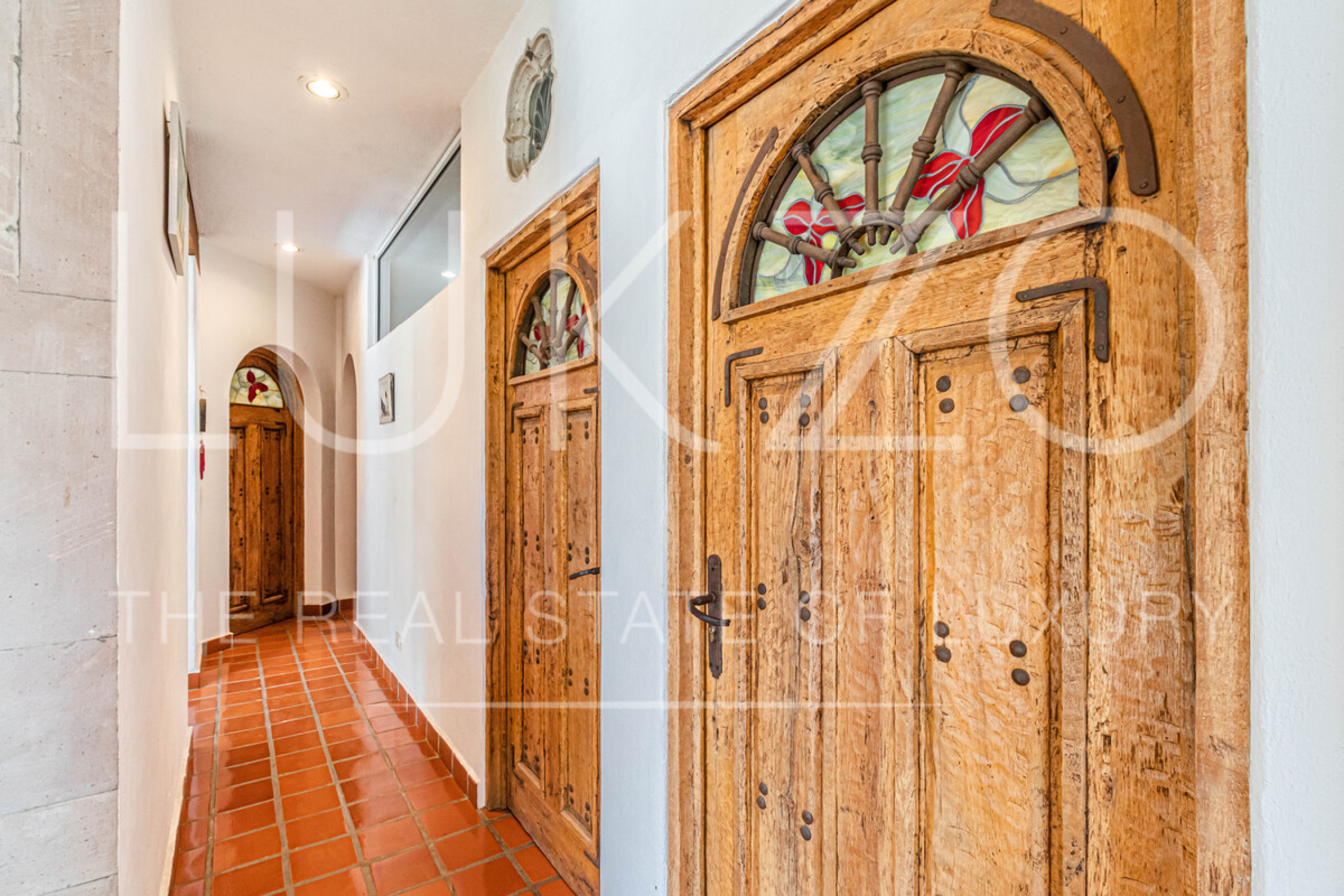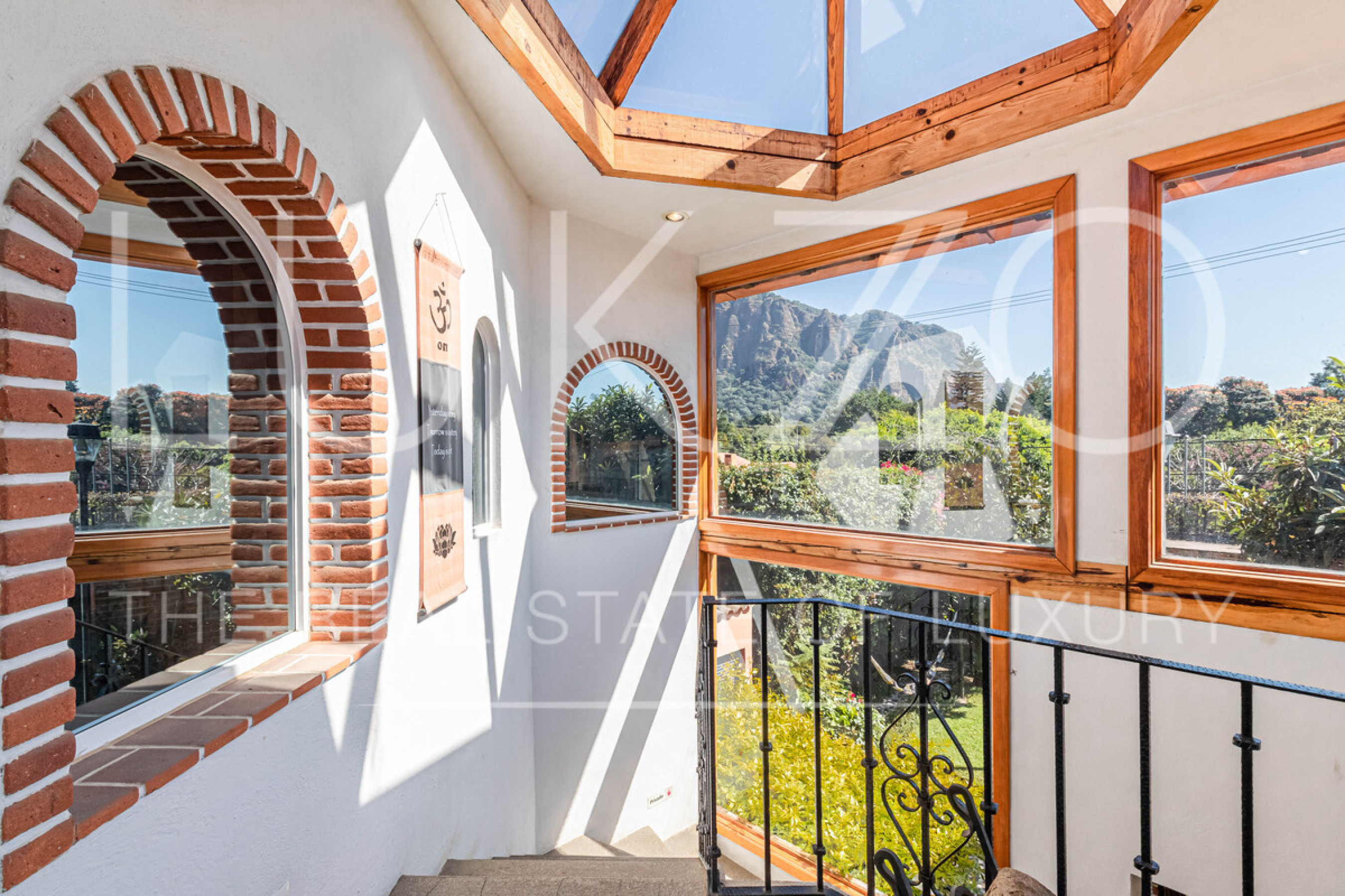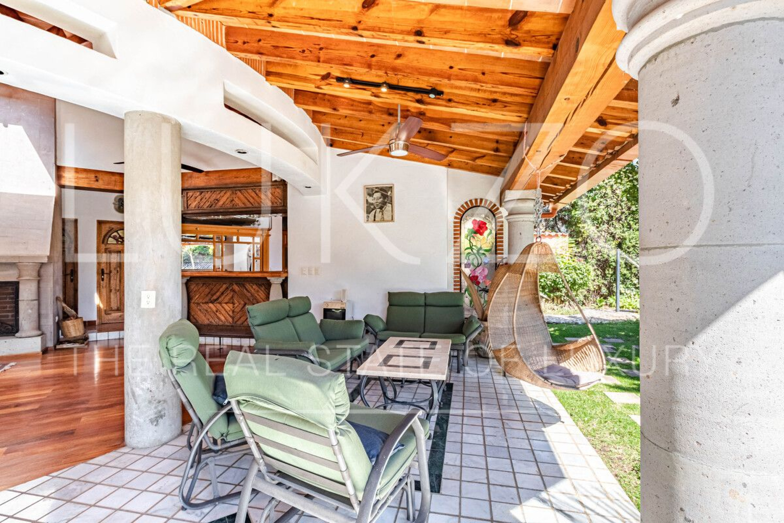 La segunda casa es de dos pisos con techos altos de ladrillo, pisos de mármol y de madera. Vitrales, frescos, y un jardín con fuente. En esta casa hay tres recámaras con baños completos. Terraza o sala al aire libre con chimenea con vista al jardín. Cuenta con cocina integral.