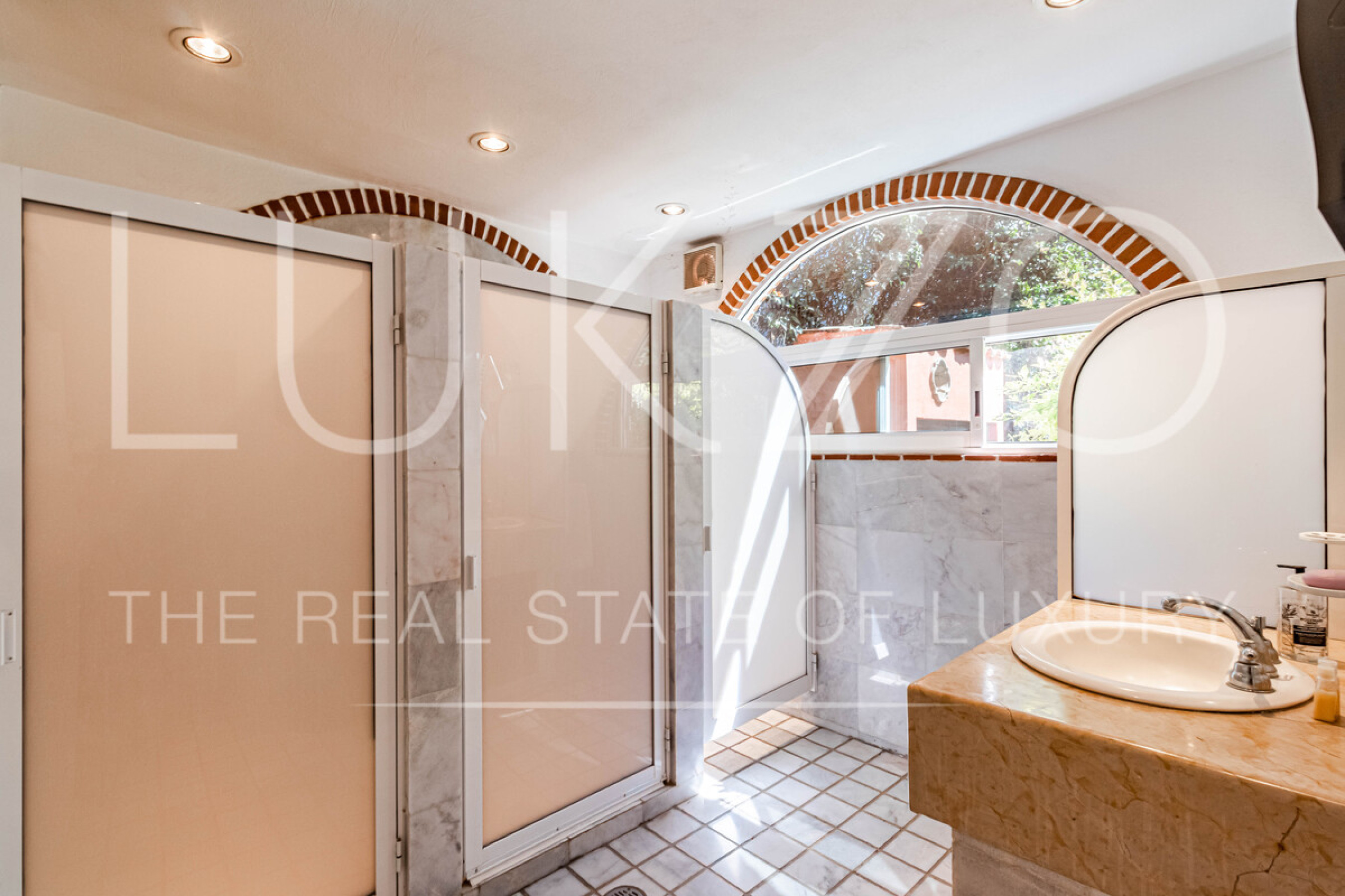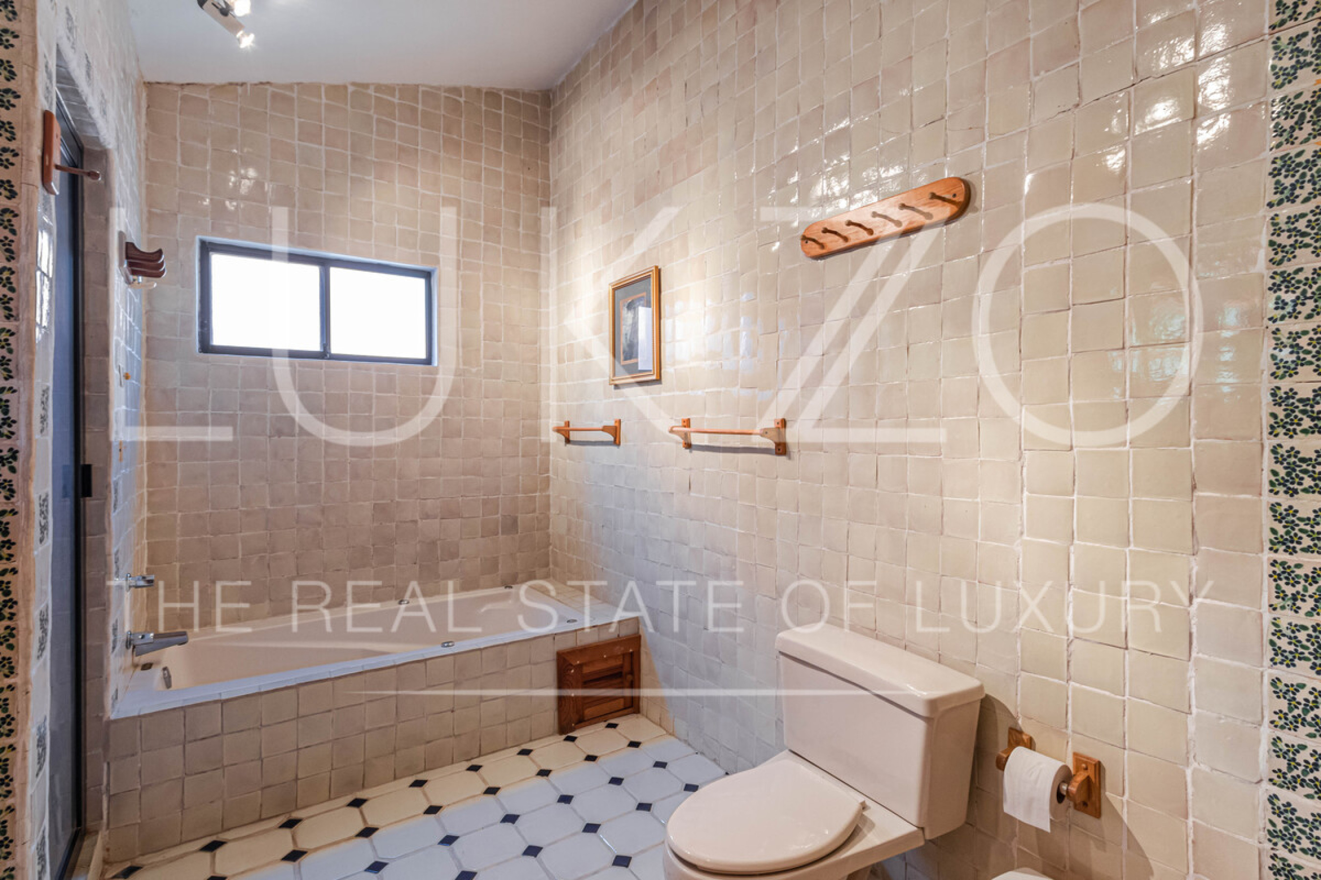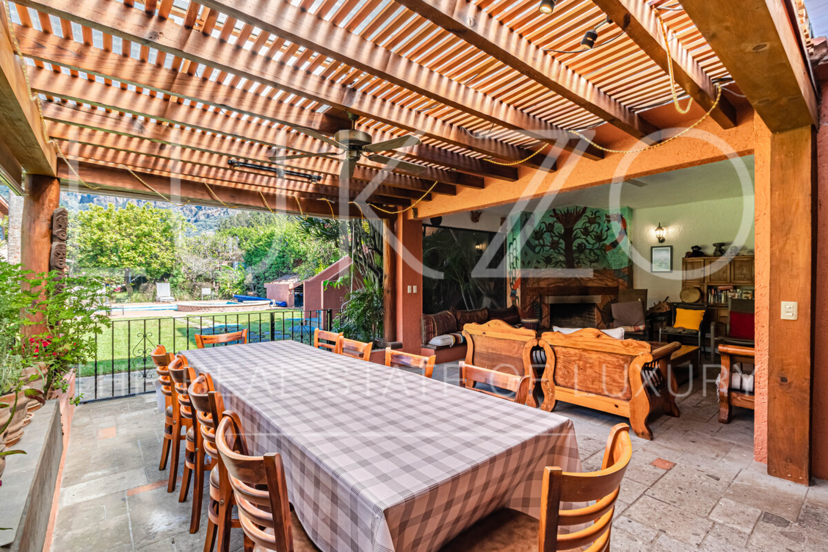 La casa principal tiene seis recámaras con baños privados completos y jacuzzi, área de descanso y terraza o comedor al aire libre. Cocina profesional para eventos y cocina integral. Medio baño de visitas.