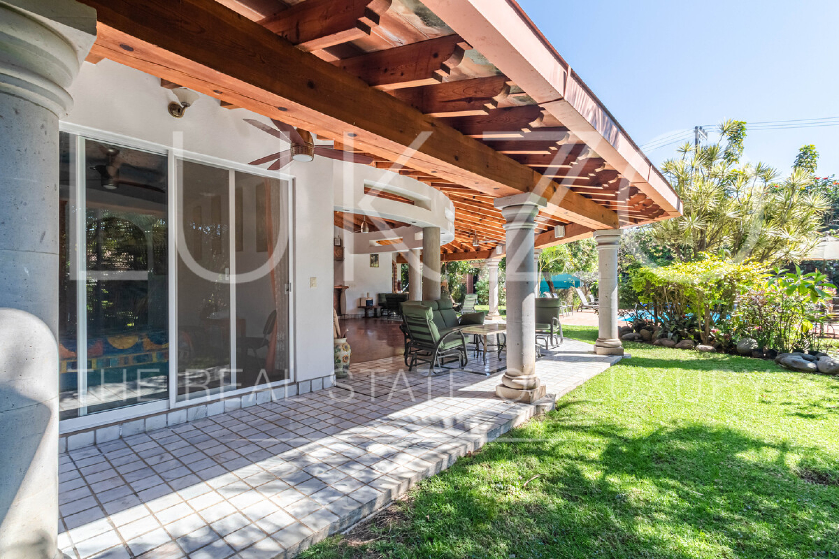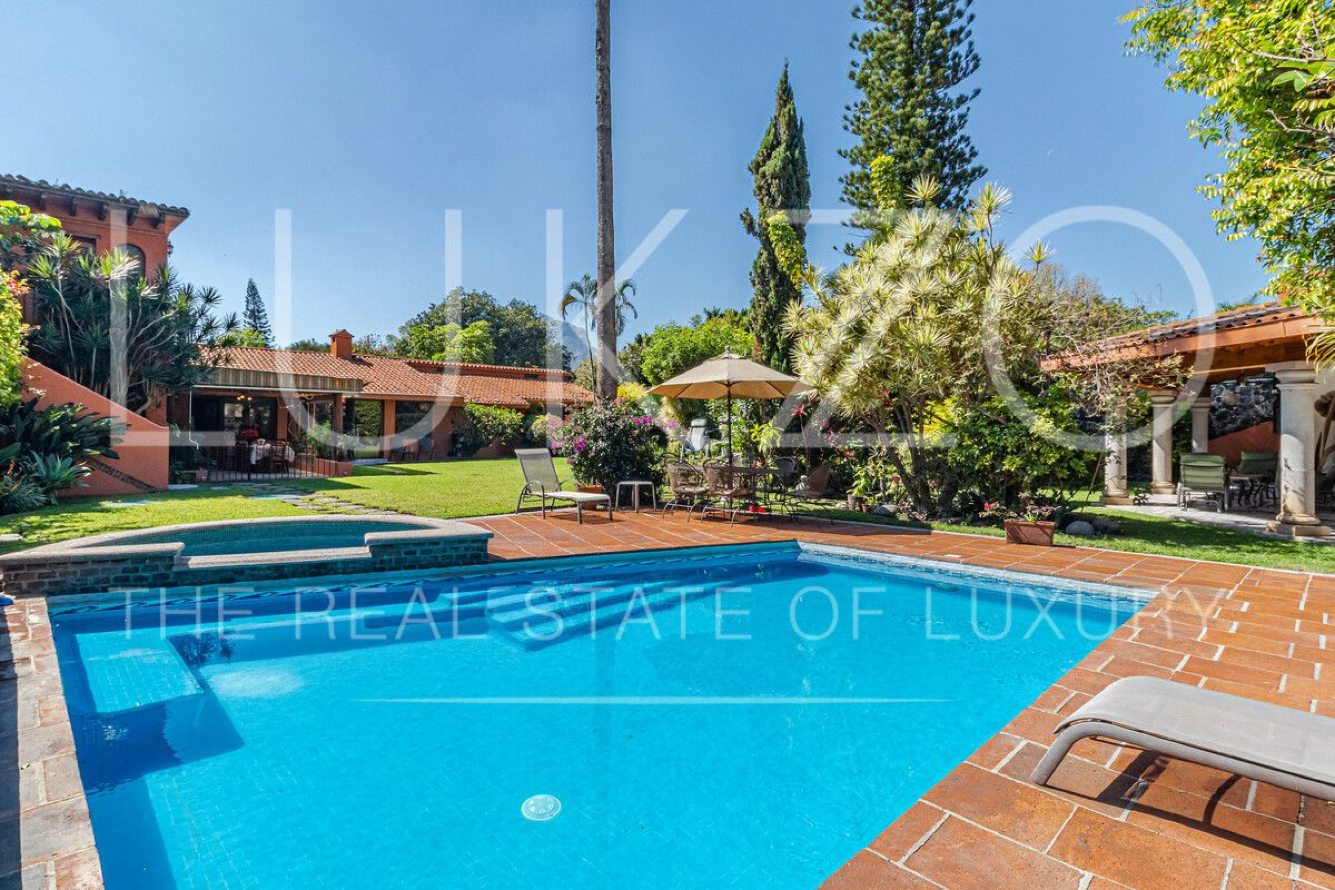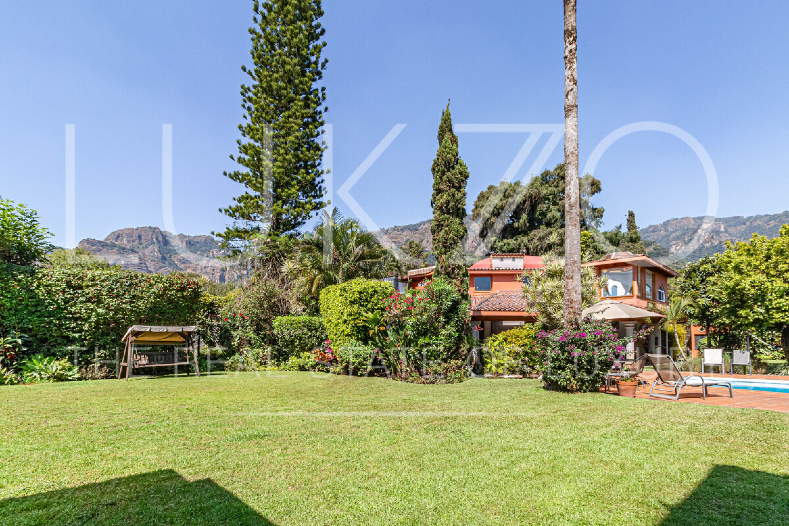 Rodeada de jardines con arboles de ornato y frutales, río con nenúfares y peces además de tener una alberca con agua templada.