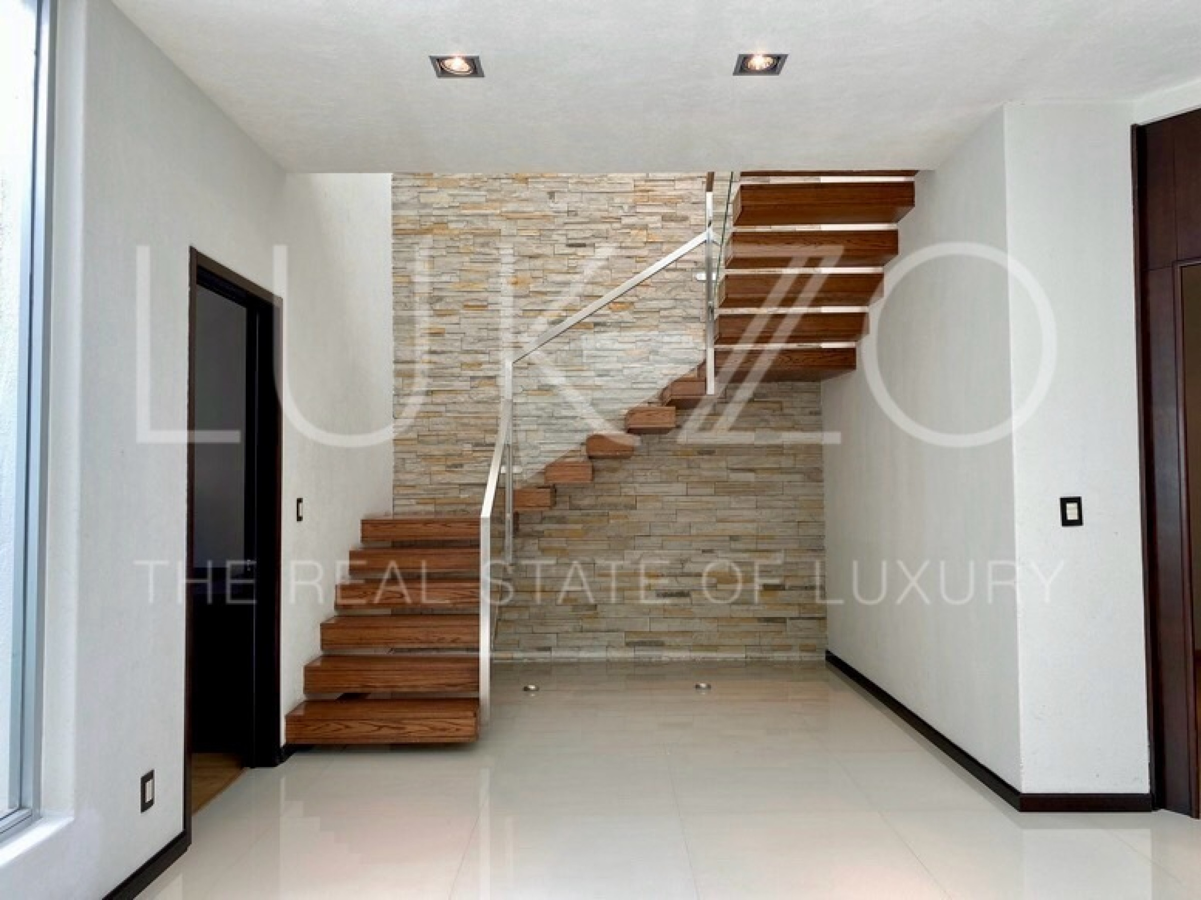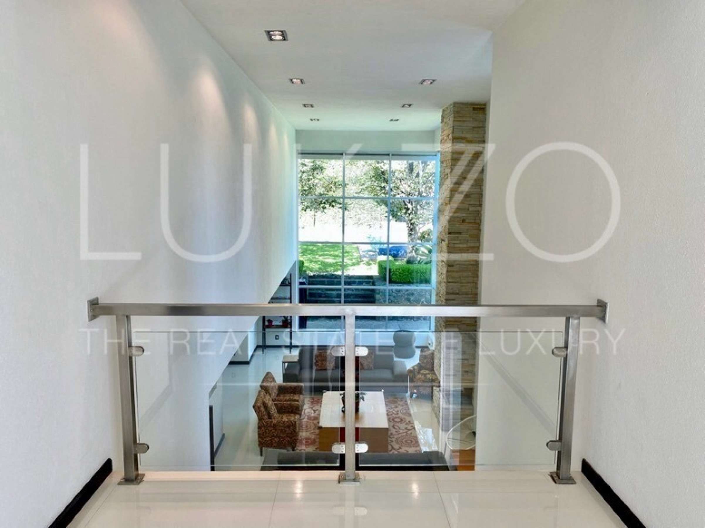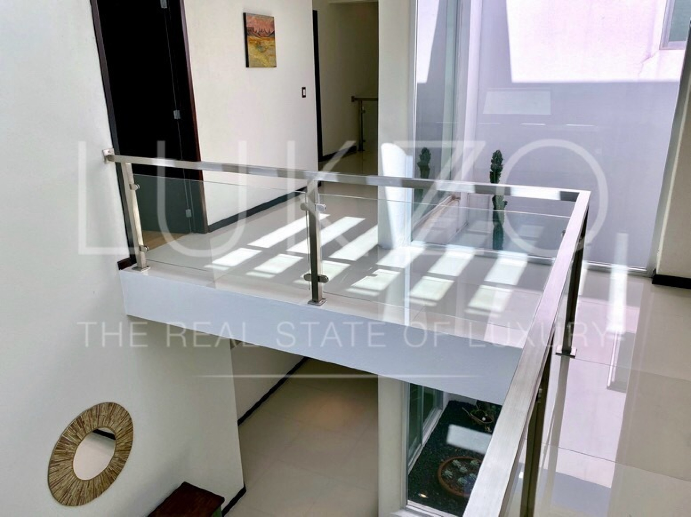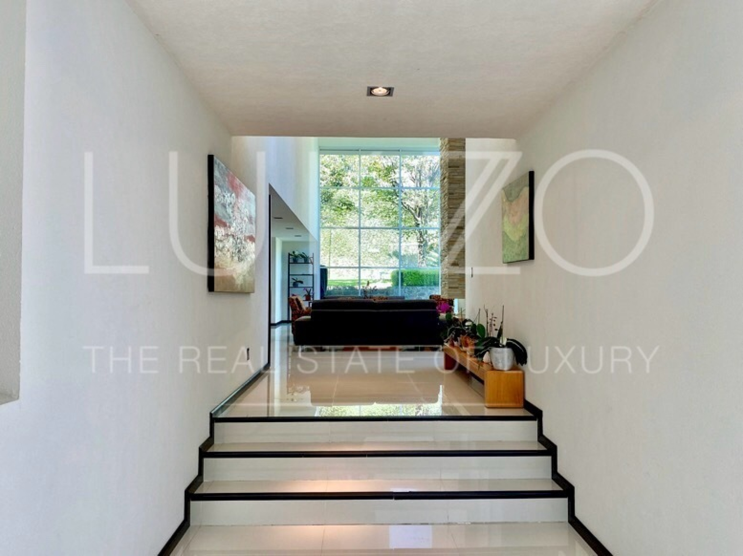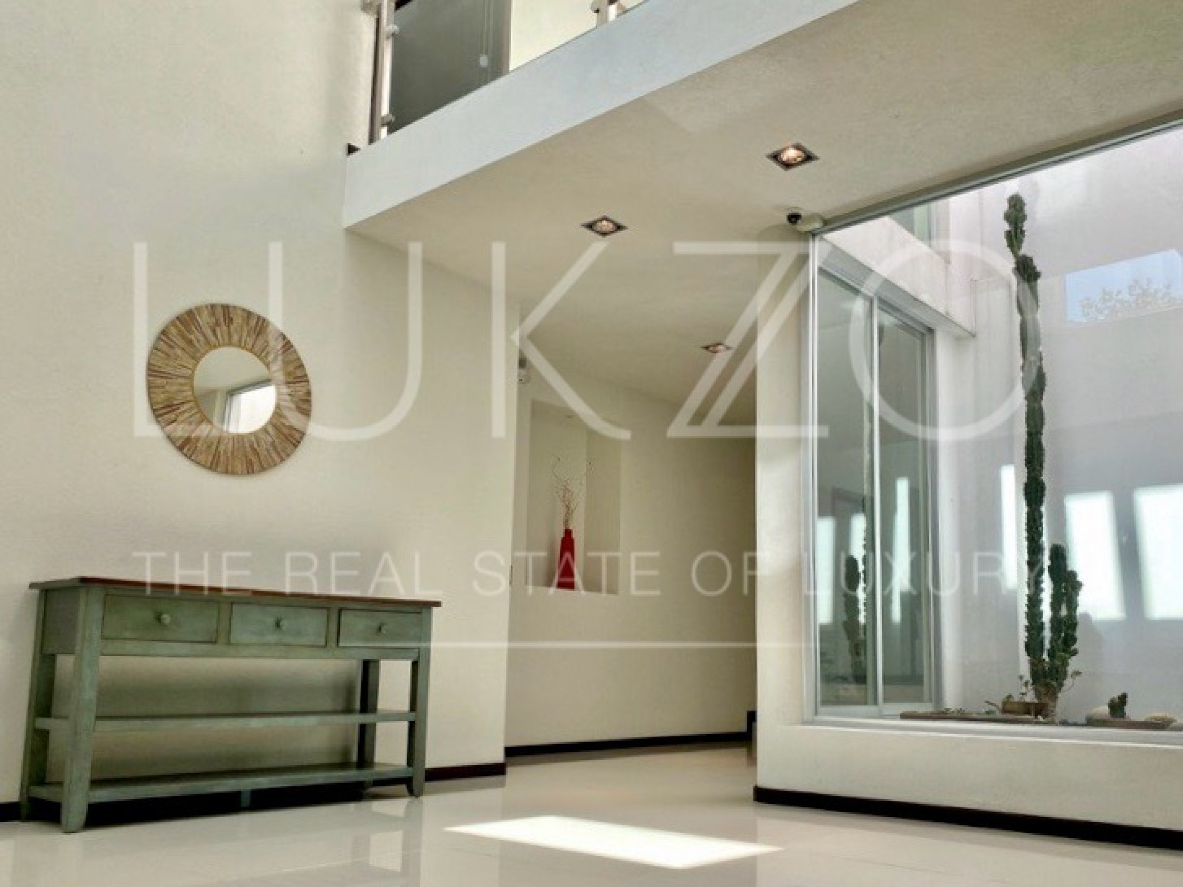 Entrando por el recibidor de doble altura tenemos, al frente, un pequeño jardín interior y acceso a una recámara con baño y closet, el estudio, baño de visitas y la escalera que nos lleva a la planta alta con cuarto de TV y 3 recámaras más, con baño y clóset. La principal cuenta con vestidor, aire acondicionado y tina de hidromasaje.