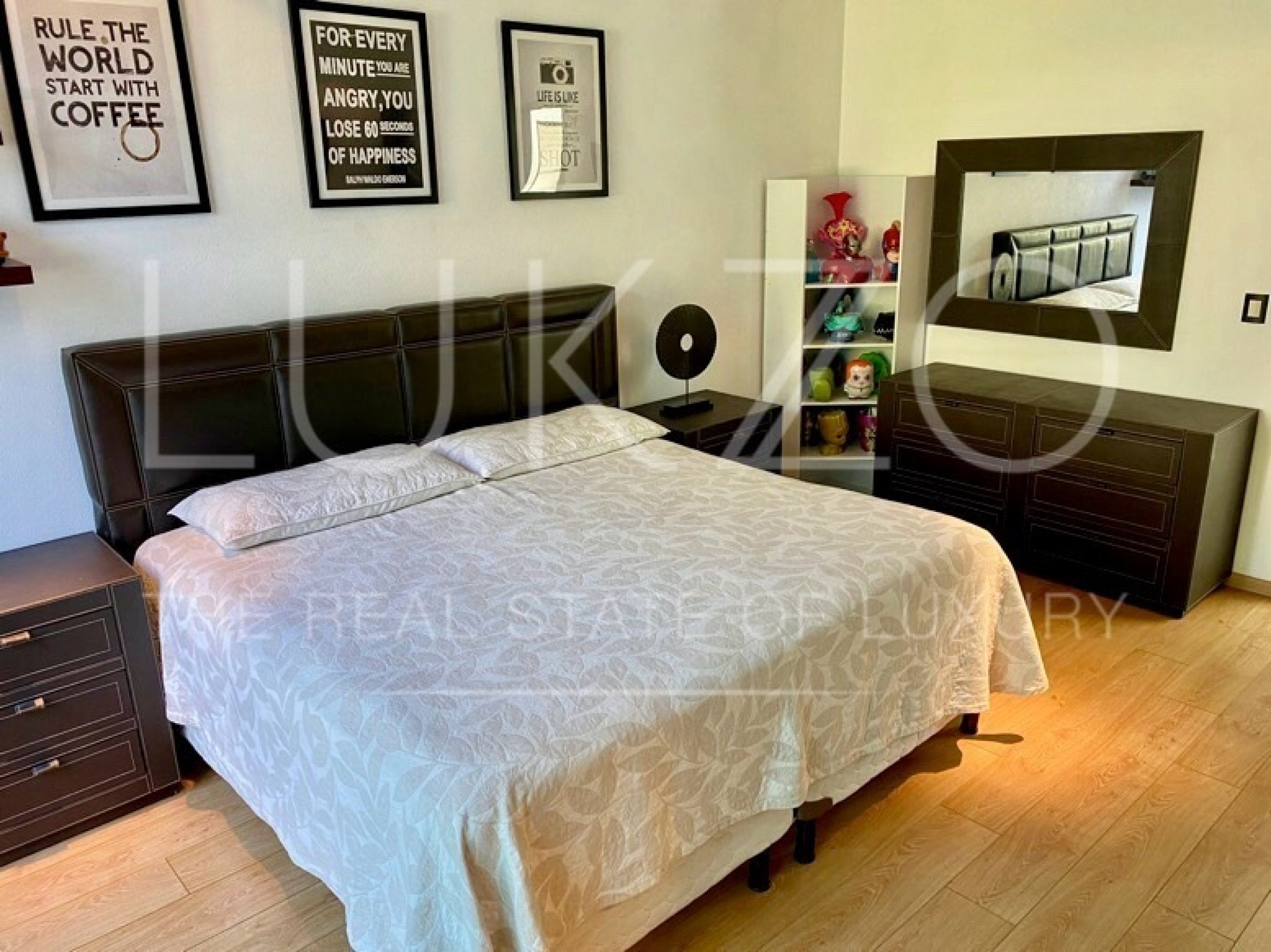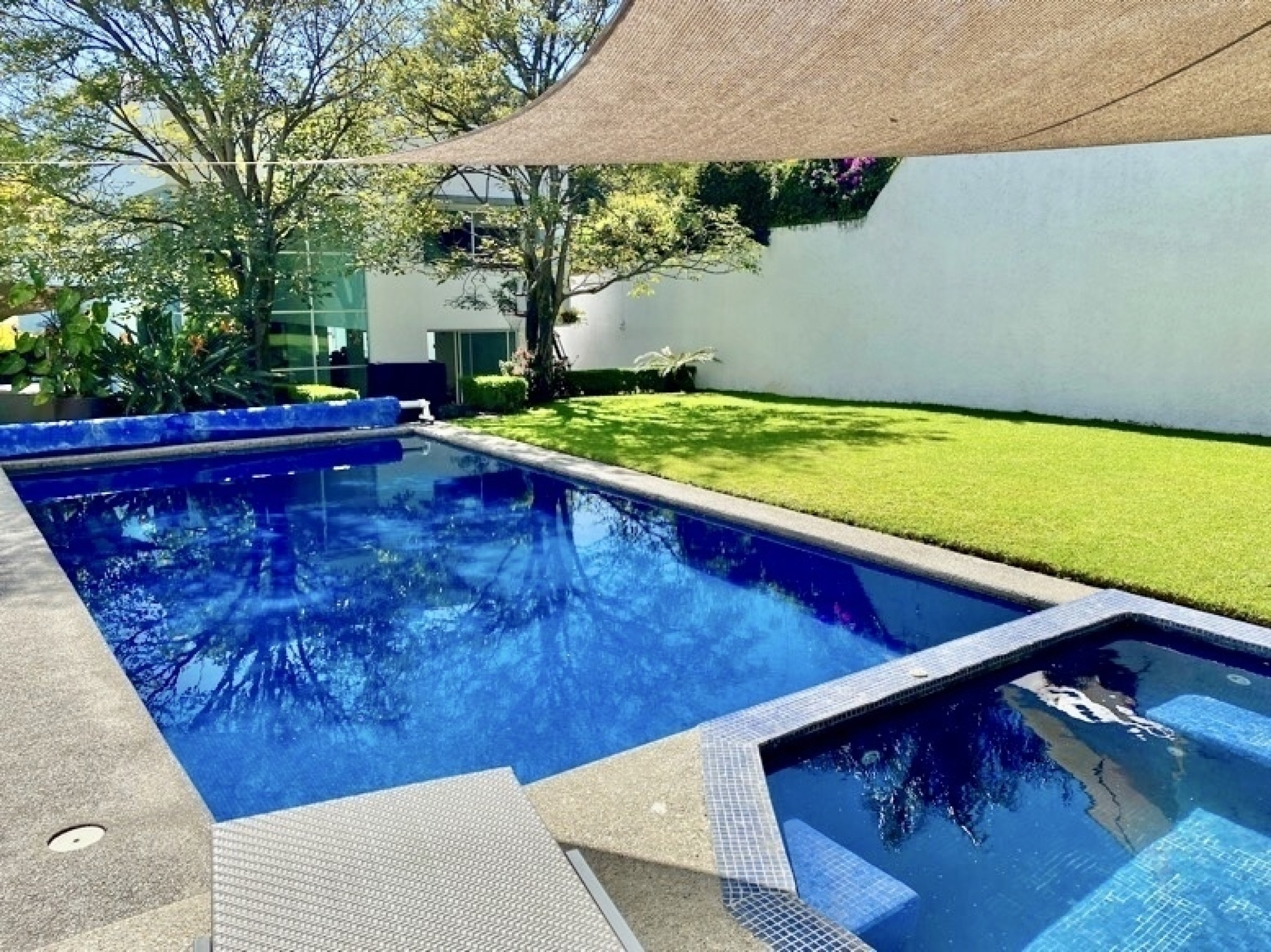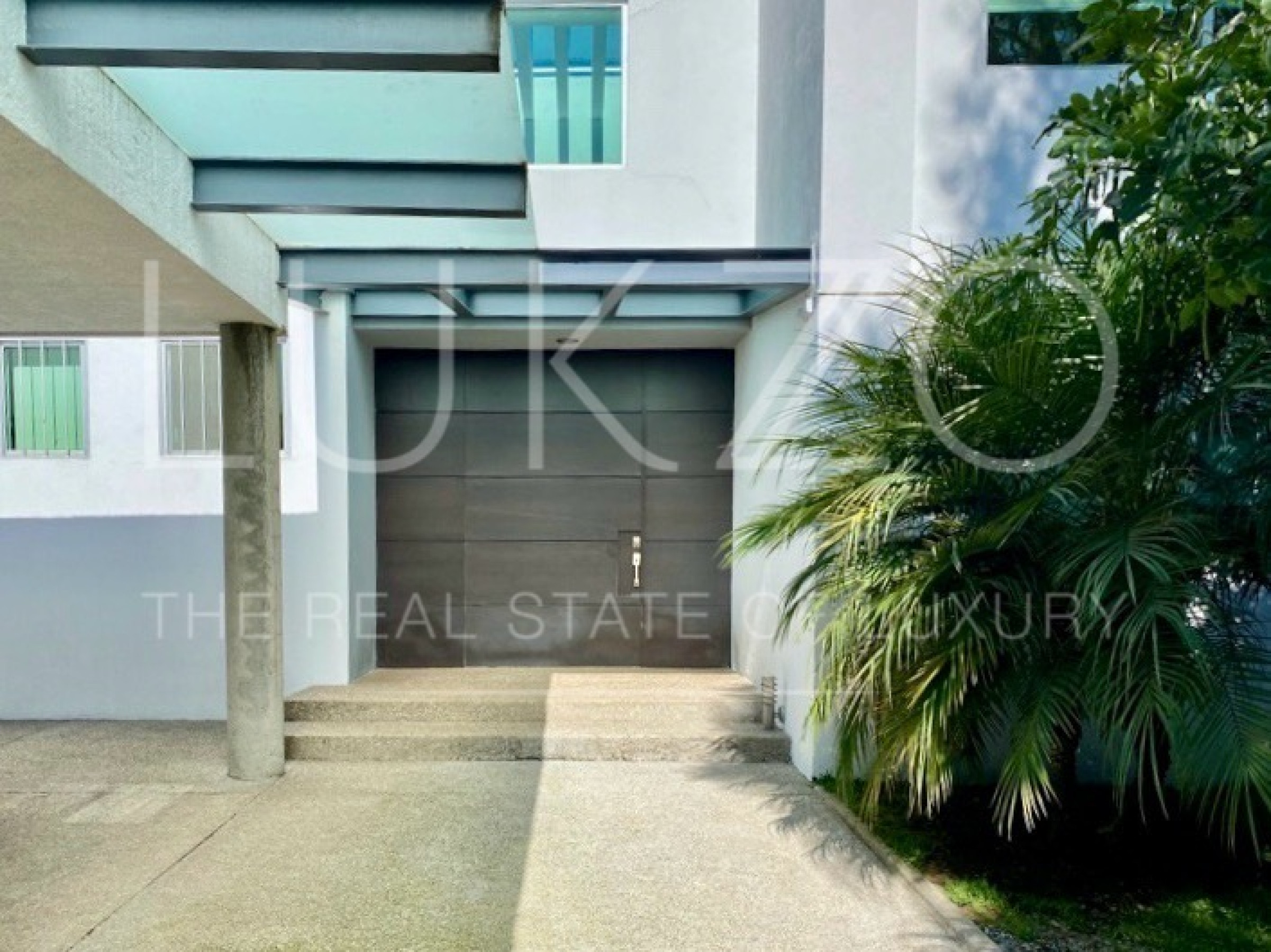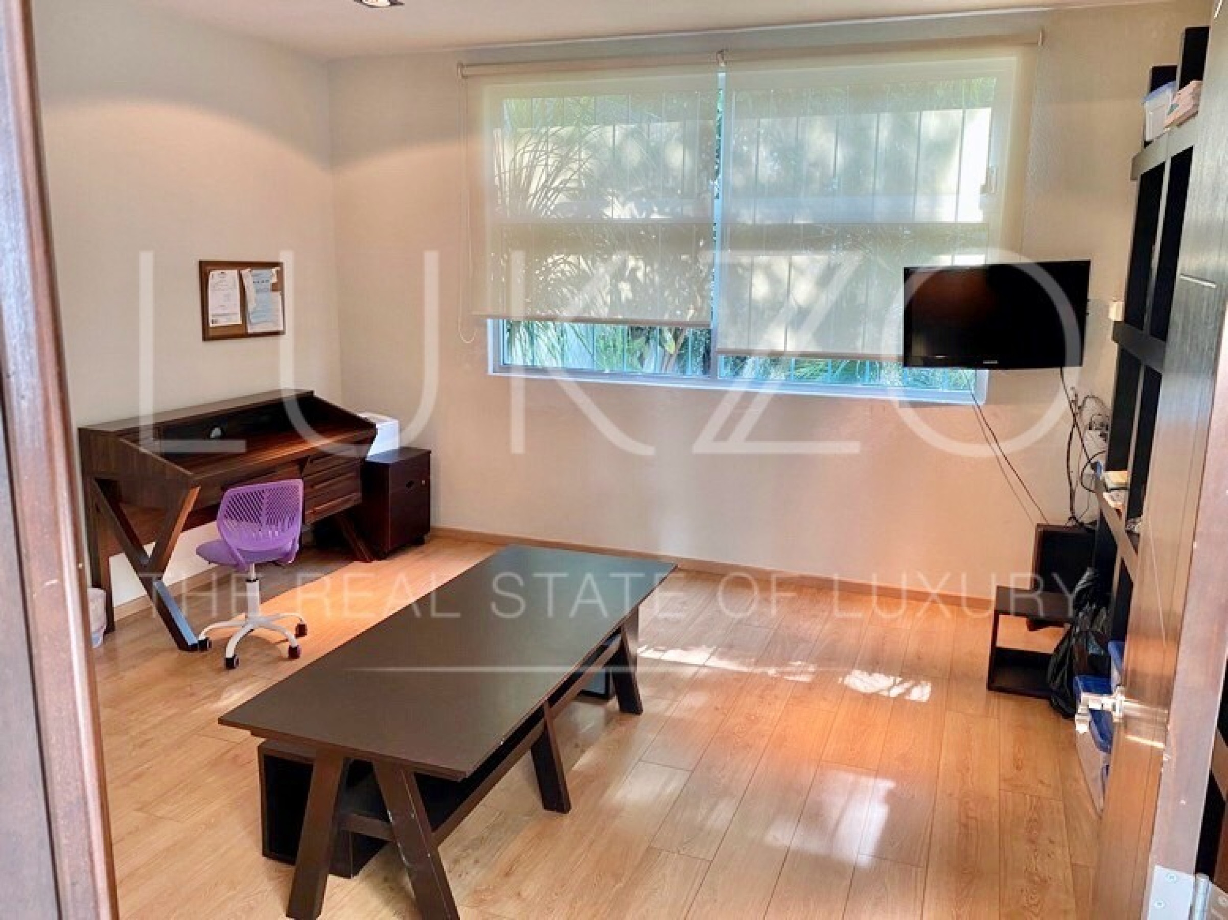 Entrando por el recibidor de doble altura tenemos, al frente, un pequeño jardín interior y acceso a una recámara con baño y closet, el estudio, baño de visitas y la escalera que nos lleva a la planta alta con cuarto de TV y 3 recámaras más, con baño y clóset. La principal cuenta con vestidor, aire acondicionado y tina de hidromasaje.