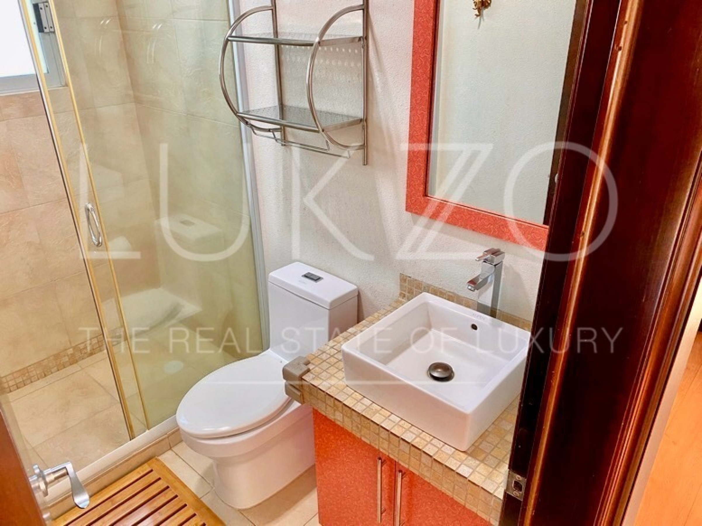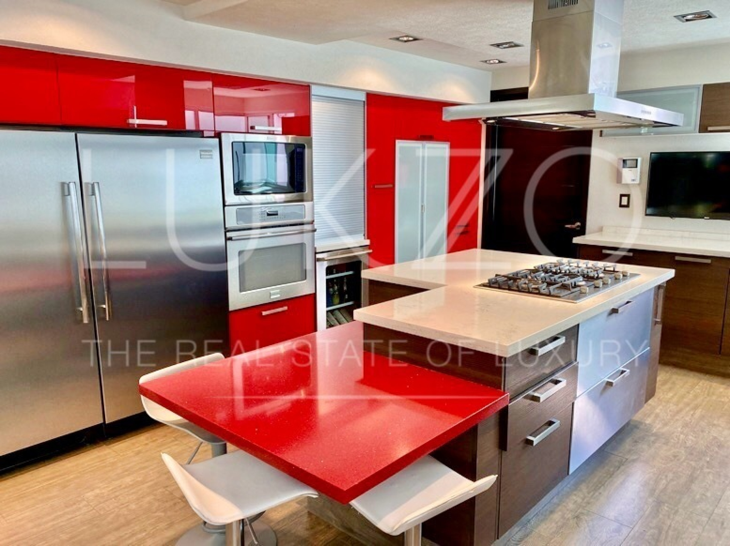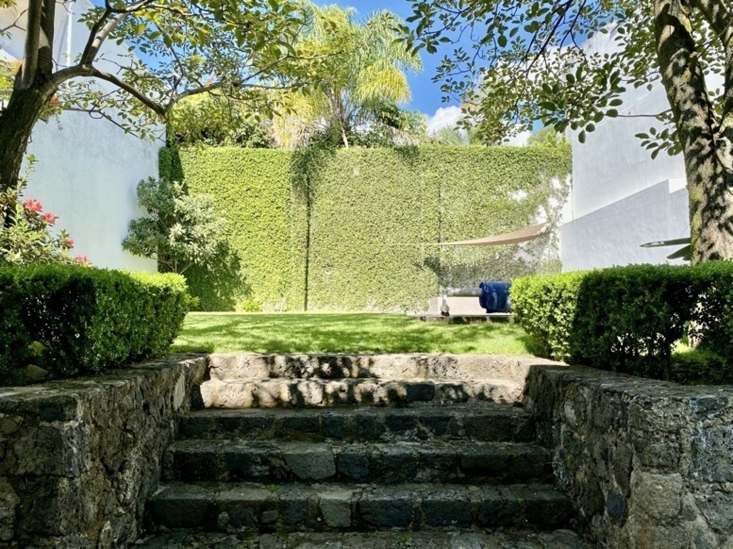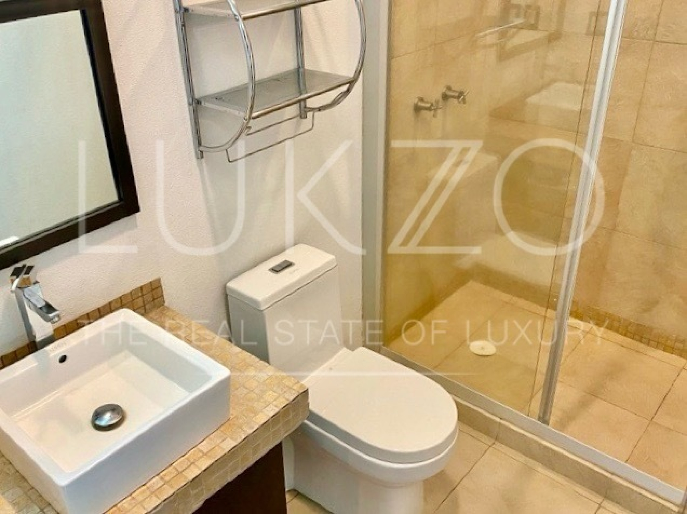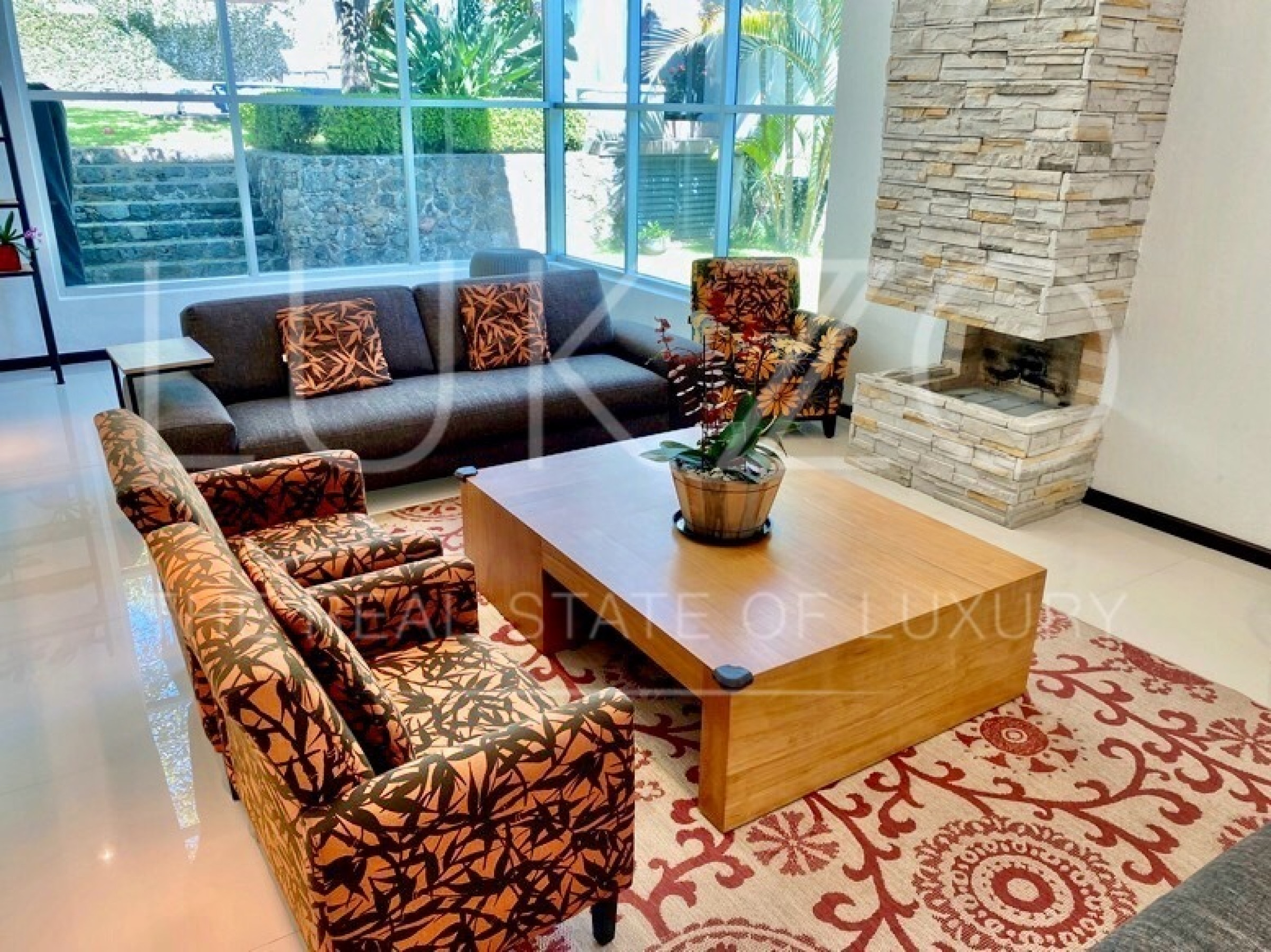 Entrando por el recibidor de doble altura tenemos, al frente, un pequeño jardín interior y acceso a una recámara con baño y closet, el estudio, baño de visitas y la escalera que nos lleva a la planta alta con cuarto de TV y 3 recámaras más, con baño y clóset. La principal cuenta con vestidor, aire acondicionado y tina de hidromasaje.