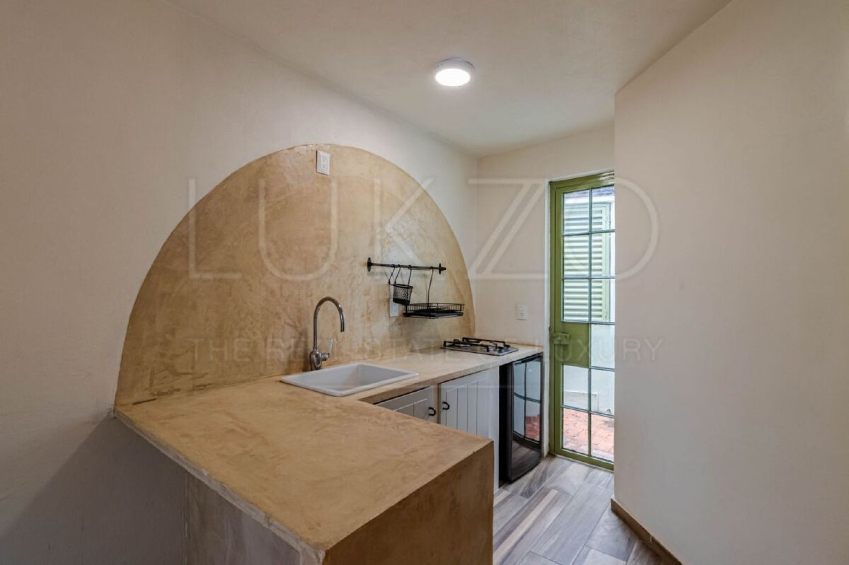 El desarrollo tiene dos niveles, y cuenta con dos recámaras con baño en planta alta, sala, comedor, cocina abierta, terraza exterior con comedor y balcón orientado hacia el oeste para disfrutar el atardecer.
