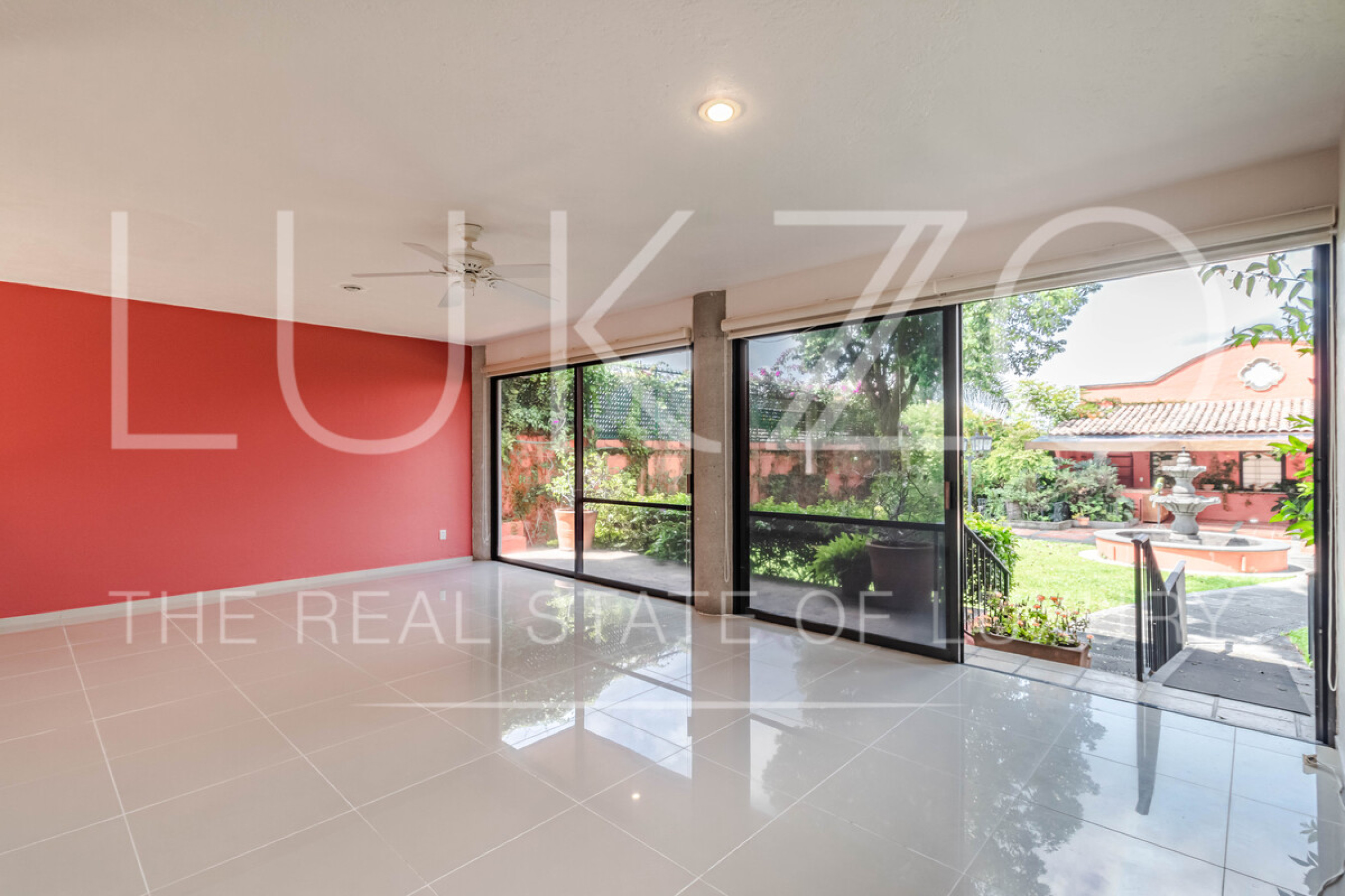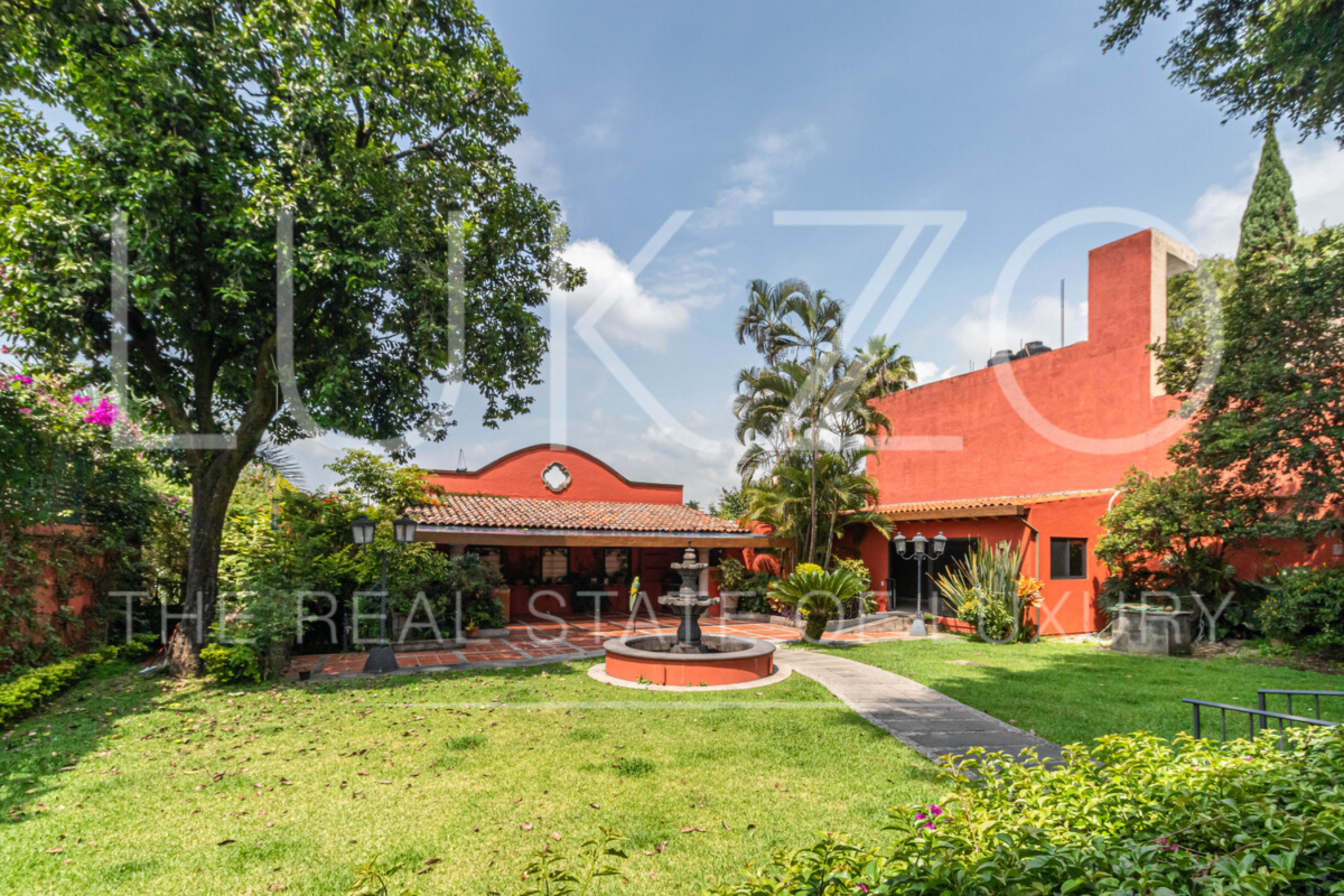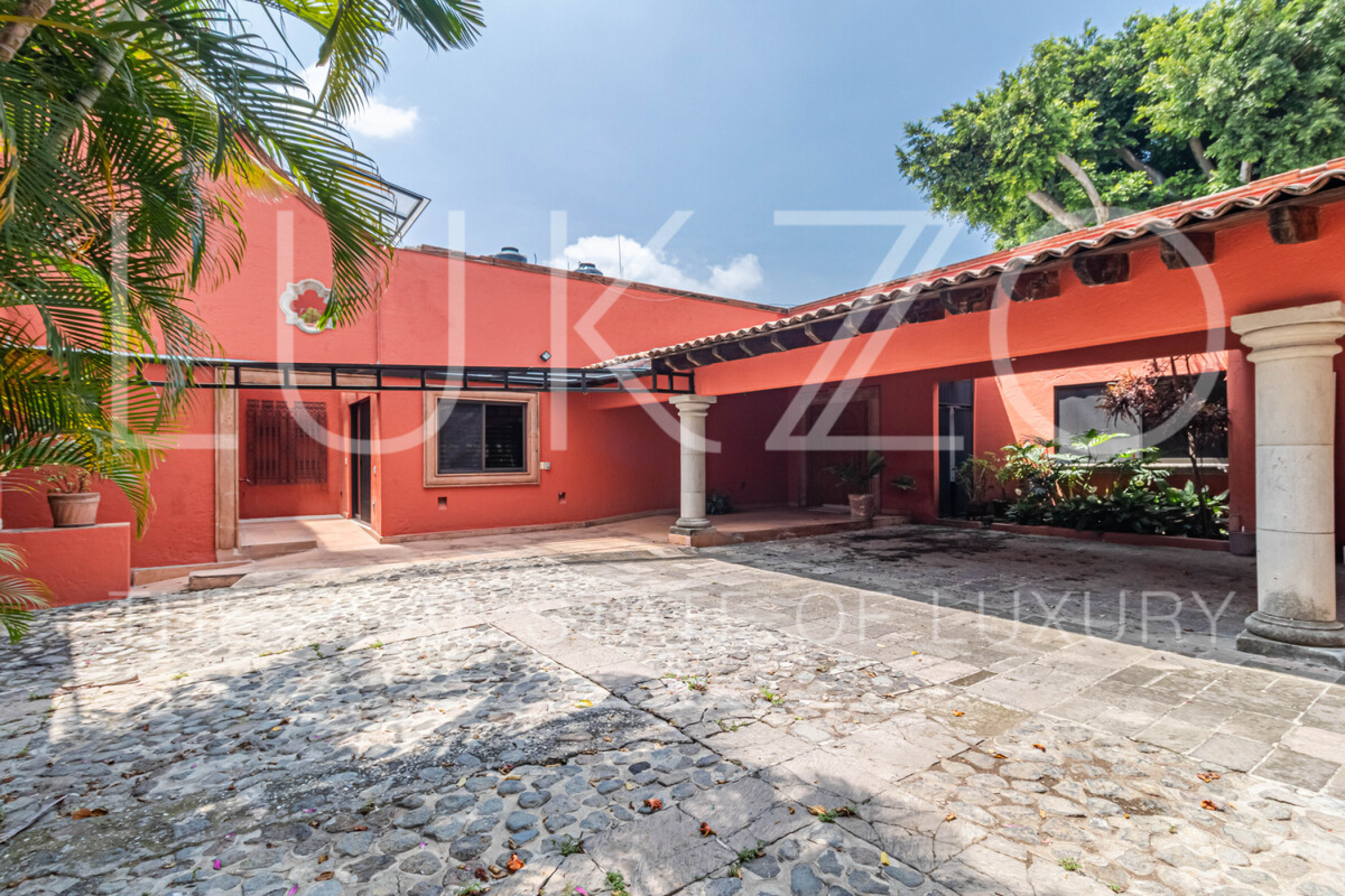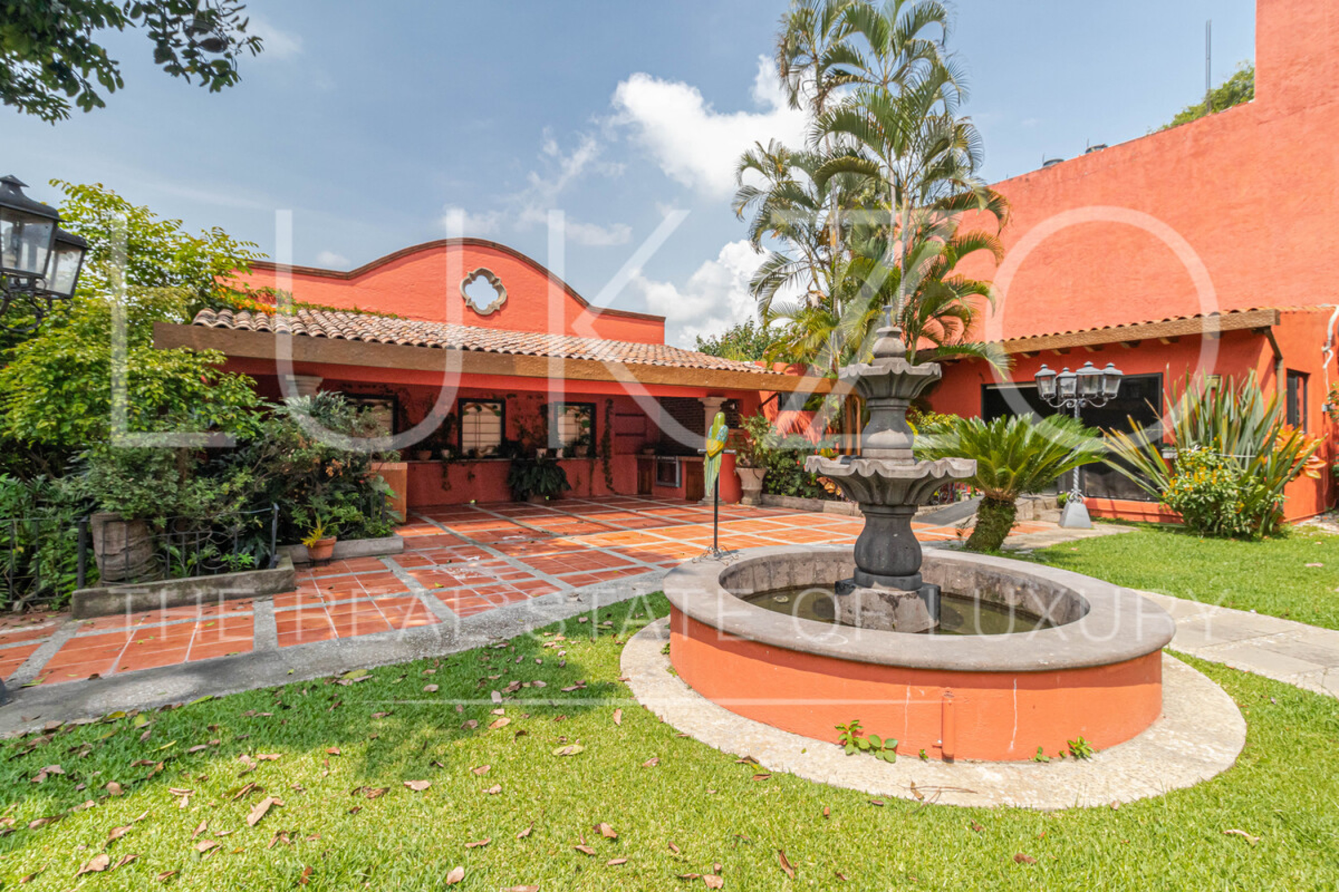 Residencia estilo mexicano ubicada en Palmira, Cuernavaca, sobre un terreno de 1,086 m² con ligera pendiente, construida en un solo nivel y en excelente estado de conservación. La casa cuenta con espacios amplios y luminosos: sala, comedor, antecomedor y una cocina equipada, distribuidos equilibradamente para la convivencia y el confort. Dispone de cinco recámaras, cada una con su baño propio, además de medio baño para visitas. Entre sus amenidades destacan varios espacios de servicio: cuarto de servicio con baño, lavandería, tres bodegas, estudio, bungalow independiente, terraza con barra y jardín extenso con sistema de riego por aspersión. Asimismo se encuentran estacionamiento para seis autos, portón eléctrico, sistema hidroneumático, agua potable con dos tomas, closet de blancos, closet de visitas, clima instalado por medio de cinco minisplits y adaptaciones que permiten tener mascotas. Esta propiedad, construida aproximadamente en el año 2000, ofrece privacidad, funcionalidad y un ambiente ideal para quienes buscan confort y elegancia en una sola planta.