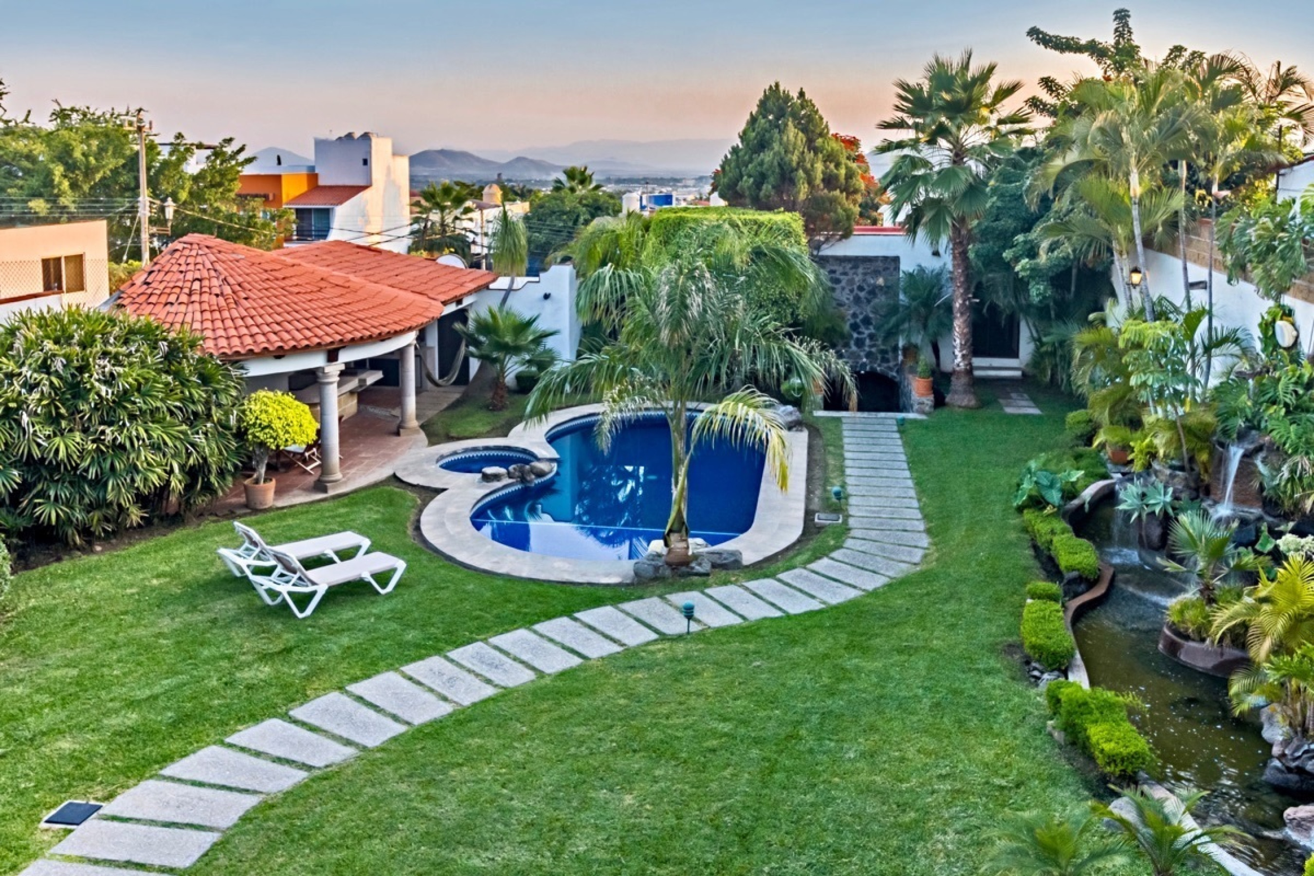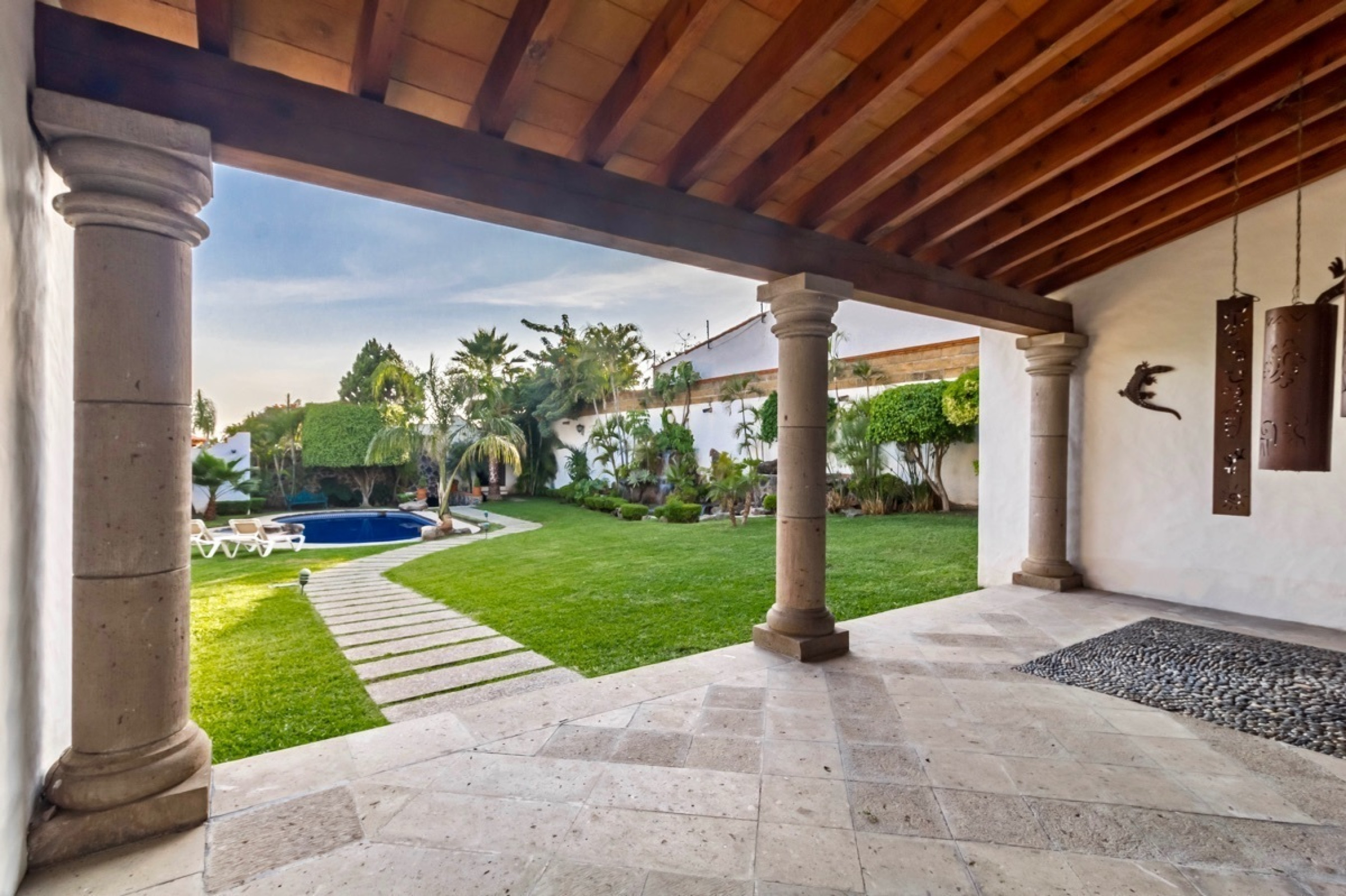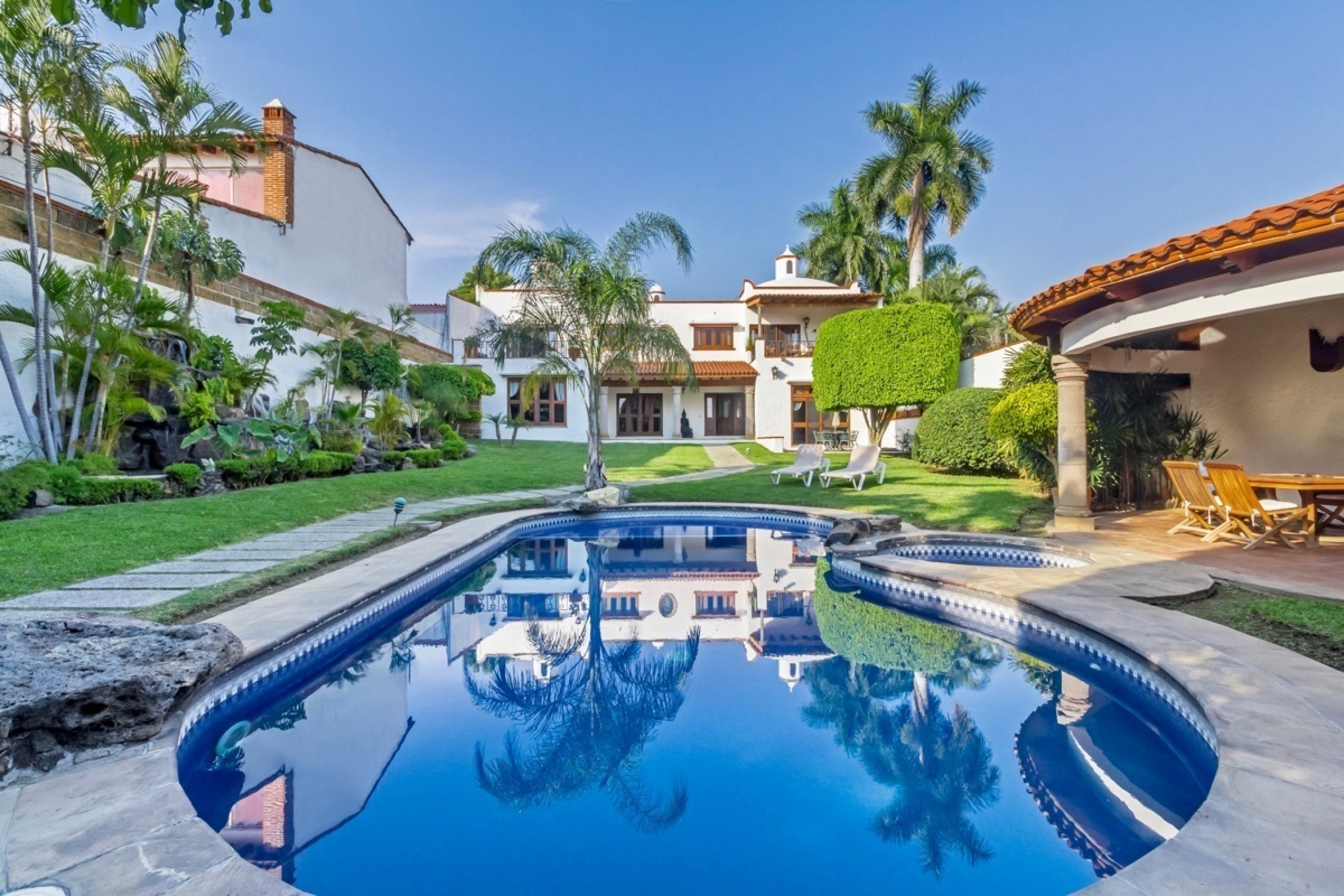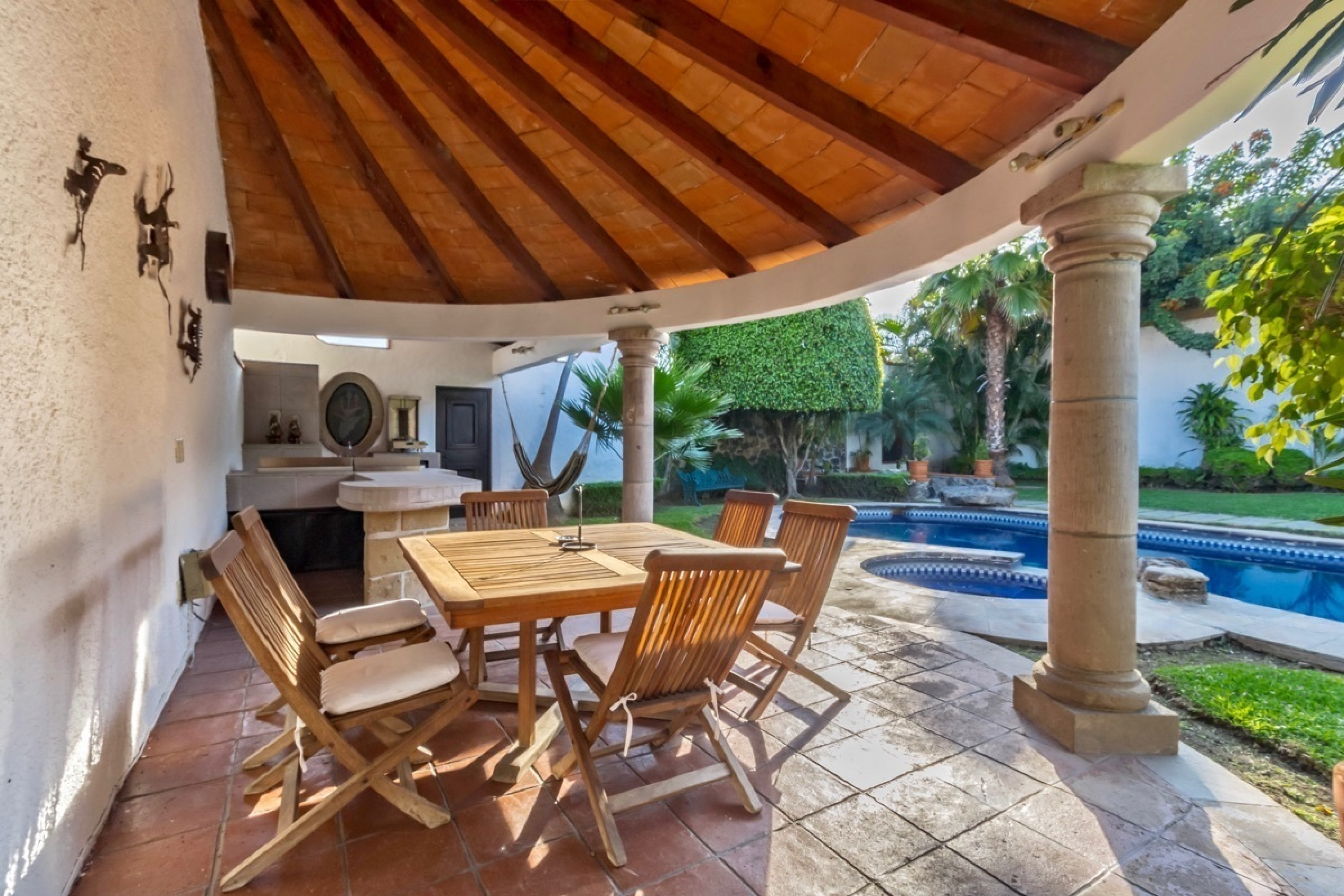 Residencia estilo colonial mexicano, ubicada en fraccionamientos en Temixco. La casa cuenta con bovedas, un patio interior con fuente, vigas de madera en techos y canceleria de madera en las ventanas. Los baños son modernos y las regaderas con canceles de cristal templado. La cocina y tiene barra para desayuno. La terraza cuenta con plancha de Tepanyaki, asador, horno y un rosticero vertical. Es perfecta para disfrutar reuniones con familiares y amigos. El jardin tiene plantas maduras y el sonido de la cascada exterior invita a meditar o pasar la tarde leyendo un buen libro. El bungalow con una recamara y baño completo es ideal para recibir invitados. Por la autopista es muy facil llegar a centros comerciales como Forum o Averanda.