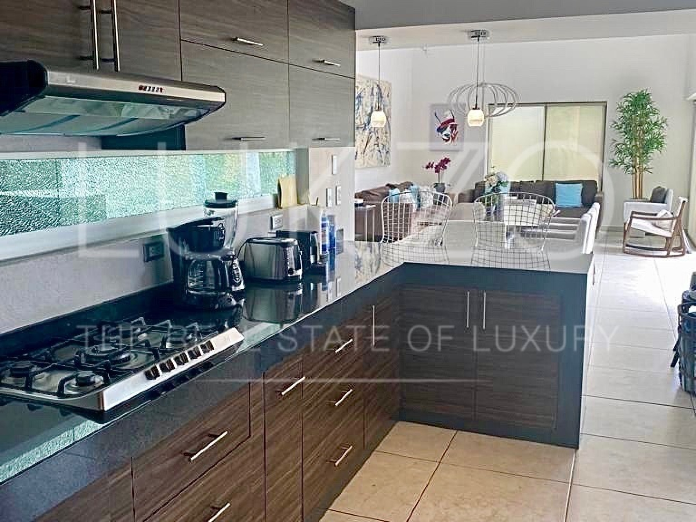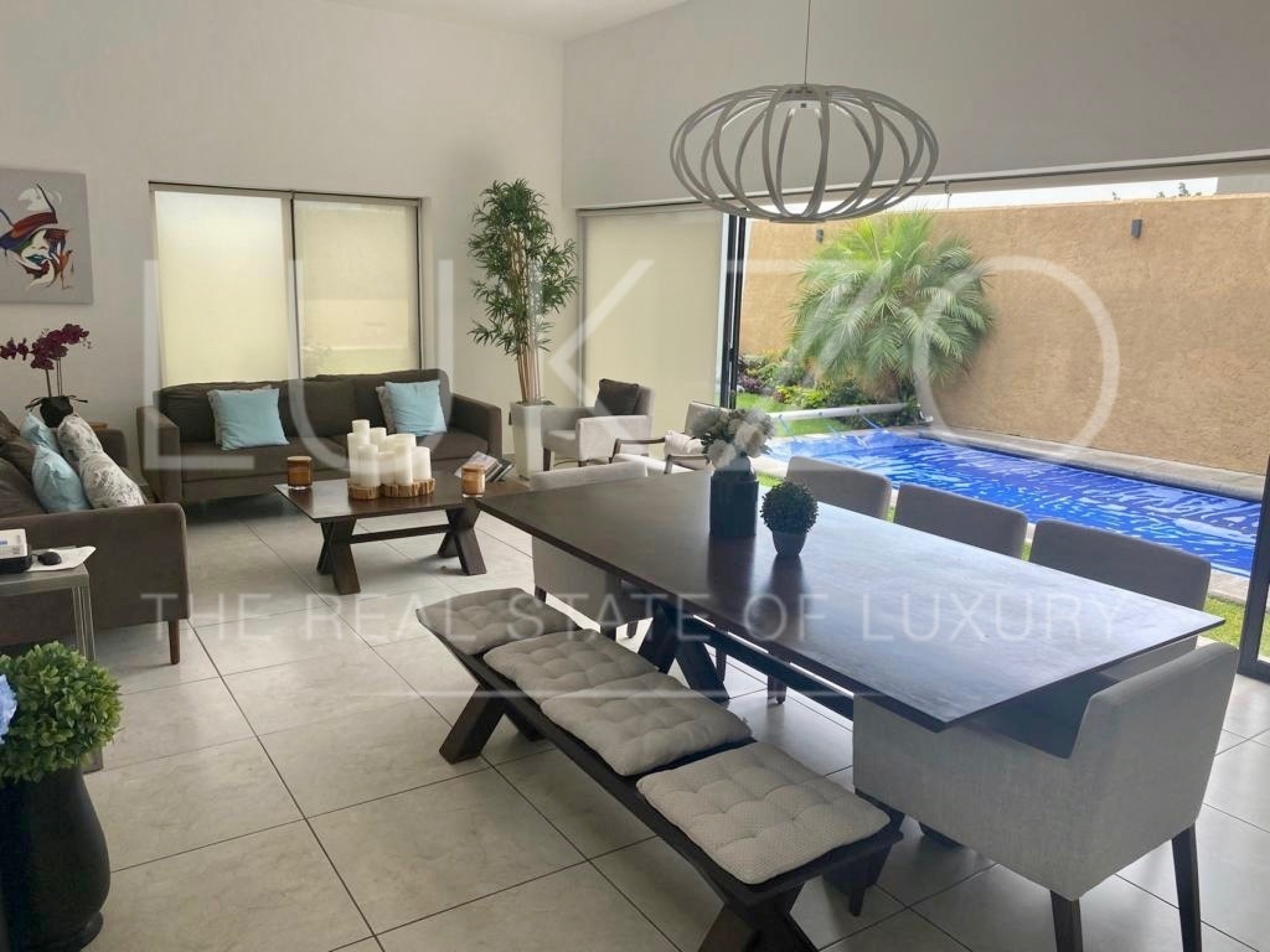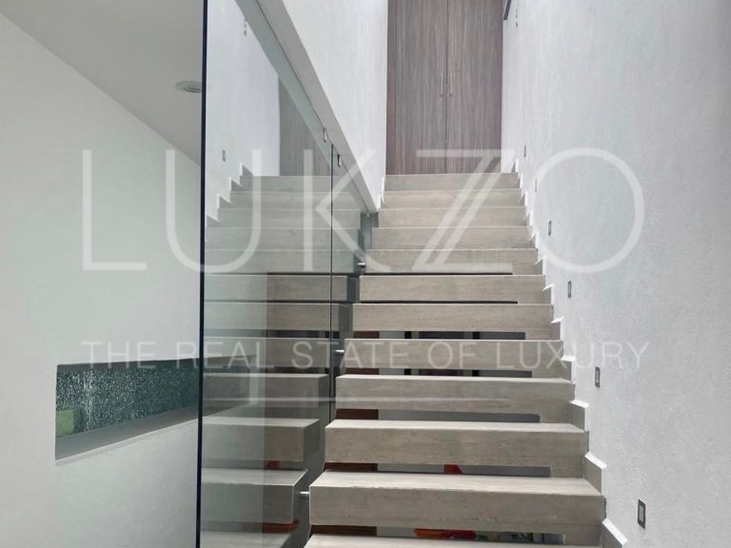 En el interior de la casa encontrarás una sala, comedor y cocina equipada con barra. En planta baja encontrarás 2 recámaras, cada una con su propio baño, además de un medio baño de visitas. En la planta alta, hay tres recámaras más, todas con baño. La recámara principal cuenta con un vestidor para mayor comodidad.