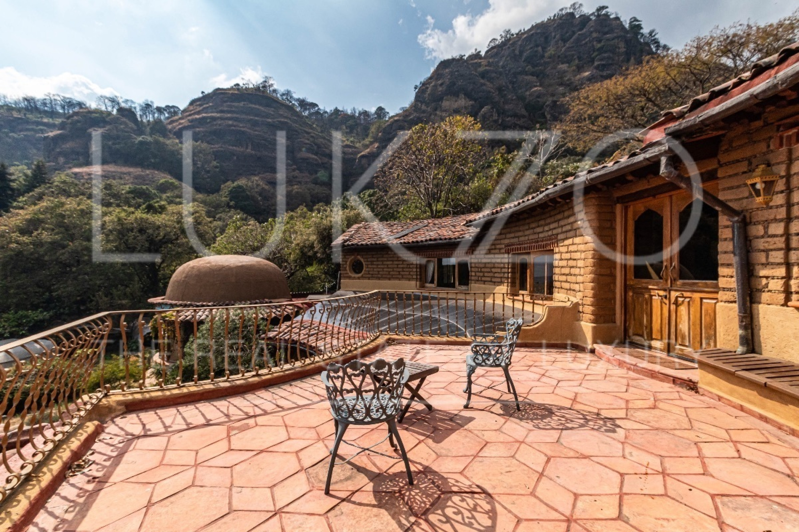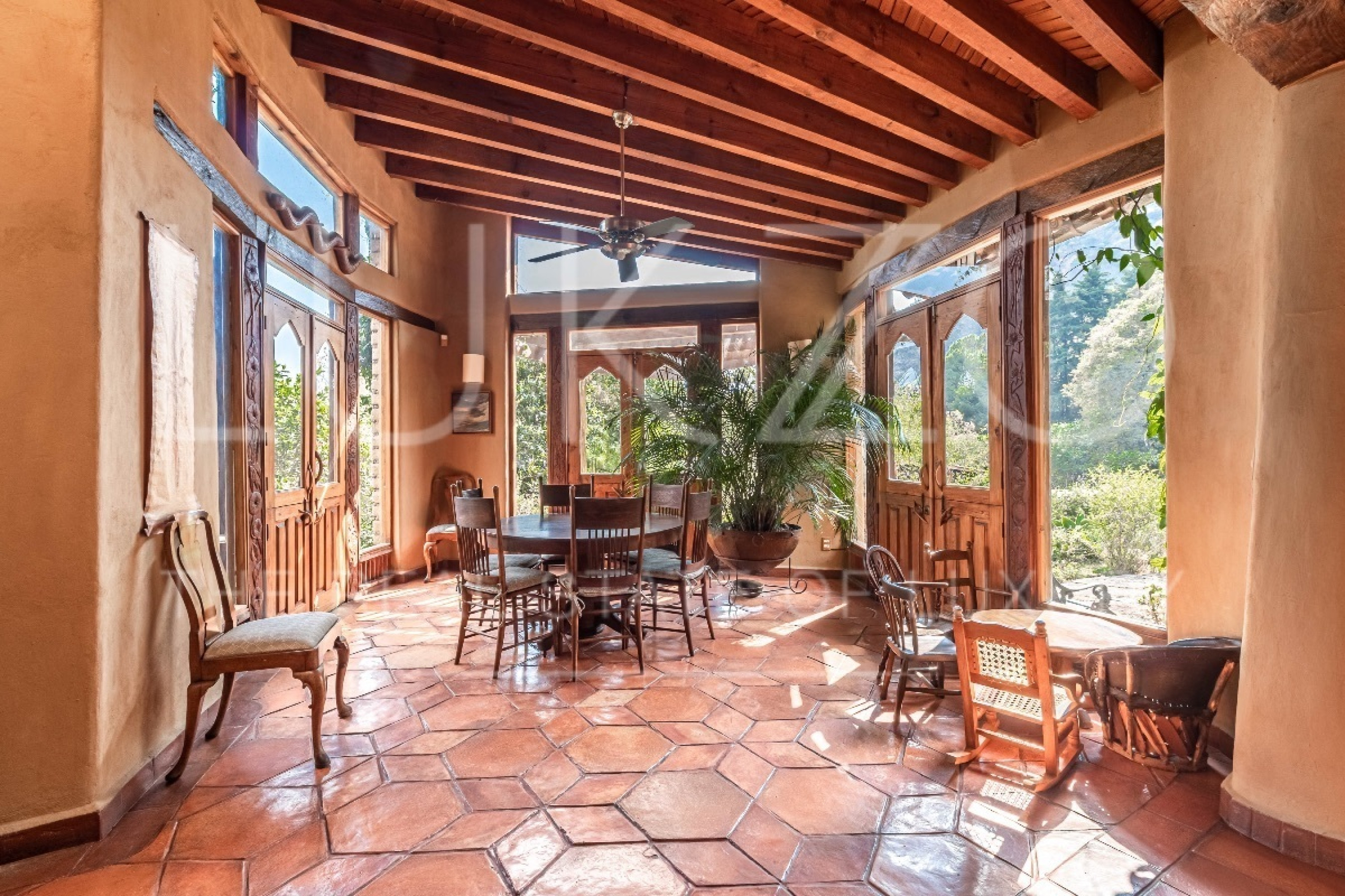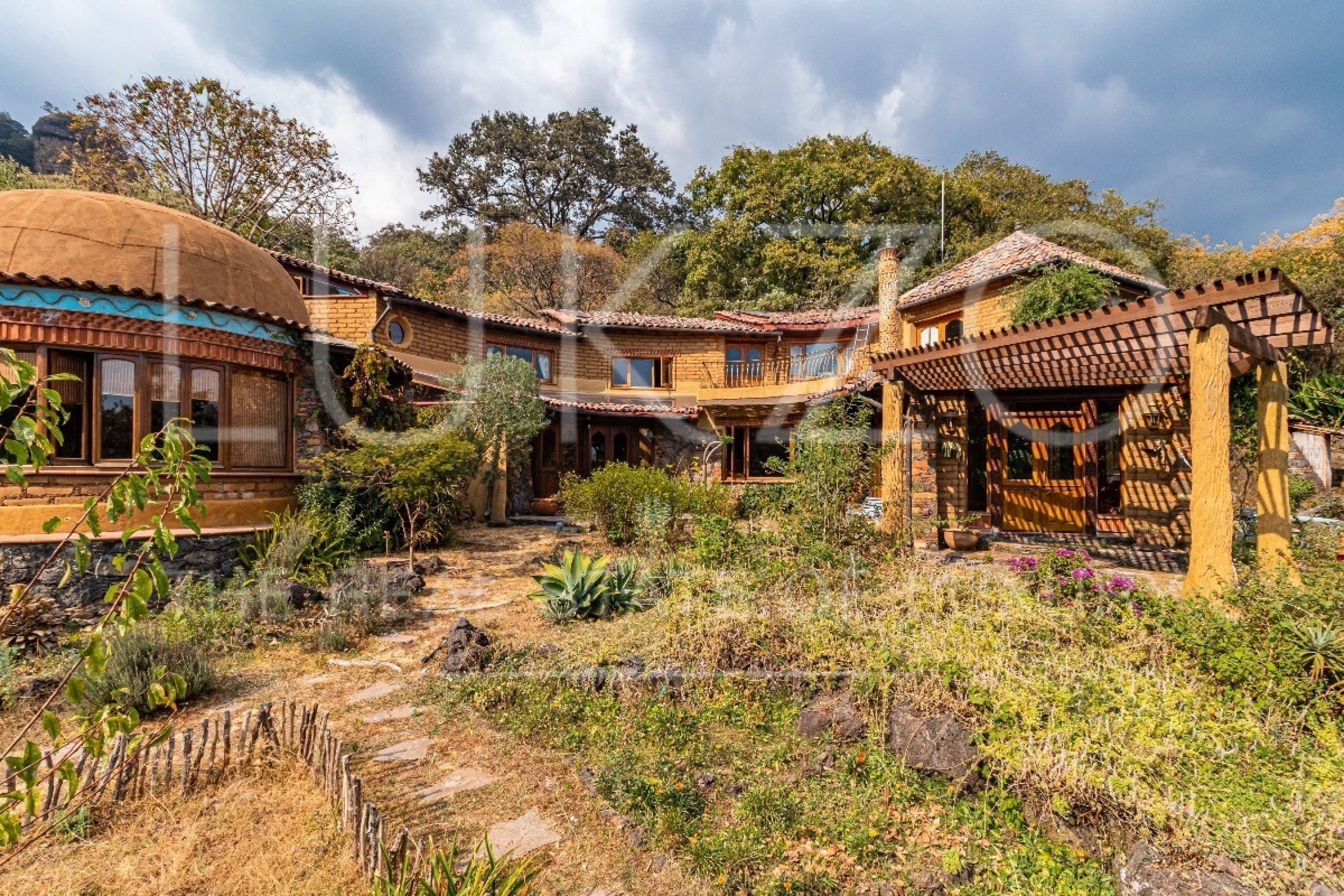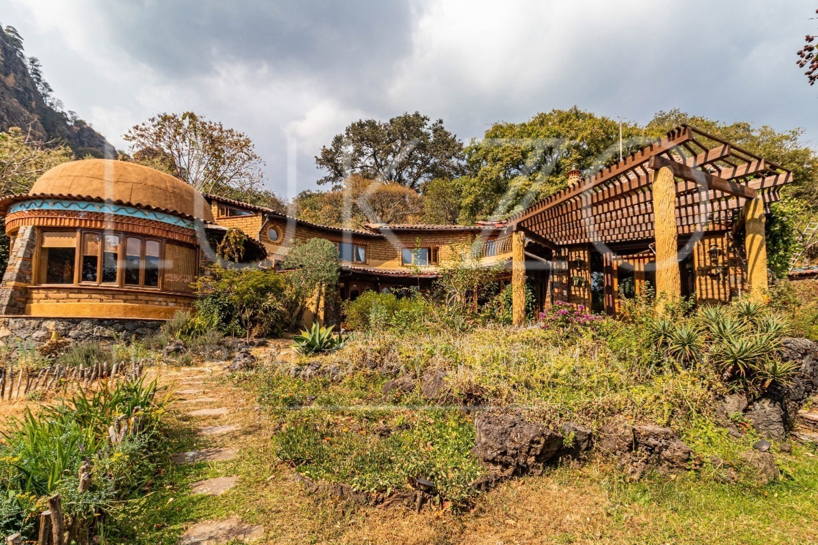 Diseñada por el arquitecto mexicano Michel Lewis, la casa está construida con piedra local y adobe, con techos altos, vigas de madera y vistas en todas las direcciones. Construida en una forma distintiva de media luna, la casa tiene tres dormitorios, tres baños, sala de estar, comedor, oficina y cocina. Los pisos son de baldosas tradicionales o de madera. Los espacios al aire libre, todo rodeado de jardines y árboles. Patio cercano a la cocina, perfecto para tomar un café por la mañana. Terraza cubierta afuera del comedor. Terraza en el segundo piso para tomar el sol y observar la luna. Una zona detrás de la casa, ideal para leer y tomar el té de la tarde. Ecovillage Huehuecoyotl es una comunidad asentada en una superficie de 20,797 m en la que se construyeron 14 residencias. Por su cercanía en la montaña, su entorno de bosque y acceso a casi 15,000 m de áreas comunes en las que se han implementado huertos, cocina comunitaria, salón de trabajo y área de jardín para eventos. Cesión de derechos.