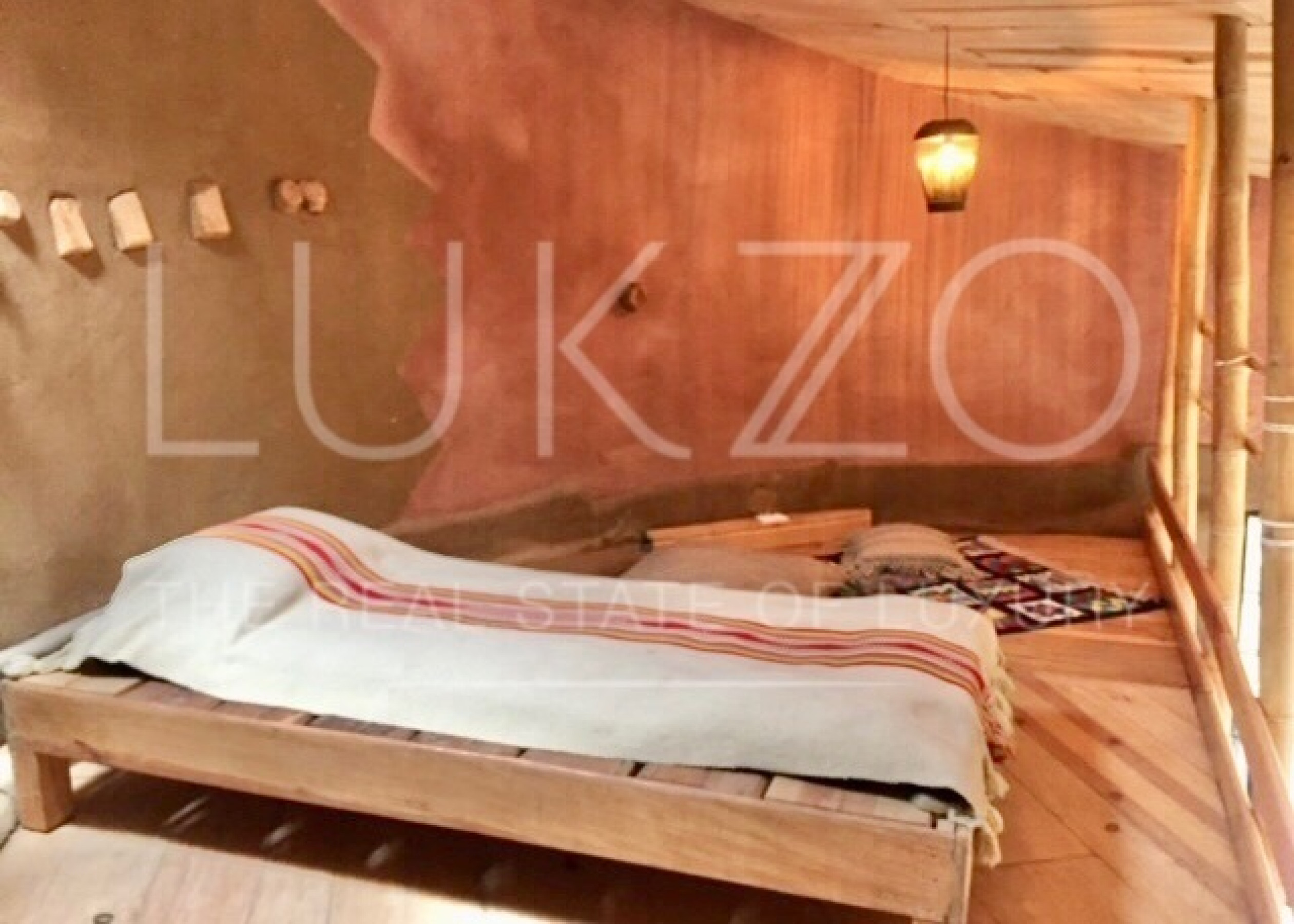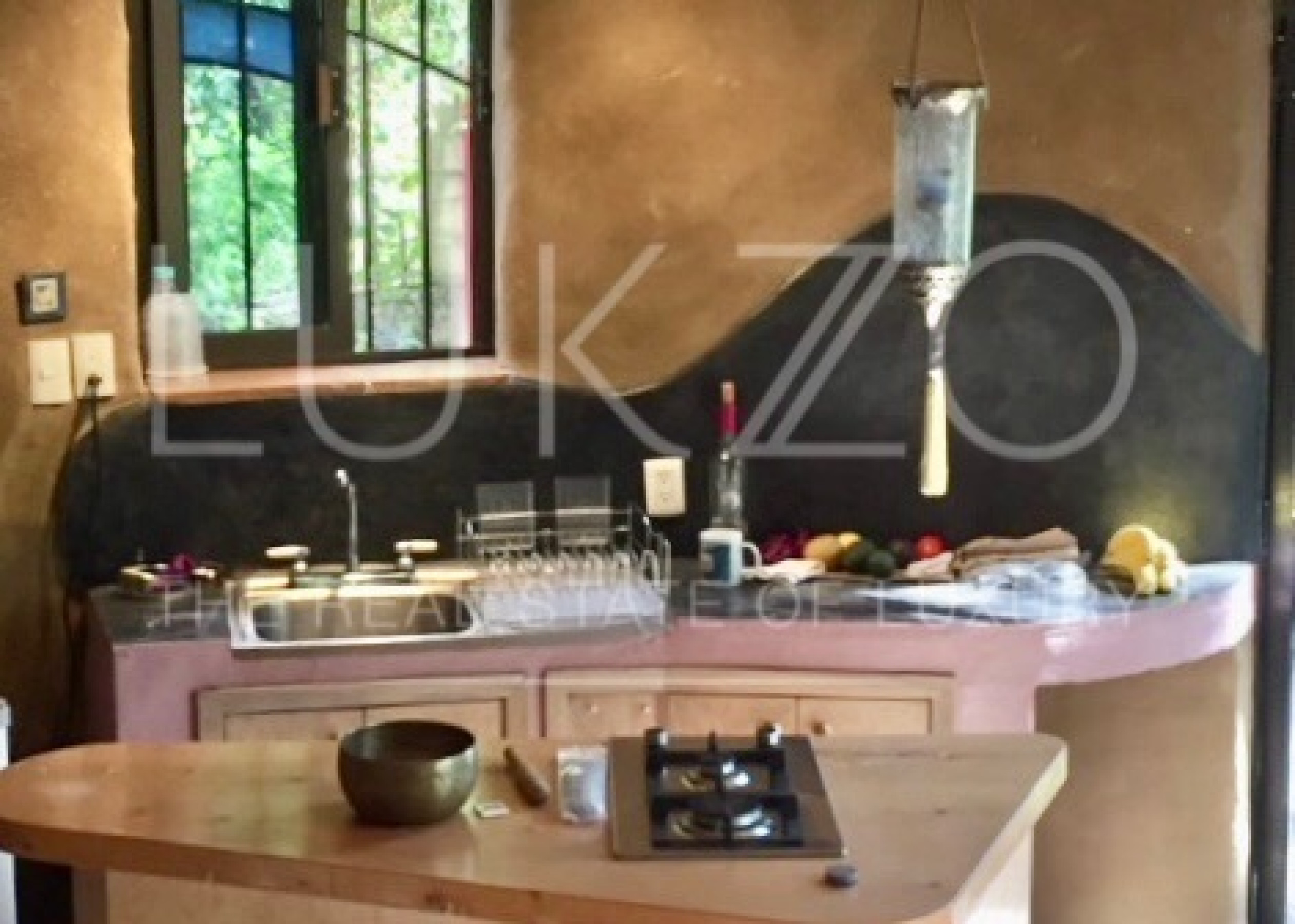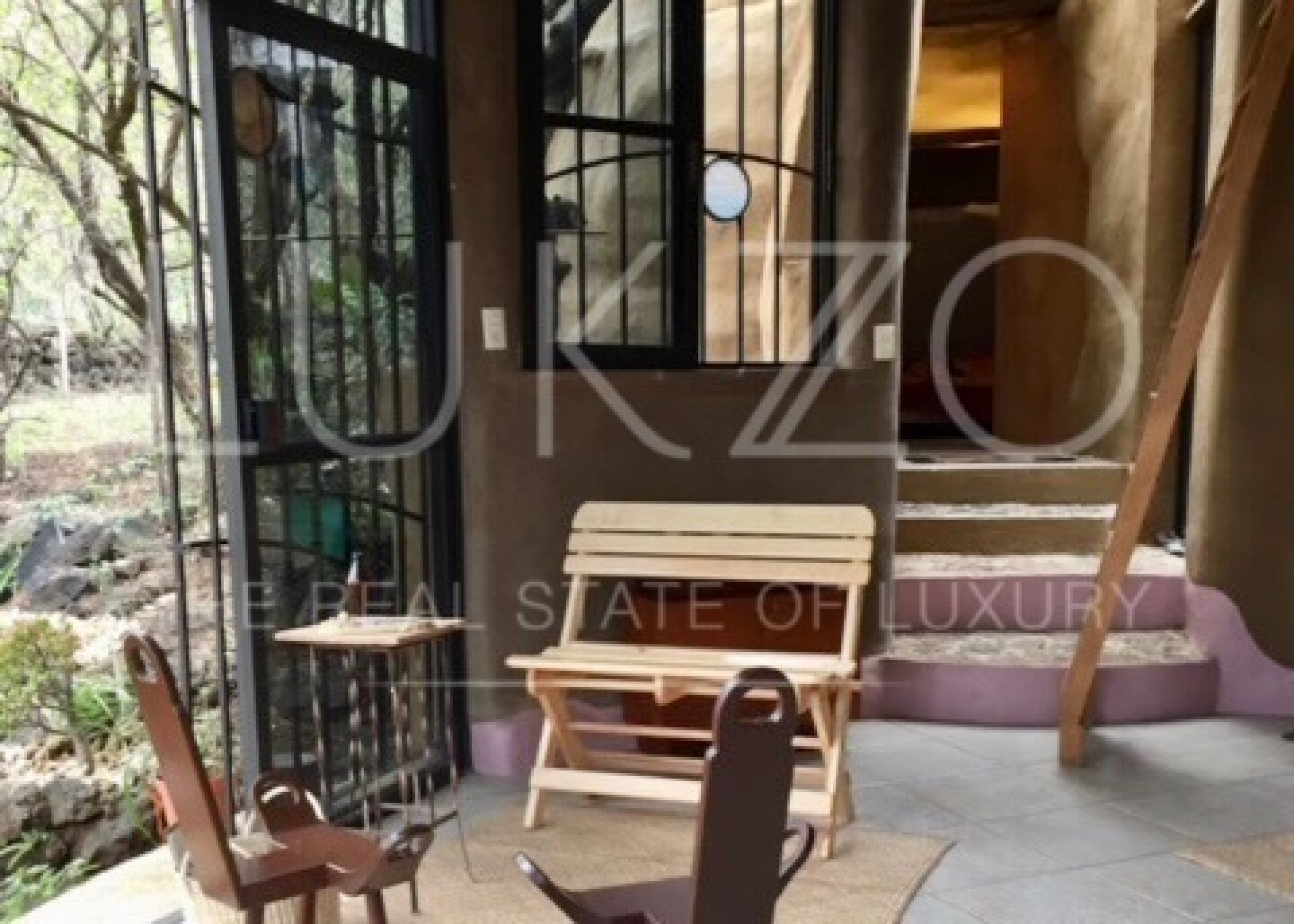 Original y única, construcción de superadobe y madera. Respetando el entorno natural, la casa está construida alrededor de un Árbol de Copal y las fachadas replican la silueta de las montañas.