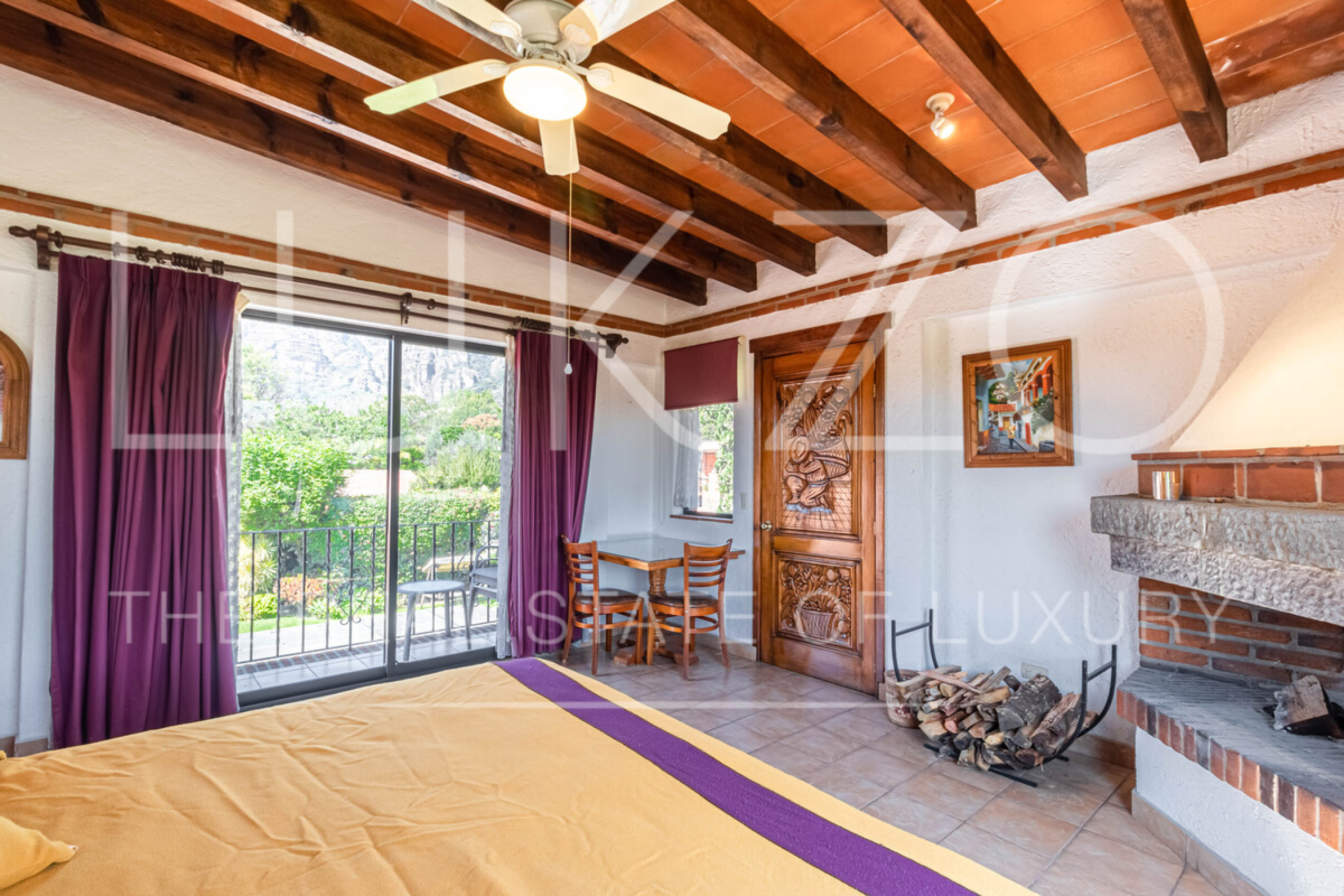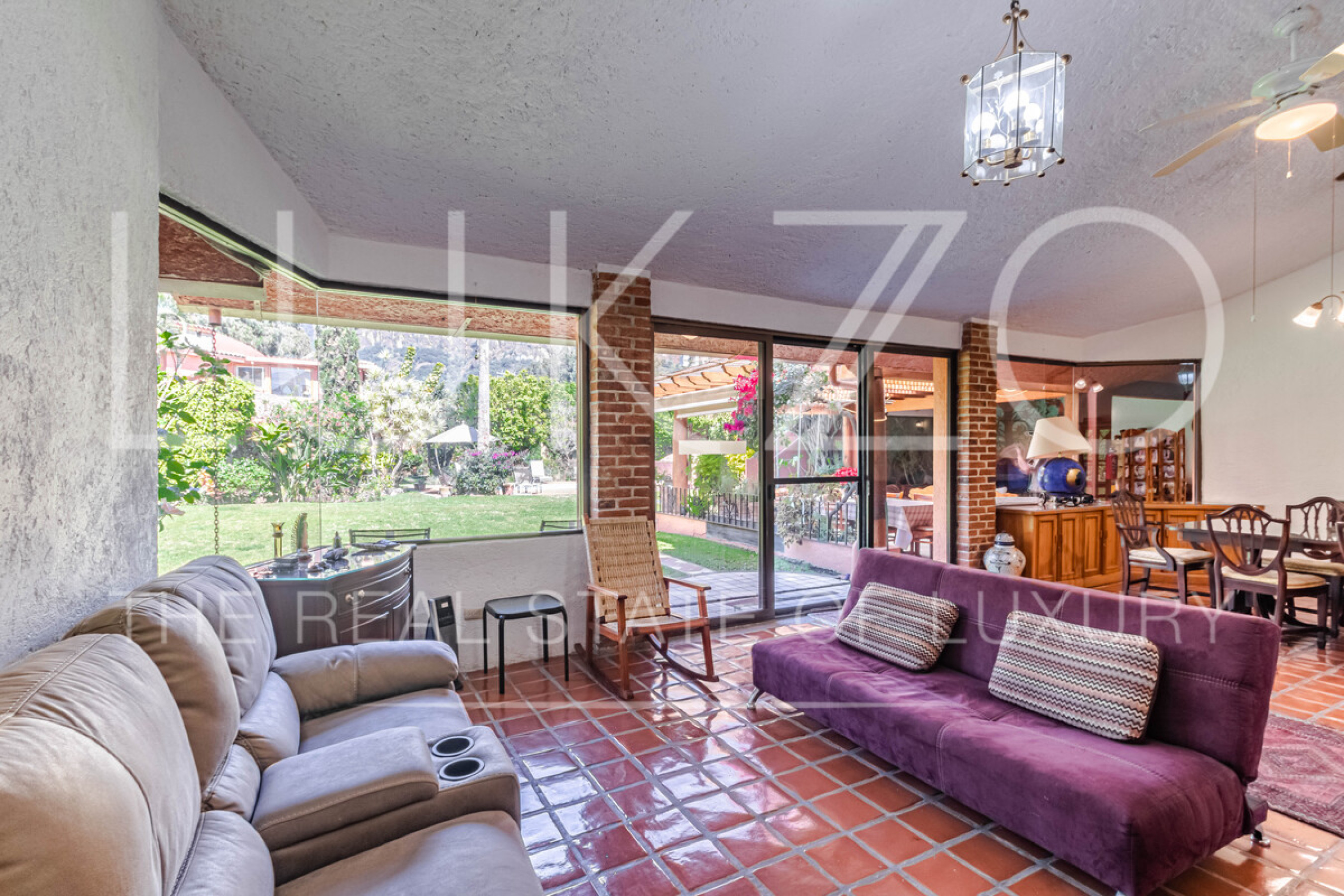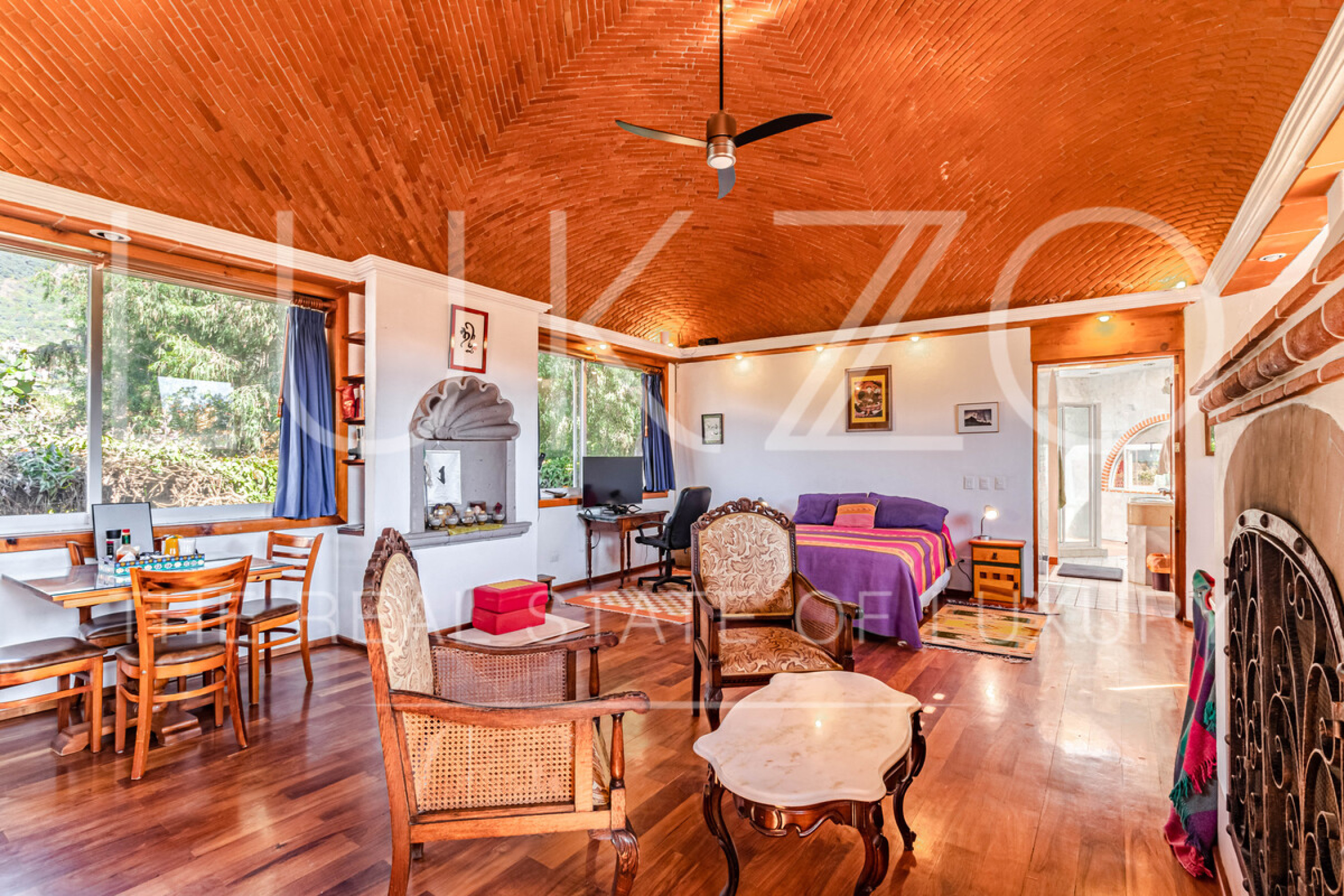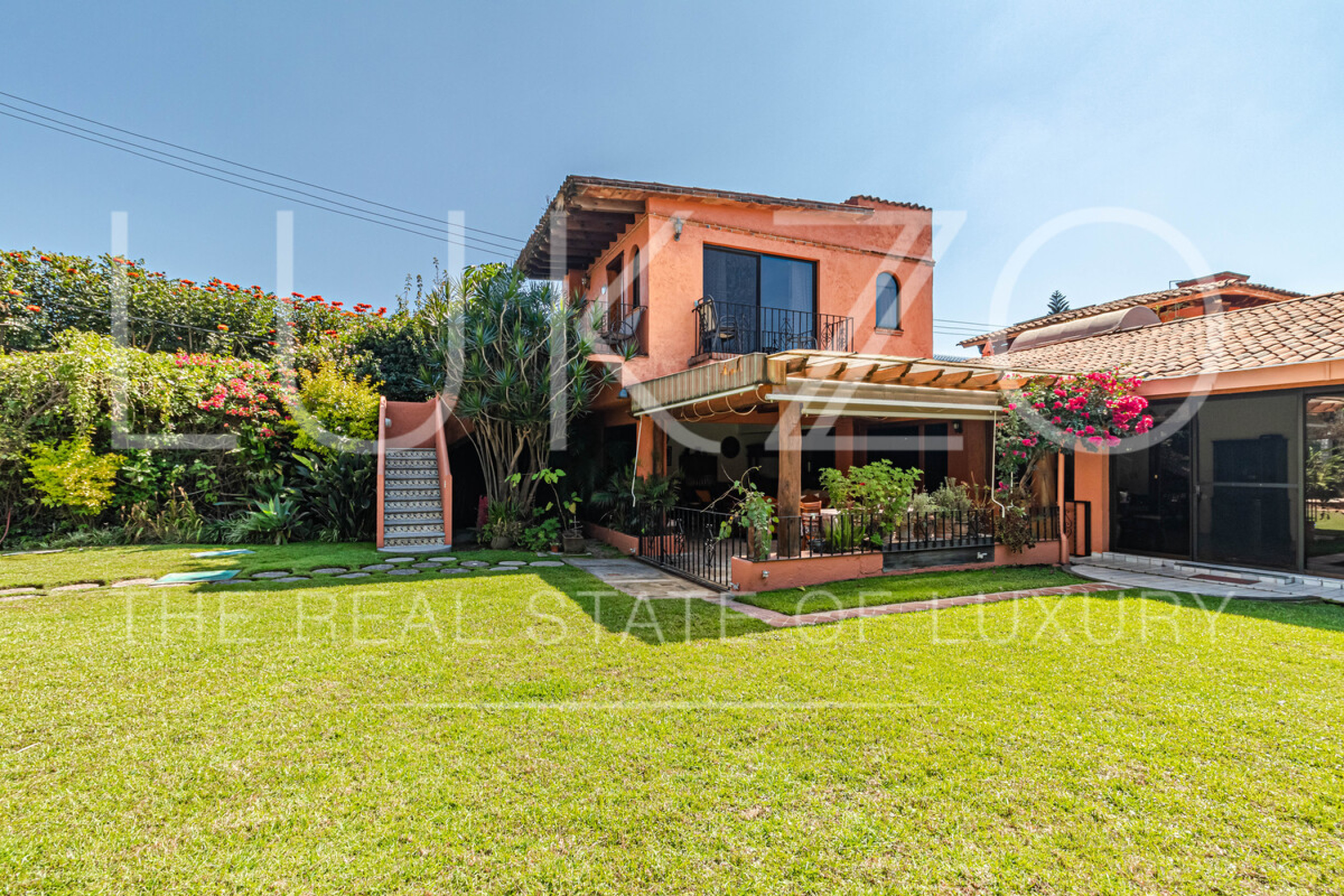 La segunda casa es de dos pisos con techos altos de ladrillo, pisos de mármol y de madera. Vitrales, frescos, y un jardín con fuente. En esta casa hay tres recámaras con baños completos. Terraza o sala al aire libre con chimenea con vista al jardín. Cuenta con cocina integral.