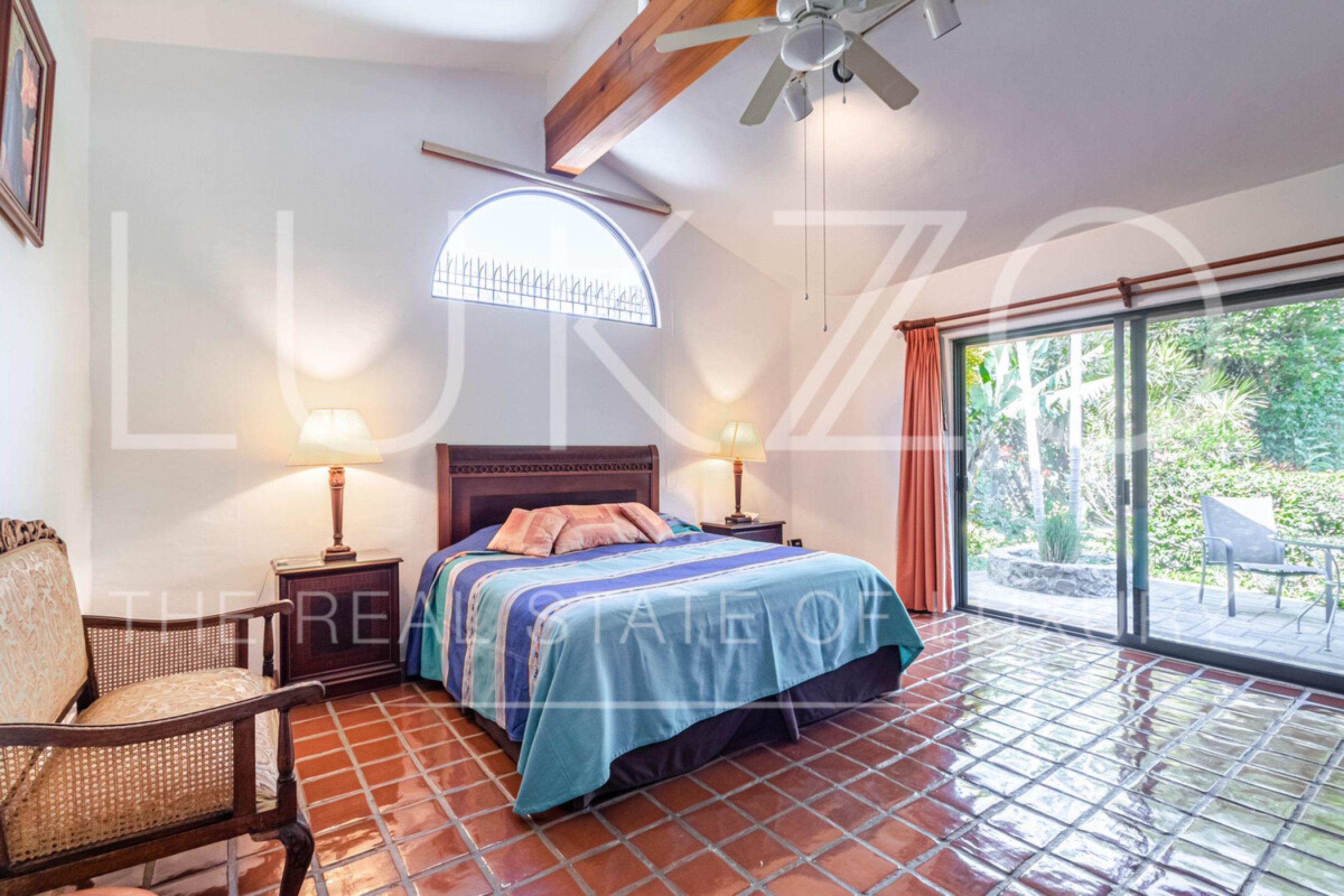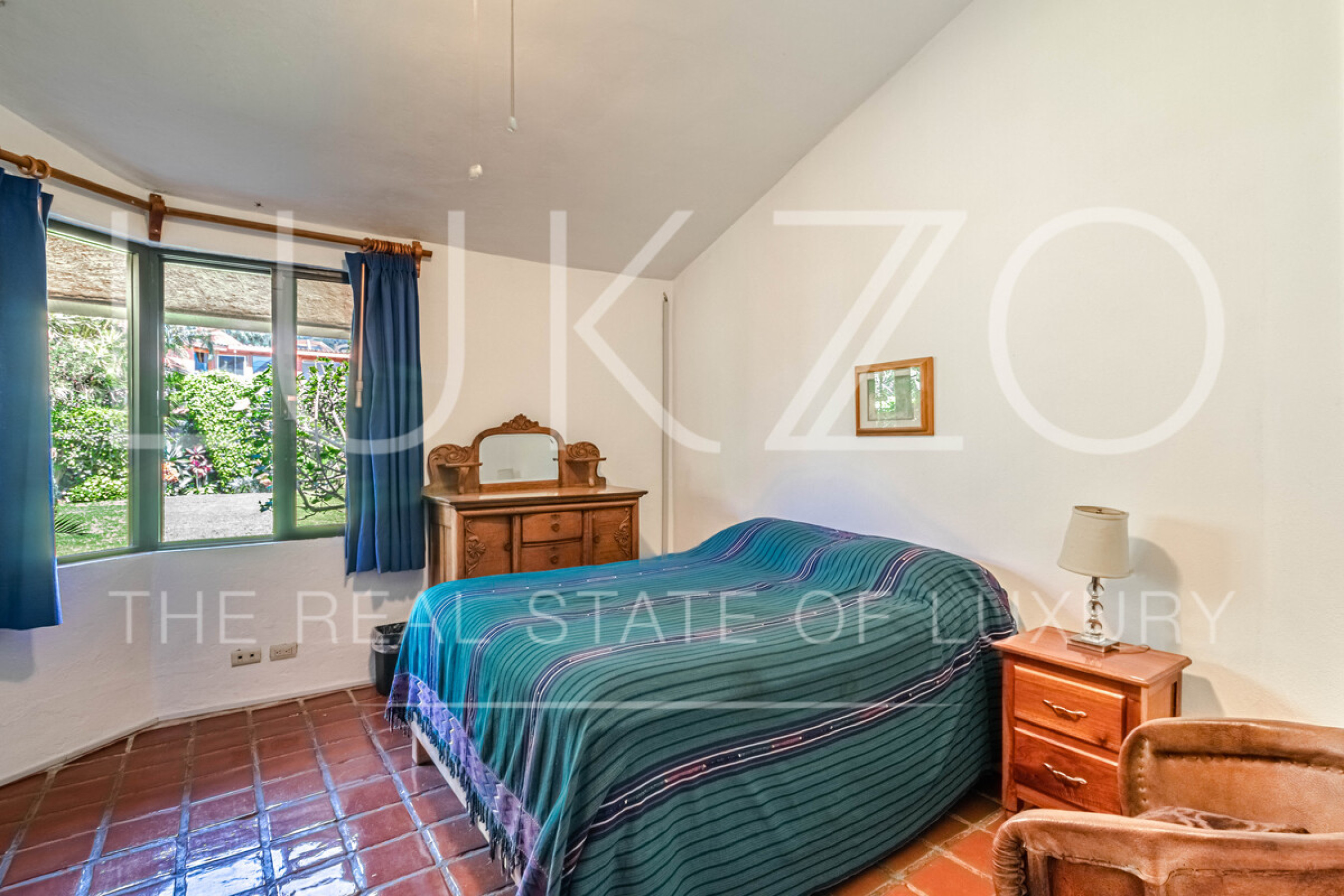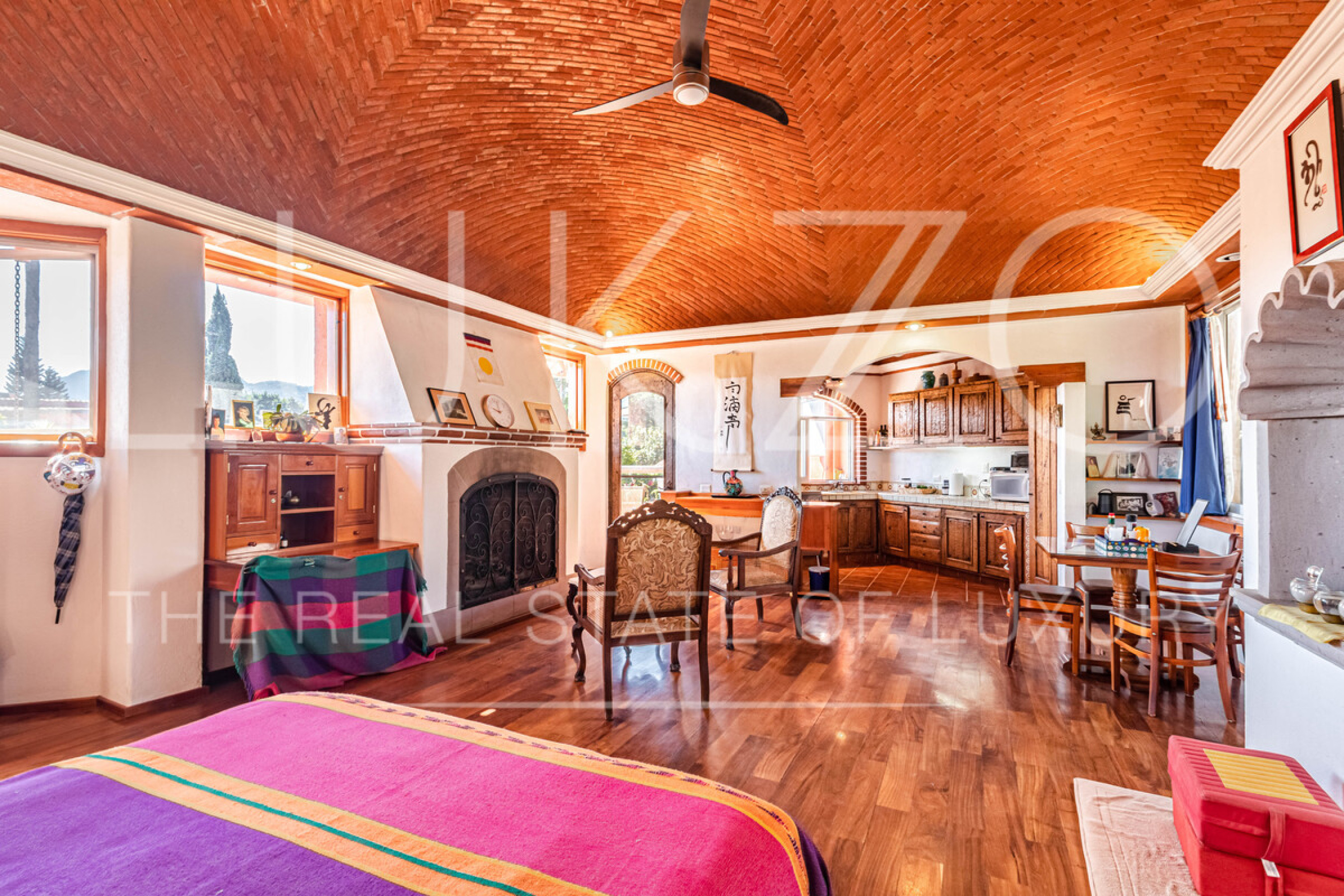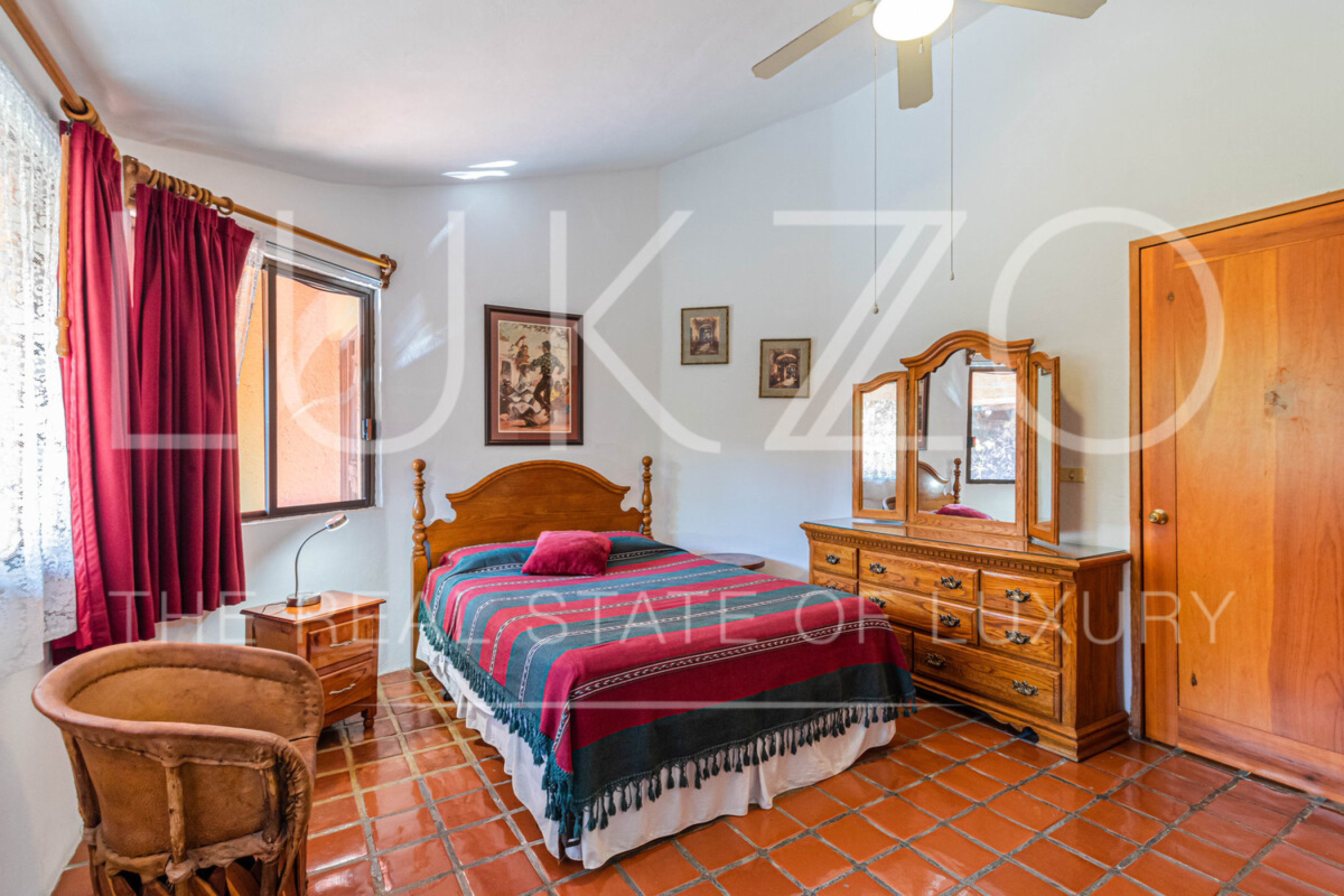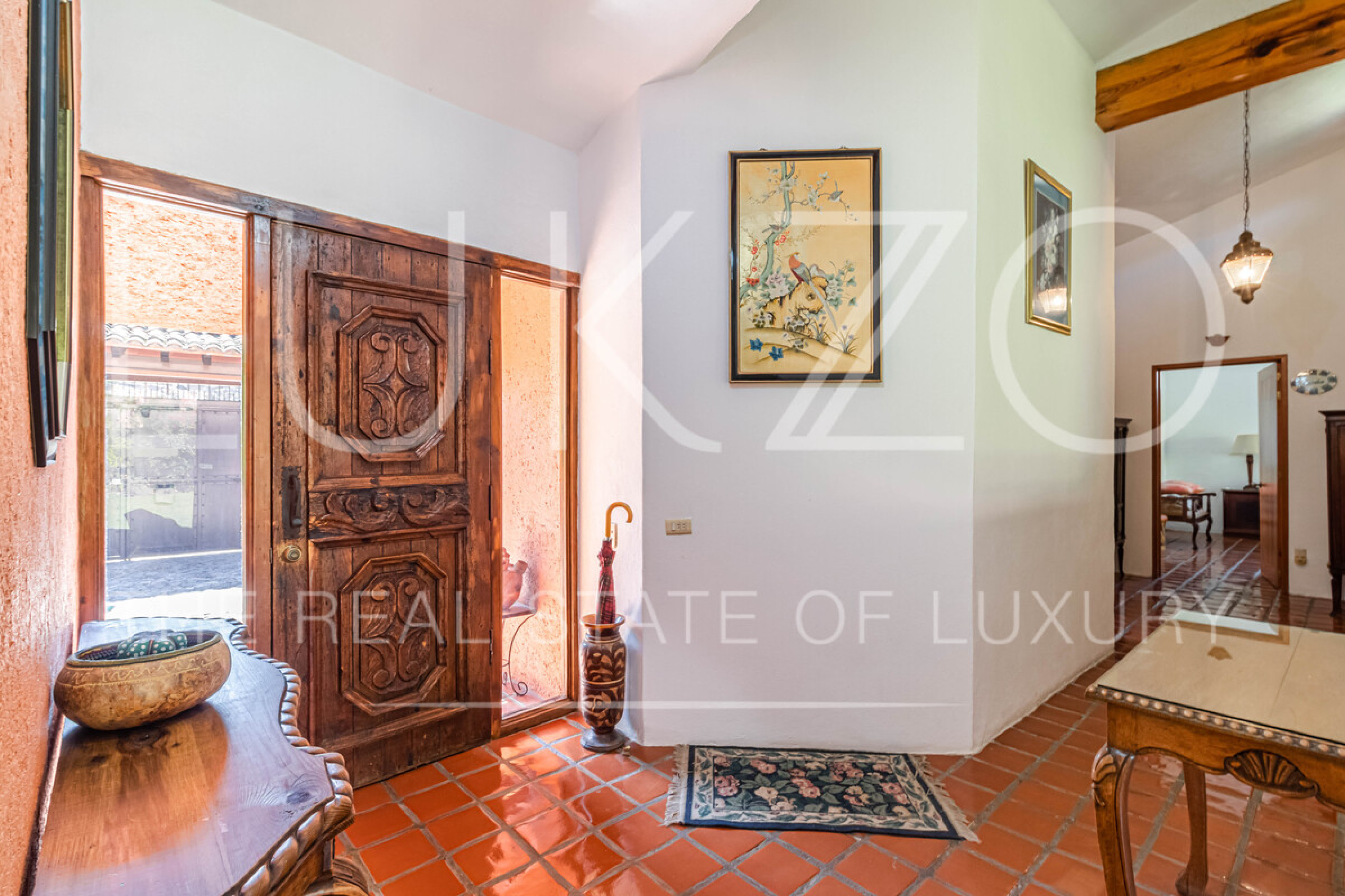 La segunda casa es de dos pisos con techos altos de ladrillo, pisos de mármol y de madera. Vitrales, frescos, y un jardín con fuente. En esta casa hay tres recámaras con baños completos. Terraza o sala al aire libre con chimenea con vista al jardín. Cuenta con cocina integral.