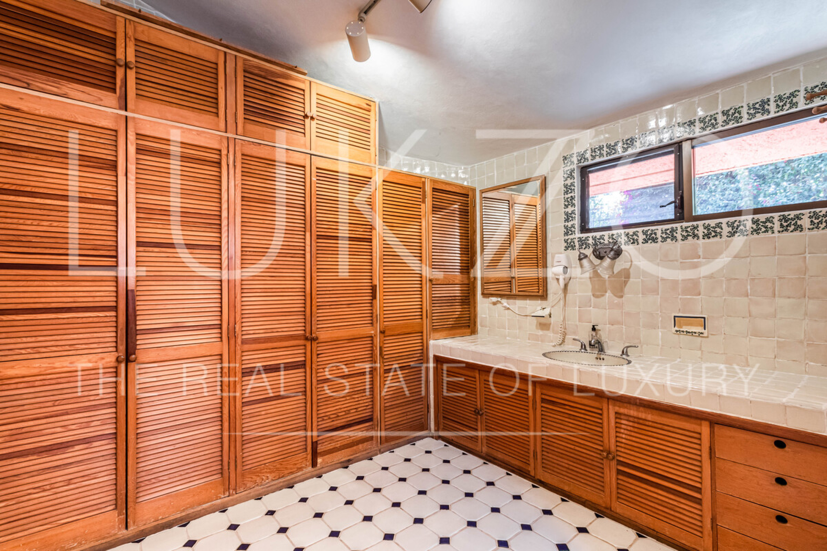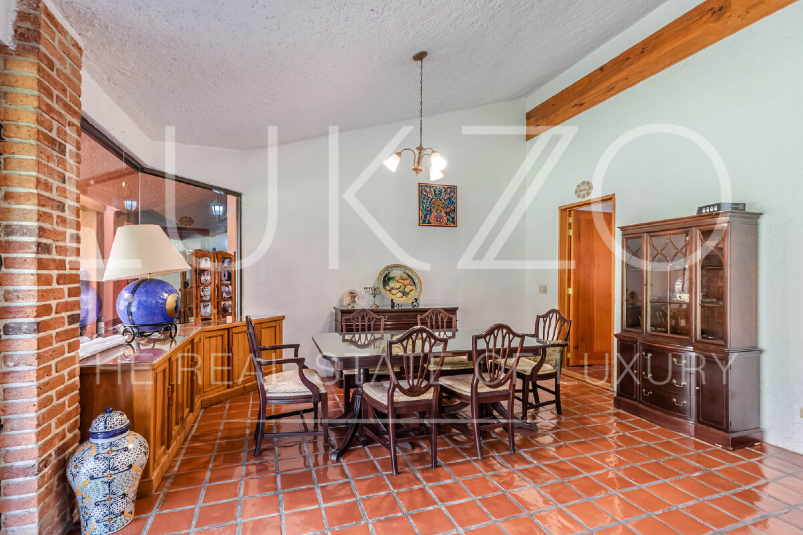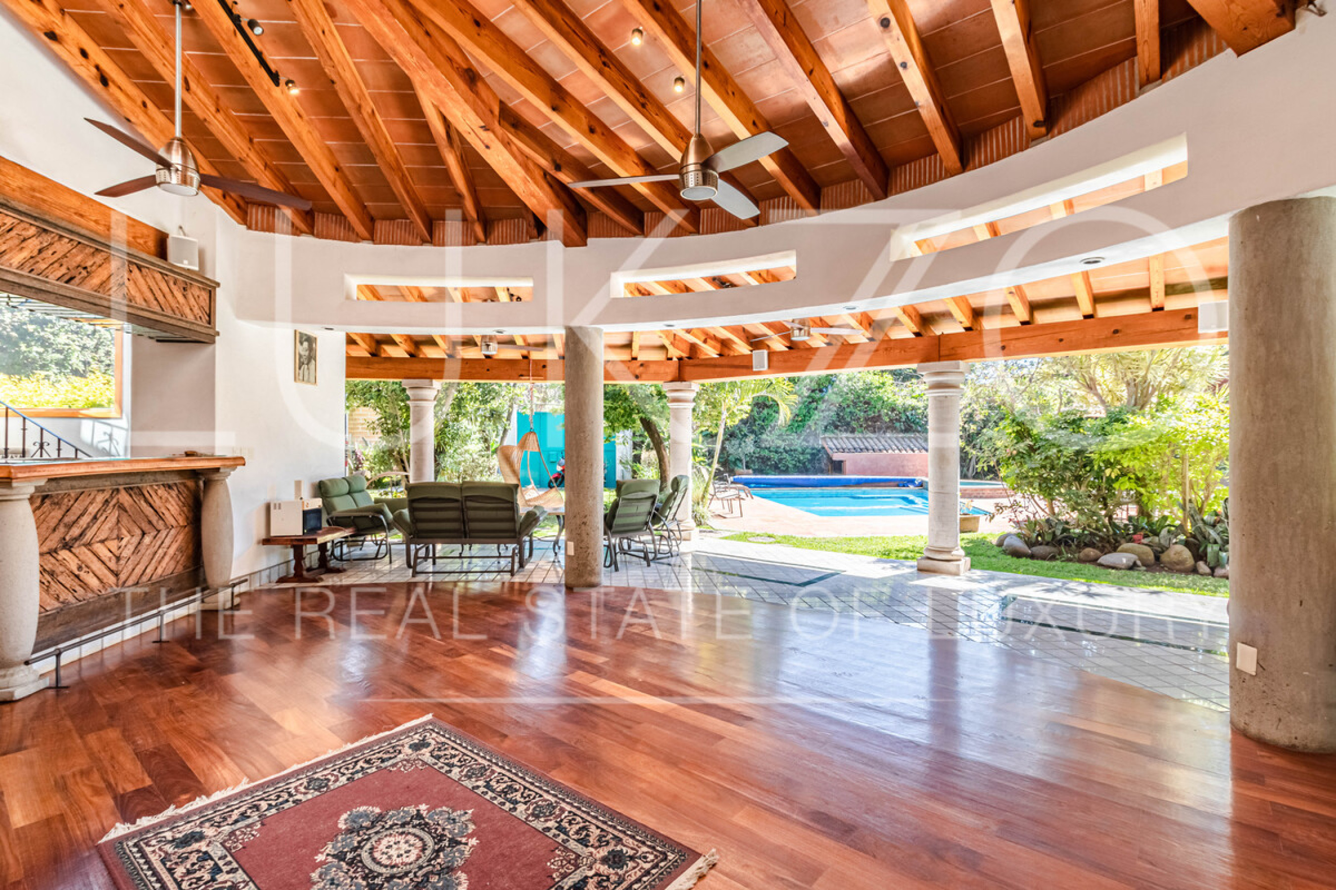 La casa principal tiene seis recámaras con baños privados completos y jacuzzi, área de descanso y terraza o comedor al aire libre. Cocina profesional para eventos y cocina integral. Medio baño de visitas.